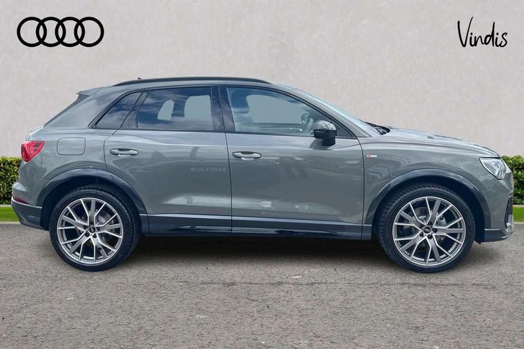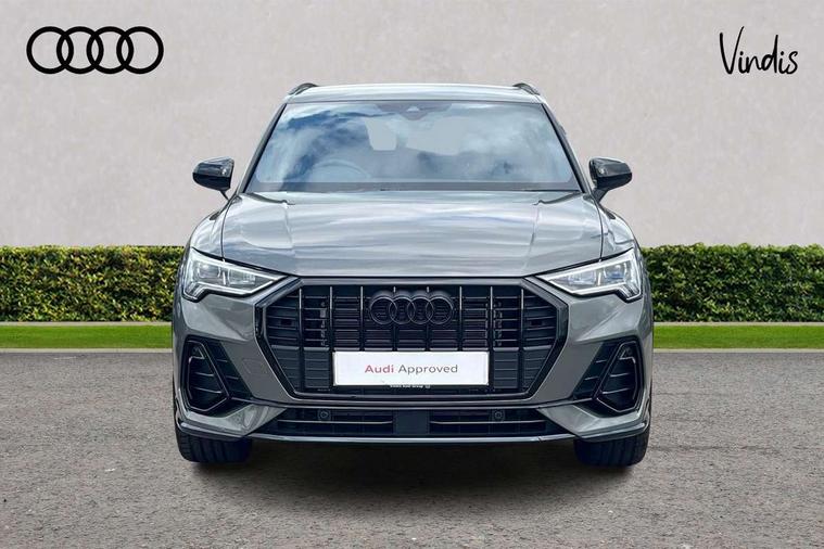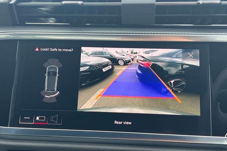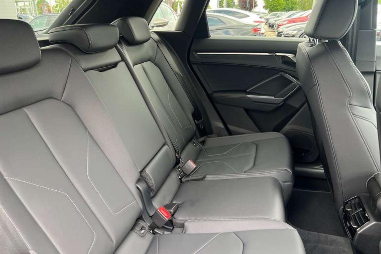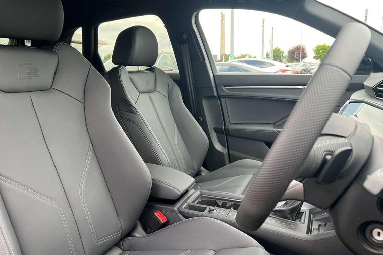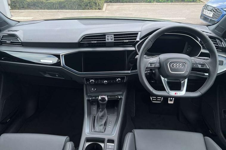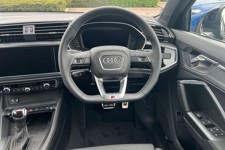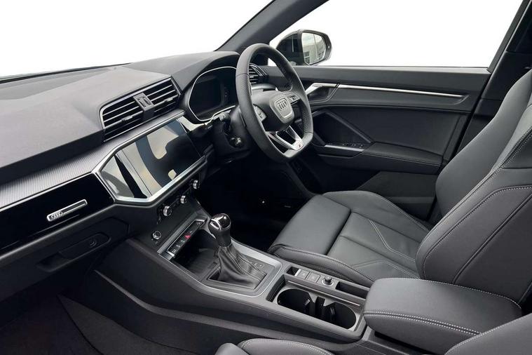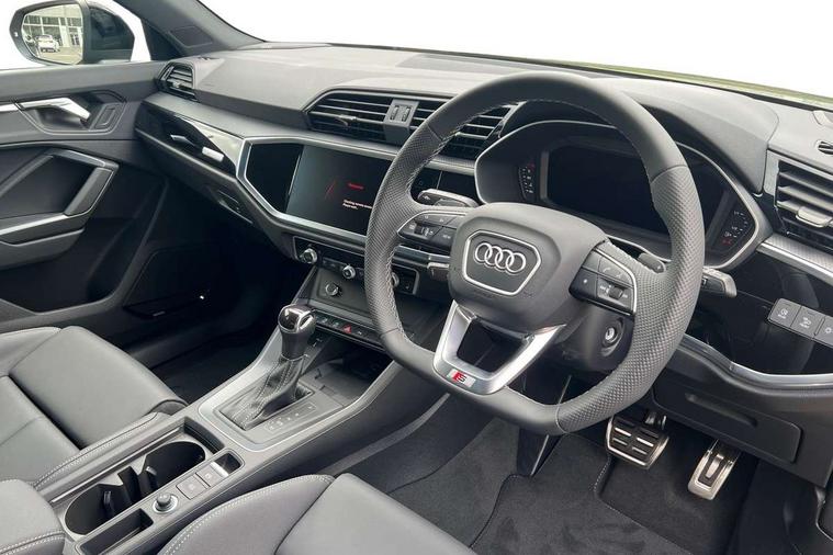 Amazon alexa Integration, Audi connect safety and service, Audi drive select, Audi lane departure warning, Audi Virtual Cockpit - 10.25" display, Bluetooth interface, Camera based traffic sign recognition, Distraction and Fatigue warning, Legal emergency call, MMI Navigation Plus with high resolution 10.1 inch touchscreen colour display, Power operated tailgate, Progressive steering, Service interval indicator, Smartphone interface includes wireless Apple carplay/Android Auto, Start stop system with recuperation, Voice control system with natural language interaction, Sports suspension, 2 USB-C ports with charge and data functions, 6 passive loudspeakers, DAB digital radio module, Acoustic windscreen, Audi Beam uses LEDs to project the Audi logo onto the ground as you exit your Q3, Auto dimming door mirrors, Auto dimming frameless rear view mirror, Black roof rails, Electrically folding, adjustable and heated door mirrors with integrated LED side indicators and kerb view function for passenger side, Front and rear electric windows, Front fog lights, Grille vertical bars in aluminium silver/Matt, High gloss black finish B and C pillars, LED Dynamic rear indicators, LED headlights with LED daytime running lights, LED rear lights, LED third brake light, Privacy glass dark tinted rear and rear-side windows (from B-pillar backwards), Rain and light sensors, Rear diffuser grille in grained matt black, Rear diffuser strip in matt anthracite black, Rear side wing doors, Rear wiper, S line bumpers in contrasting Manhattan grey, Variable front intermittent wipers, 12V socket in rear centre console, 3 seat bench in 2nd row, 40:20:40 folding with manual adjustment for 60:40 forwards/backwards position and backrest angle, Adjustable rear seat bench/backrest with centre armrest and cupholder, Black cloth headlining, Dual zone electronic climate control, Electric lumbar support, Front and rear black floor mats with contrast stitching in rock grey, Front and rear headrests, Front centre armrest, Height and reach adjustable steering wheel, Illuminated door sill trims with S logo, ISOFIX child seat mounting for front passenger with airbag deactivation and outer rear seat including top tether attachment point for outer rear seats, Manual front seats with height adjustment, Perforated leather gearknob, Single front passenger seat, Stainless steel luggage compartment sill finisher, Stainless steel pedals, Twin leather upholstery with front sport seats + S embossing, Black styling pack - Q3, Non smoking pack - Q3, 3x3 point rear seatbelts, 6 airbags - Driver, front passenger, curtain and side windows, Audi pre-sense front with pedestrain and cyclist recognition, Electrically operated child locks on rear doors, Electromechanical parking brake, Electronic stabilisation control including ABS, ASR and EDL, Front seatbelt reminder, Hill descent control, Hill hold assist, Pre sense basic, Seatbelt monitoring, Tyre pressure warning, Warning triangle and first aid kit, Anti theft wheel bolts, Immobiliser, Remote central locking, Thatcham approved category 1 anti theft alarm, Aluminium look interior elements, Detail dashboard around MMI touch colour display in glass look, black with surround in aluminium look, Leatherette door armrest, Piano black inlay,