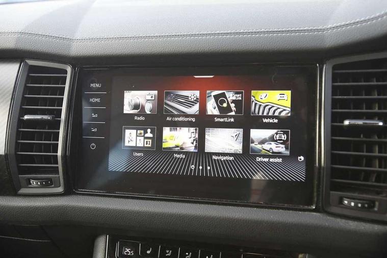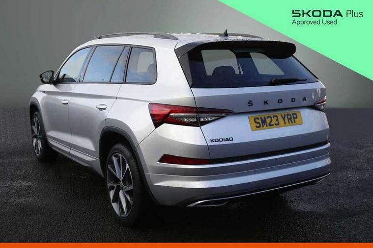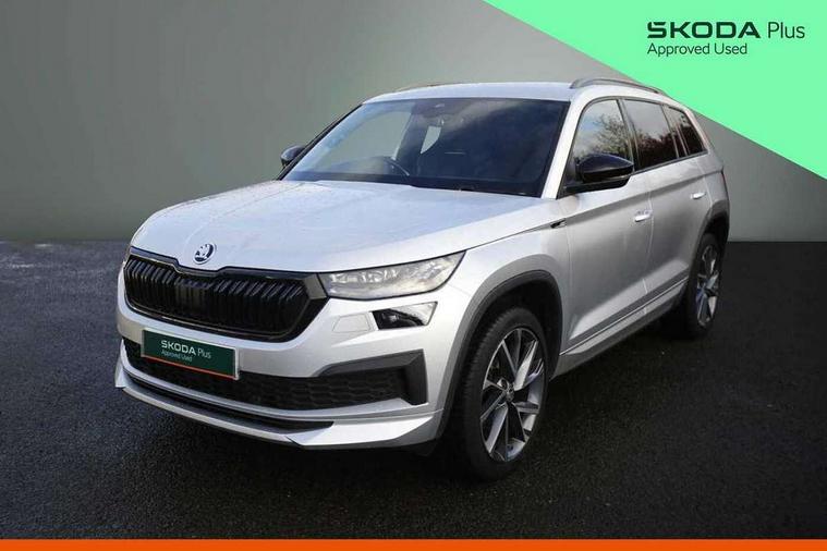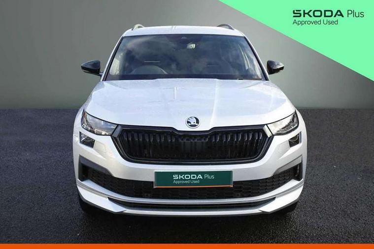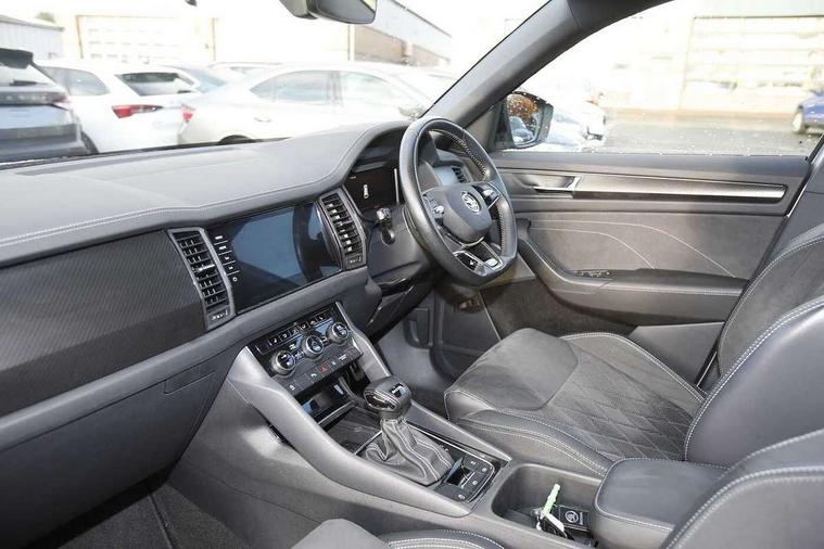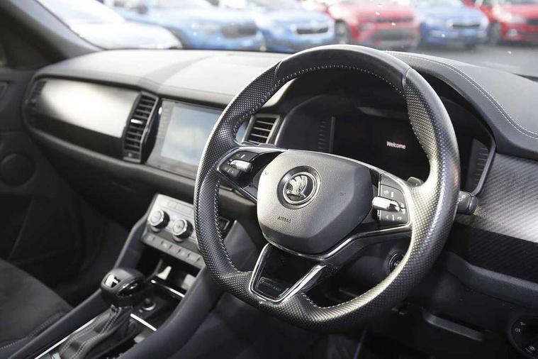 Bluetooth system, Columbus satellite navigation with 9.2" touchscreen, integrated Wi-Fi, web radio, Digital voice enhancement, e call+, ECO Stop/start function, Exterior temperature indicator, Progressive steering, Rear view camera, Smartlink wireless for apple carplay and wired for android auto, Speed limiter, Tailgate unlocking from outside, USB C Port x 2 in front centre console, Virtual Cockpit - 10.25" digital display with additional sports design, Wireless charging, 8 Speakers, DAB Digital radio, Aero front windscreen wipers with intermittent function, Aero rear window wiper, Auto dimming rear view mirror, Black roof rails, Black sports styling including front grille and window surrounds, Black wheel arch surrounds, Body colour bumpers, Body colour door handles, Electric adjustable/heated/folding door mirrors, driver side auto dimming with boarding sports and memory function, Electric front and rear windows, Extended rear spoiler with finlets in gloss black, Front fog lights, Full LED matrix headlights with AFS (adaptive front light system), cornering function and AWL (all weather lighting system), Gloss black door mirrors, Headlight washers, Heated rear window, Invisible tailpipe, LED daytime running lights, LED rear fog light, LED third brake light in rear spoiler, Light assistant (coming/leaving home/tunnel light), Off-road style lower front bumper element, Privacy glass, Rain and light sensors, Rear diffuser, Rear LED lights (high functionality) with welcome effect and dynamic indicators, Rear side wing doors, Safety reflectors on front and rear doors, Sportline badge on front fender, Sports front and rear bumpers including lower rear chrome strip, Tailgate lettering in Black, Window control switches with black trim, 12V socket in boot, 2 rails with 2 hooks, 2 seat bench in 3rd row, 3 seat bench in 2nd row, 3 spoke leather multifunction sports steering wheel with DSG paddles, 4 foldable roof handles with rear coat hooks, 60:40 foldable rear seat with sliding adjustment and backrest angle adjustment, Aluminium pedals, Black roof headlining, Bottle holders in door panel in the 1.5 litre front and 1 litre rear, Cargo storage compartments, Chrome headlight control button, Chrome interior door handles, Coat hooks on B pillar, Covered storage compartment on driver side, Decorative door sill covers, Front and rear door armrest with black adductor trim, Front centre armrest with storage compartment, cup holder and 12V socket, Front courtesy lights, Gear shift lever with chrome frame and black gloss insert, Grey stitching in front and rear armrests and door armrests + door inserts, Height adjustable front headrests, Illuminated glovebox, Illuminated luggage compartment, Isofix child seat fittings in outer rear seats with top tether, Manually adjustable steering column, Microsuede door panels, Net programme in boot (1x horizontal Net, 2x vertical Nets), Overhead glasses storage compartment, Pollen filter, Rear centre armrest with cupholders, Single front passenger seat, Sliding trunk cover, Small Bags on the inner sides of the front backrests, Sports seats, Sunvisors with illuminated vanity mirrors, Three rear height adjustable headrests, Ticket holder on A Pillar, Umbrella in door panel, Variable boot floor, LED Interior light pack - Kodiaq, Auto door release and activation of warning lights in the event of an accident, Driver and front passenger airbag with knee airbag and front passenger airbag deactivation, Electronic parking brake with hill start assist, Emergency rear braking signal, ESC (incl. ABS+MSR+ASR+EDS+HBA+DSR+RBS+MKB), Front assist with autonomous emergency braking, Front side airbags with curtain airbags, Fuel cut off safety device, Height adjustable front 3 point seatbelts + pretensioners, Hill hold control, Rear disc brakes, Safety vest holder in door, Seat belt reminder for all seats, Three point rear seat belts, Two tone horn, Tyre pressure monitor, Alarm with interior monitoring and tilt sensor with safe function, Anti-theft wheel bolts, Immobiliser, Keyless entry and start system (KESSY), Remote central locking with 2 keys, Black air vent surround, Carbon finish dashboard and door inserts, Grey stitching in dashboard, 20" Vega Anthracite alloy wheels, Temporary spare wheel (space saver),