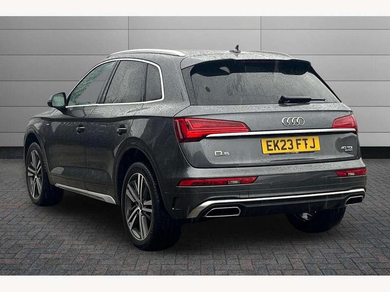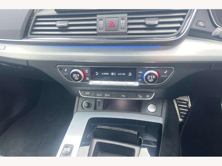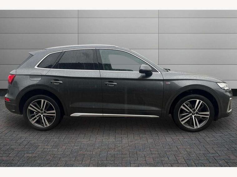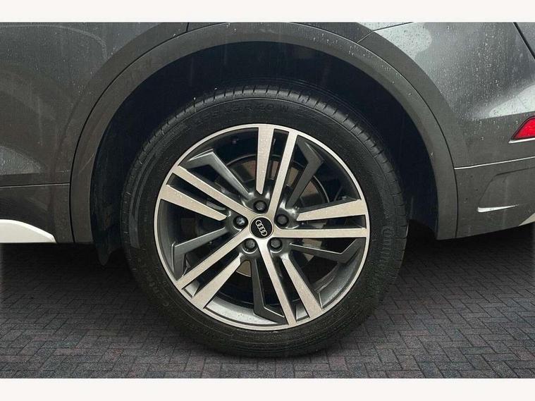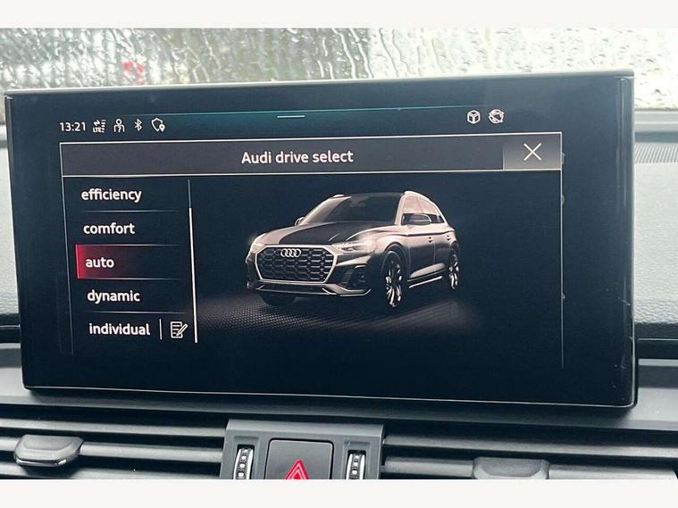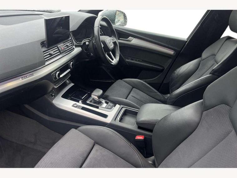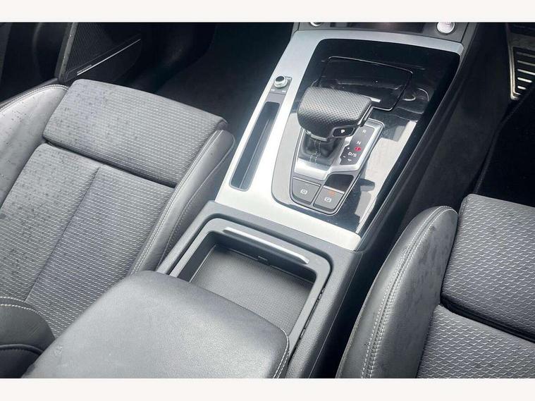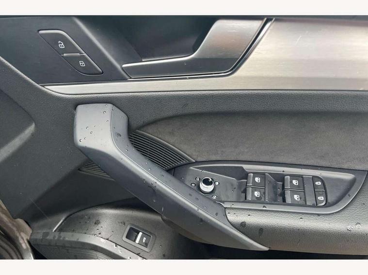 Acoustic front and rear parking sensor, Audi connect safety and service (e-call), Audi connect with Amazon Alexa Integration, Audi drive select, Audi virtual cockpit plus with 12.3" screen and three different layout designs, Audi wireless smartphone interface, Automatic start-stop system with coasting functionality and efficiency programme, Bluetooth interface, Electro - mechanical power assisted steering, MMI navigation plus with 10.1" touch screen, Power tailgate, Reversing camera, Service interval indicator, Voice control system with Audi hotword activation "Hey Audi", Diesel particulate filter, Quattro on demand, S line sports suspension, 2 x USB charging port with aux input socket, 8 loudspeakers, DAB Digital radio, Acoustic windscreen, Aluminium roof rails, Audi matrix LED headlights with dynamic front and rear indicators, Auto dimming door mirrors, Auto dimming frameless rear view mirror, Automatic headlight adjustment, Automatic headlights and windscreen wipers, Body colour bumpers, Body colour door mirrors, Body colour rear diffuser with matt aluminium silver surrounds, Body colour underbody protection, Chrome plated exhaust trims, Daytime running lights, Door sills in Selenite silver, Electric adjustable/heated/folding door mirrors, Front air inlet surrounds in aluminium, Front and rear electric windows, Front radiator grille in honeycomb design, Headlight washers, High level LED brake light, Lower bumpers painted in contrast Manhattan grey, Rear chrome trim strip below lights, Rear privacy glass and rear side windows, Rear side wing doors, Rear wiper, Roof bars, S Line badges on the front wings, S Line front and rear bumpers, S Line rear spoiler, S Line side skirts, 3 rear headrests, 3 spoke leather multifunction steering wheel with S badging perforated leather grips, 40:20:40 split folding 3 rear bench seat in 2nd row with rear centre armrest, Black cloth headlining, Comfort front centre armrest, Contrast stitching on seats, steering wheel and gear lever gaiter, Deluxe 3 zone electronic climate control, Front/rear floor mats, Gear lever in black leather, Heated front seats, Height adjustable front head restraints, Height/reach adjustable steering column, Illuminated door sill trims with S logo, Luggage compartment cover, Manual seat adjustment with 4-way electric lumbar support, Removable luggage compartment floor, Single front passenger seat, Stainless steel pedals, Sunvisors with vanity mirrors, High gloss pack - Q5, LED interior light pack - Q5, 3 point seatbelts on all seats, 6 airbags - Driver, front passenger, curtain and side airbags, Electrically operated child locks on rear doors, Electromechanical parking brake, Electronic stabilisation control including ABS, ASR and EDL, First aid kit with warning triangle and vests, Front passenger airbag deactivation, Hill descent control, Hill hold assist, ISOFIX child seat mounting for front passenger seat and ISOFIX child seat mounting with Top Tether for outer rear seats, Multi collision brake assist, Pop-up bonnet for pedestrian protection, Pre sense city, Seat belt force limiter, Seatbelt monitoring, Tyre pressure warning, Anti theft alarm, Anti-theft wheel bolts, Keyless Go access/ignition system, Remote central locking, Air vents inserts and centre console in gloss black, Matt brushed aluminium inlays,