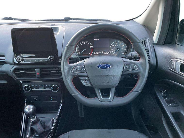 Cruise control, e-Call (emergency call), Easy fuel capless refuelling system, Ford SYNC 3 nav system with DAB radio, 8" screen, emergency assistance, Apple car play/Android auto, 2x USB, 6 speakers, Ford pass connect, Intelligent speed limiter, PAS, Rear parking sensors, Rear view camera, Traffic sign recognition, Trip computer, Sports suspension, Steering wheel mounted audio controls, Auto dimming rear view mirror, Automatic front wipers, Automatic headlights, Black roof rails, Body colour door handles, Body coloured bumpers, Chrome lower window surround, Electrically adjustable and heated door mirrors, Front fog lights, Front grille bars and surround in black, Headlight levelling control, Large rear roof spoiler, LED day running lights, LED third brake light, Power front and rear windows, Puddle lights, Quick-clear heated windscreen, Rear side wing doors, Rear wiper, ST Line body styling kit - Black headlamp bezel, front and rear sport bumpers, body colour lower door claddings, 12V socket in front and rear, 3 seat bench in 2nd row, 60/40 split rear seats, Ambient lighting, Centre console with sliding front armrest, Cooled glovebox, Courtesy lights with map reading light, Driver seat height/lumbar adjust, Driver's side glovebox, Driver/passenger sunvisors and lidded vanity mirrors, EATC - Electronic Auto Temperature control, Folding grab handles, Front head restraints, Front seat back map pockets, Illuminated glovebox, Illuminated luggage compartment, Isofix system on outer rear seats, Luggage compartment carpet, Neosuede/Partial sensico leather upholstery, Overhead console with sunglasses holder, Rake adjustable rear seats, Reach + rake adjustable steering column, Rear headrests, Sensico trimmed steering wheel, handbrake and gearshift gaiter with red stitching, Single front passenger seat, ST-Line Front floor mats with red stitching, Stainless steel sports pedals, Storage drawers under front seats, Tie down hooks, Variable boot floor, 3x3 point rear seatbelts, ABS, Autonomous emergency braking, Child locks on rear doors, Curtain airbags, Driver airbag, Drivers knee airbag, Electronic Stability Programme with hill launch assist, Front passenger airbag deactivation, Front side airbags, Passenger airbag, Pre collision assist system with AEB, Seatbelt reminder for driver and front passenger, Traction control, Tyre pressure monitoring system, Immobiliser, MyKey system, Remote central locking, Thatcham 1 volume sensing alarm, Low rolling resistance tyres, Tyre inflation kit,