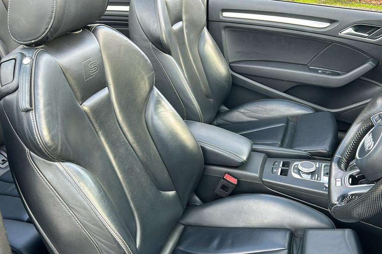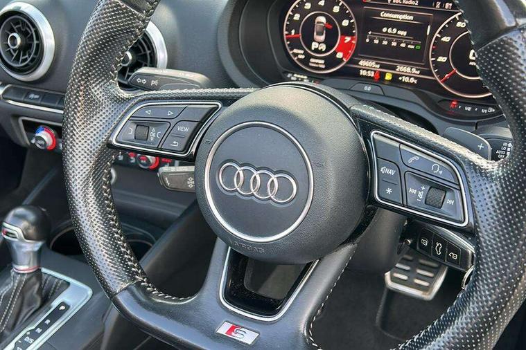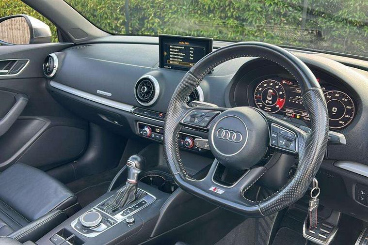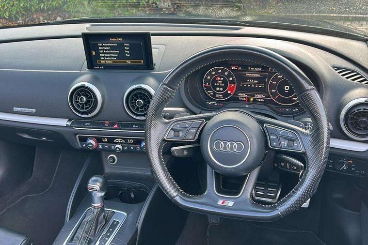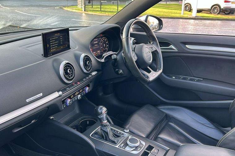 Audi connect, Audi smartphone interface, Bluetooth interface, Colour driver's information system display, Progressive power assisted steering, Rear parking sensors, Service interval indicator, Audi magnetic ride, S sports suspension, 2 USB ports, Audi music interface, DAB Digital radio, Aluminium door mirror housings, Aluminium side window trim, Automatic lights and wipers, Body colour bumpers, Electric operated/heated door mirrors, Front and rear electric windows, Fully automatic acoustic hood, Headlight washers, Heated front windscreen, Heated rear window, Heated windscreen washer jets, LED daytime running lights, Platinum grey radiator grille with double chrome bars, S body styling, Twin oval chrome trimmed exhaust tailpipes, 2 height adjustable rear headrests, 3 spoke flat bottom multi-function leather steering wheel including paddle shift, 4 lashing points to secure luggage, 50/50 split folding rear seat, Adjustable front armrest, Driver/passenger sunvisors, Dual zone electronic climate control, Front/rear floor mats, Heated front seats, Height adjustable front seats, Height/reach adjustable steering column, Illuminated door sills, Illuminated glovebox, ISOFIX child seat preparation+airbag deactivation, Jack and tool kit, Perforated leather gearknob, Stainless steel pedals, Storage compartment in centre console, Storage compartments in doors, LED interior light pack - A3/RS3, Light and rain sensor pack - A3 Cabriolet, Storage pack - A3 Cabriolet/Saloon, 3 point seatbelts on all seats, ABS/EBD, Active bonnet, Active front headrests, ASR, Automatic roll over protection, Driver and passenger side airbags, Driver/Front Passenger airbags, Drivers knee airbag, EDL, Electromechanical parking brake, ESC - Electronic Stability Control + traction control, Front passenger airbag deactivation, Seatbelt warning, Tyre pressure monitor, Warning triangle and first aid kit, Anti theft alarm, Anti-theft wheel bolts, Immobiliser, Remote control central locking, Aluminium air vent surrounds, Aluminium trim elements, Tyre repair kit,