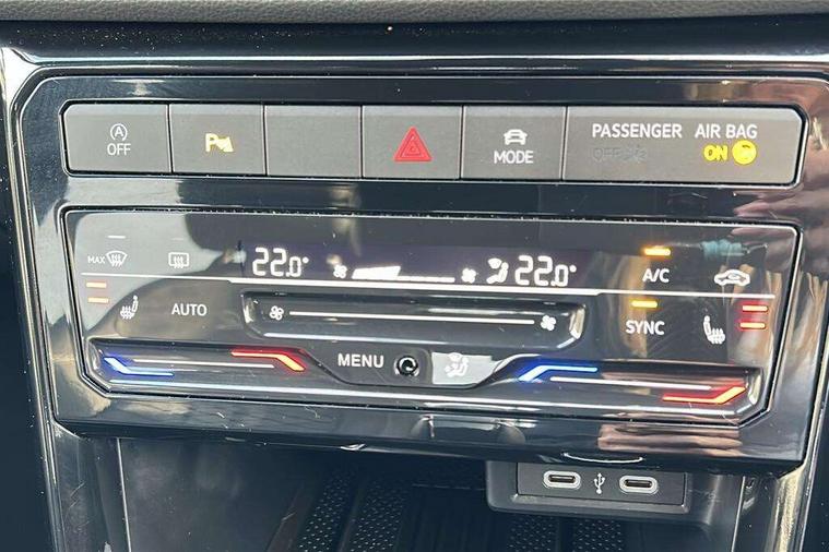 'Lights On' Reminder warning buzzer, 10.25" Digital cockpit pro, Advanced driver attention and drowsiness monitor, Car information display, Driver profile selection including ECO function, Dynamic road sign display, E-Sim card for online connectivity, eCall emergency call system, Front and rear parking sensors, Front assist, forward collision warning, autonomous emergency braking and speed limiter, Low washer fluid warning light, Multifunction computer with visual gear change recommendation for fuel consumption, Multifunction front facing camera for distance control, Operating permit alteration, Power assisted steering, Predictive adaptive cruise control, Preparation for navigation system with media and internet package, Preparation for We connect and We connect plus, Semi-automated driving assistance, travel assist including lane keeping system Lane Assist and emergency assisst, Side assist, Speedo, rev counter, electronic odometer, trip, service interval display, exterior temperature and fuel gauge, Warning sound and light for doors and tailgate open, Warning sound and light for front seatbelts unfastened, Wireless Car net app connect with Apple CarPlay, combined functionality of Apple CarPlay/Android Auto and MirrorLink, Wireless charging, Misfuel prevention device, Start-stop system with battery regeneration (recuperation - energy recovery during braking), 2 USB C ports in front, 2 USB charging sockets on the centre console in the rear charging capacity upto 45W, Diversity antenna for FM reception, Music playback - MP3, WMA and AAC files, Radio, Automatic dimming interior rear view mirror, Automatic hazard lights activation under emergency braking, Automatic headlight control with LED separate daytime running light and coming home and leaving home feature, Body colour door handles, Body coloured bumpers, Dynamic headlight range control with self adjusting whilst driving, Electric folding door mirror, adjustable, heated with front passenger exterior mirror lowering function, Exterior mirrors convex on the left and aspherical on the right, Front and rear electric windows, Front door sill protectors with R-Line logo, Galvanised body, Heat insulating and laminated safety glass windshield, Heat insulating darkened glass in side and rear windows, High Beam Assist, automatic sensing for switching between dipped and main beam, LED rear combination lights, LED third brake light, Lower door sills and door pillars in black, Rain sensor, Rear fog light on one side, reversing light on both sides, Rear side wing doors, Rear window aerial, Rear window wiper with intermittent control, Reflectors in all doors, Scuff plates, Tailgate with integrated roof spoiler, 12V Accessory socket in centre console, 2 Front and rear reading lights incorporating LED technology, 3 rear head restraints, 3 seat bench in 2nd row, 60/40 split folding rear seat backrest, Air care climatronic 2 zone air conditioning system, Ambient lighting, Brushed stainless steel pedals, Chrome plated radiator grille inserts, air vent surrounds and light switch surrounds, Cloth upholstery, Comfort front sport seats, Door and side trim panel, Driver and front passenger sunvisor with vanity mirror, Dust and pollen filter, Front + rear carpet mats, Front centre armrest with storage compartment, Front footwell illumination, Front seat back storage pockets, Glove compartment door with light, Heated front seats, Heating and fresh air system with 4 stage blower, Height/reach adjust steering wheel, Instrument lighting white adjustable panel illumination, Interior light with switch off delay and dimmer, Isofix anchors for child seats on outer rear seats and front passenger seats, Leather gearshift handle, Leather wrapped multifunction steering wheel, Luggage compartment floor, Luggage compartment lighting, Manual front seats with height adjustment, Padded dashboard, Removable luggage compartment cover, Single front passenger seat, Storage compartment in drivers and front passengers door, Titanium black roof lining, Unsplit sliding rear seat bench, Without drawers under front seats, 3 point outer rear seat belts with ECE label, 3 Point seatbelt for centre rear seat, Anti-lock Braking System (ABS) with Hydraulic Brake Assist (HBA), Automatic post collision braking system, Disc brakes in front, Disc brakes in rear, Driver and front passenger safety-optimised head restraints, Drivers and Front Passengers airbags with front passengers airbag deactivation switch, ESC with EDL and ASR (traction control), Extended and predictive pedestrian/cyclist protection, Front and rear passenger curtain airbag system including front side airbags, Height adjustable front 3 point seatbelts + pretensioners, Hill start assist, Pre crash preventive occupant protection, Proactive passenger protection system in combination with front assist, Rear door child safety locks, Rigid safety cell with front and rear crumple zones, Single tone horn, Tyre pressure loss indicator, Volkswagen roadside assistance, Alarm with interior protection, Anti theft alarm system, Electronic engine immobiliser, Remote tailgate unlocking using key fob, Titanium Black Decorative inserts - R Line, Low rolling resistance tyres,