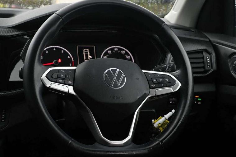 'Lights On' Reminder warning buzzer, Adaptive cruise control including front assist, forward collision warning, autonomous emergency braking, speed limiter, Blind spot monitoring, Bluetooth telephone and audio connection for compatible devices, Car information display, Driver alert system, eCall emergency call system, Lane assist, Low washer fluid warning light, Multifunction computer with visual gear change recommendation for fuel consumption, Operating permit alteration, Power assisted speed sensitive steering, Speedo, rev counter, electronic odometer, trip, service interval display, exterior temperature and fuel gauge, Stop/start system, Warning sound and light for doors and tailgate open, Warning sound and light for front seatbelts unfastened, We Connect Go Dongle, Wireless Car net app connect with Apple CarPlay, combined functionality of Apple CarPlay/Android Auto and MirrorLink, Battery regeneration during braking, Misfuel prevention device, 2x USB connection with USB charging sockets and in rear centre console, DAB Digital radio receiver, Diversity antenna for FM reception, Multi device interface (MDI) with USB connection, Music playback - MP3, WMA and AAC files, Premium USB cable for Apple or Android smartphone compatibility, Simultaneous pairing of 2 compatible mobile devices, Title and cover art display, Automatic hazard lights activation under emergency braking, Black roof rails, Body colour door handles, Body colour door mirrors with integrated indicators, Body coloured bumpers, Dusk sensor + automatic driving lights, Electrically foldable, adjustable and heated door mirrors with reverse activated kerb view adjustment on passenger's side, Front and rear electric windows, Front fog lights with static cornering function, Galvanised body, Heated rear window, LED third brake light, Lower door sills and door pillars in black, Radiator grille with high gloss surface and chrome strip, Rear fog light on one side, reversing light on both sides, Rear lights incorporating LED technology, Rear side wing doors, Rear window aerial, Rear windscreen washer and wiper with interval delay, Reflectors in all doors, Tailgate with integrated roof spoiler, Windscreen wipers/ intermittent wipe + 4 position delay, 12V Accessory socket in centre console, 3 rear head restraints and 3 rear three point seat belts with ECE label, 3 seat bench in 2nd row, 60/40 split folding rear seat backrest, Drawer under drivers seat, Driver and front passenger sunvisor with vanity mirror, Driver's sunvisor with ticket holder, Dust and pollen filter, Front and rear reading lights X 2, Front centre armrest with storage compartment, Front seat back storage pockets, Front seats with adjustable lumbar support, Glovebox, Heating and fresh air system with 4 stage blower, Height/reach adjust steering wheel, Instrument lighting white adjustable panel illumination, Interior light with delay, Isofix child seat preparation for 2 rear child seats, Luggage compartment cover, Luggage compartment lighting, Manual air conditioning, Manual front seats with height adjustment, Moveable and foldable Rear bench seat, Single front passenger seat, Storage compartment in drivers and front passengers door, Three spoke multi-function leather trimmed steering wheel and gearknob, Triangle ties/pearl cloth upholstery, Variable boot floor, Anti-lock Braking System (ABS) with Hydraulic Brake Assist (HBA), Automatic post collision braking system, Driver and front passenger safety-optimised head restraints, Drivers and Front Passengers airbags with front passengers airbag deactivation switch, ESC with EDL, ASR, EDTC and trailer stabilisation function, Extended and proactive pedestrian protection, Front and rear curtain airbags, Front seat side impact airbags, Height adjustable 3 point automatic front seatbelts with pretensioners, Hill start assist, Pre crash preventive occupant protection, Rear door child safety locks, Rigid safety cell with front and rear crumple zones, Single torn horn, Tyre pressure loss indicator, Volkswagen roadside assistance, Alarm with interior protection and deactivation via infotainment system, Child security locks in rear doors, Electronic engine immobiliser, Remote tailgate unlocking using key fob, Pineapple decorative inserts in dash and doors, 17" Clayton alloy wheels + anti theft wheel bolts, Breakdown kit,