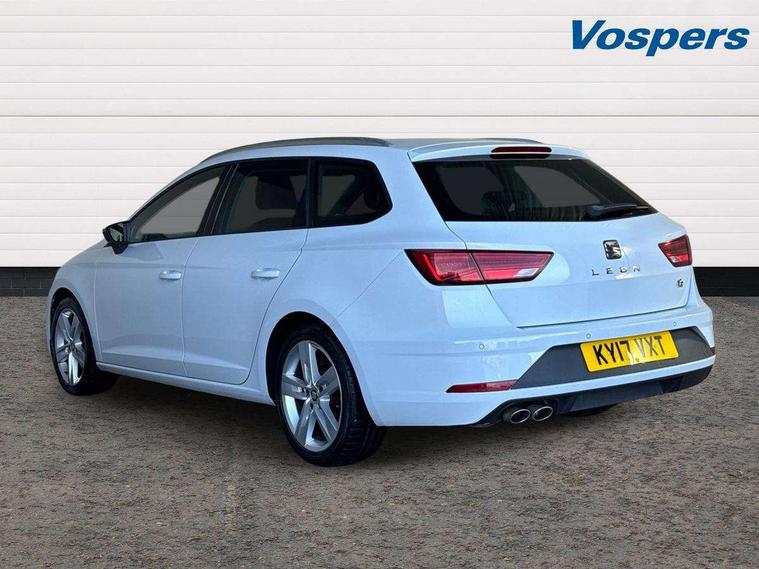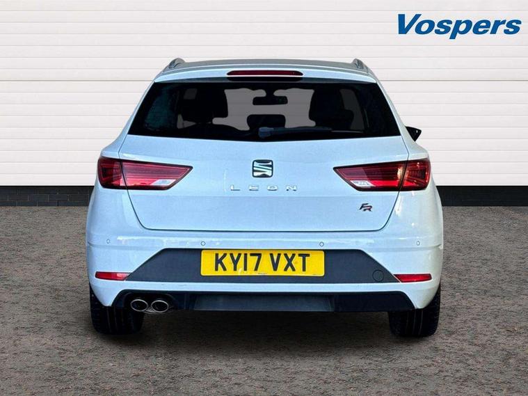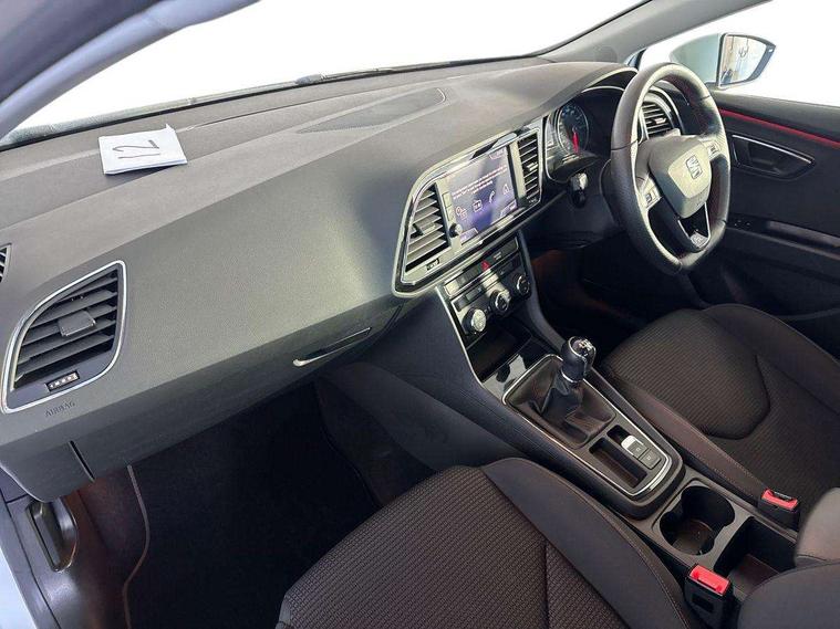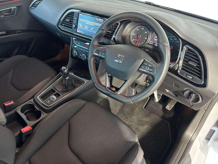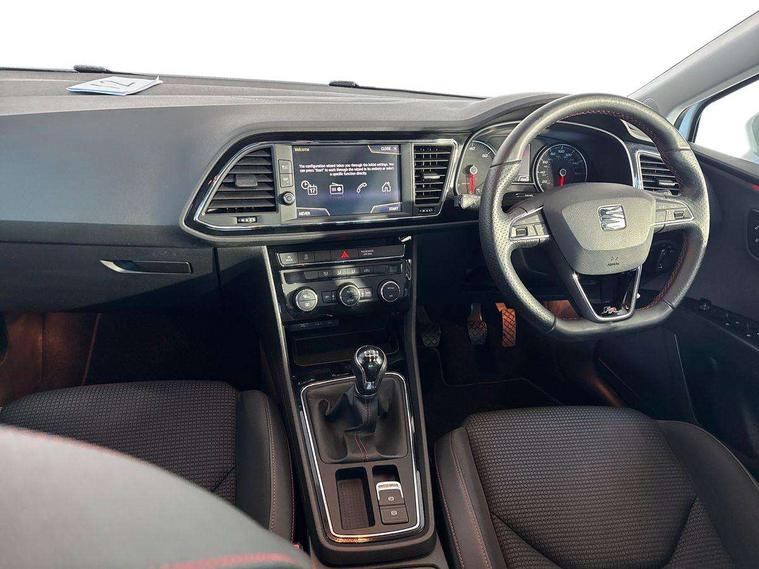 'Lights On' Reminder warning buzzer, 8" touch screen, Bluetooth Handsfree Phone Connection, Low fuel warning light, Outside temperature gauge, Remote fuel flap release, SEAT Drive profile, SEAT logo boot release, Service interval indicator, Touch screen display, Trip computer, Voice control system, XDS electronic differential lock, 2 USB ports, 2x SD card slot, Auxiliary input socket, Bluetooth audio streaming, DAB Digital radio, Radio/CD + MP3, Steering wheel mounted audio/phone controls, Aluminium front door sills, Black grille with chrome surround, Body colour door handles, Body coloured bumpers, Body coloured door mirrors, Dark tinted rear windows, Electric adjustable/heated/folding door mirrors, Electric front/rear windows with one touch/auto up/down, Electric headlamp adjustment, High gloss black finish B and C pillars, LED indicators in door mirrors, Rear wash/wipe, Reverse activated kerb-view adjustment on passenger's door mirror, Twin exhaust pipes, 12v power point in centre console, 3 height adjustable rear headrests, 60/40 split folding rear seat, Active head restraints, Additional heating and ventilation outlet in rear of centre console, Ambient lighting, Boot net, Chrome loading sill, Driver seat lumbar adjustment, Driver/passenger sunvisors with illuminated vanity mirrors, Dual zone climate control, Dust/pollen filter, Front adjustable head restraints, Front armrest with storage box, Front cupholders x 2, Front map reading lights, Front seat and rear pockets, Front sports seats, Front/rear floor mats, Height/reach adjust steering wheel, Illuminated boot, Illuminated glovebox, Instrument lighting with brightness control, Leather handbrake, Luggage compartment cover, Luggage tie-down hooks, Passenger seat height adjuster, Passenger seat lumbar adjust, Perforated leather steering wheel with red stitching + gear knob, Rear reading lights, Rear top tether child seat ISOFIX attachment, Rear window curtains, Full LED headlight pack - Leon, 3 point seatbelts on all rear seats, ABS + traction control, Child proof door locks, Collision mitigation braking system, Curtain airbags, Driver/Front Passenger airbags, Drivers knee airbag, Electronic parking brake with auto hold, ESP+EBA, Front seatbelt pretensioners, Front Seatbelt warning, Front side airbags, Hill hold control, Manual passenger airbag deactivation function, Tyre pressure monitoring system, 2 folding remote keys with window open/close function, Engine immobiliser, Locking wheel bolts, Remote central locking + deadlocks, Volumetric alarm with back up horn, Chrome interior trim,