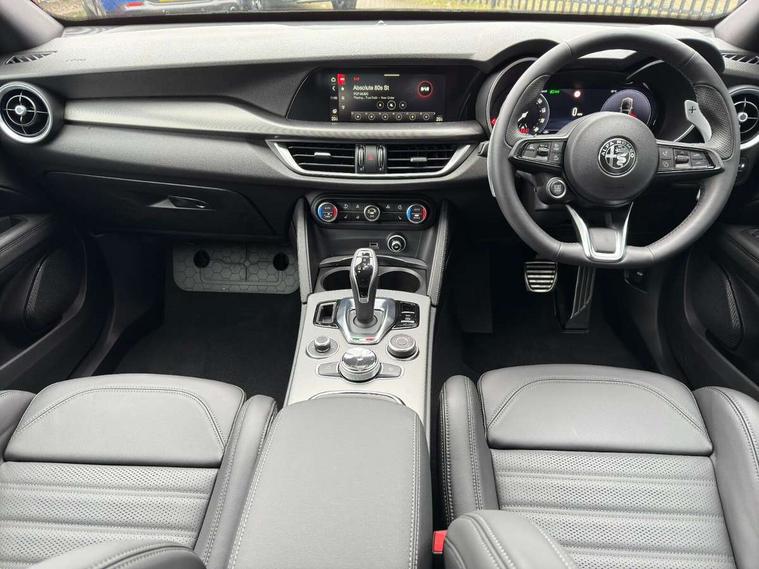 12.3" Full TFT instrument cluster, Active blind spot assist, Active cruise control, Alfa Connect 3D Nav 8.8" Infotainment system (radio, 3D Nav, MP3, aux-in, bluetooth), Alfa connect box, Alfa connected services, Apple car play/Android Auto, DNA unlatched, Driver attention alert system, European maps, Front and rear parking sensors, Lane departure warning system, Lane keep assist, PAS, Power tailgate, Rear view camera with dynamic grid lines, Remote tailgate release with key fob button, Steering wheel buttons, Stop/start system, TMC Pro, Traffic sign recognition (TSR), Trip computer, Wireless charging pad, 2 USB Power socket for rear seat, DAB digital audio broadcast, USB and Aux in armrest, Alfa romeo assistance sticker, Auto high beam assist, Automatic headlights with dusk sensor, Automatic rain sensing wipers, Belly pan, Dark finish V grille, Dark matt exhaust tips, Dark miron scudetto (shield), Darkened rear lights, Electrically adjustable and folding door mirrors, Electrochromatic autodimming outside rearview mirrors, Electrochromatic rear view mirror, Exterior door handle courtesy lights, Exterior mirror finishing, Front and rear electric windows, Fuel door solenoid locking with doors locking, Full LED matrix trilobe headlamps, Heated washer jets, LED daytime running lights, LED rear lights, LED third brake light, Rear side wing doors, Rear wash/wipe, 230V/50hz auxiliary power outlet in trunk, 3 seat bench in 2nd row, Air quality control system, Aluminium front kick plate, Aluminium interior inserts, Aluminium shift paddles on steering column, Aluminium sports pedals, Dark headlining, Driver and passenger sunvisors with illuminated vanity mirrors, Dual zone auto temp control with humidity sensor, English handbook, Front head restraints, Front/rear floor mats, Functional LED lighting, Interior ambient lighting, IP Driver storage, Rear air vents, Rear headrests, Roller cover for cargo area, Single front passenger seat, Sport leather steering wheel, Sports leather gear knob, Third rear headrest, Premium pack - Stelvio, Veloce pack - Stelvio, 3 rear 3 point seatbelts, ABS, ASR, Autonomous emergency braking, Driver and passenger airbags, Electronic parking brake, Electronic stability control, Front seat mounted side airbags, Hill descent control, Manual child lock in rear doors, Passenger airbag deactivation system, Rear seat ISOFIX, SOS - Emergency Call Button, Traction control, Tyre pressure monitoring system, Alarm system with bonnet and intrusion protection, Driver and front passenger doors with passive entry and keyless go, Immobiliser, Monotone wheel centre caps, Tyre inflation kit,