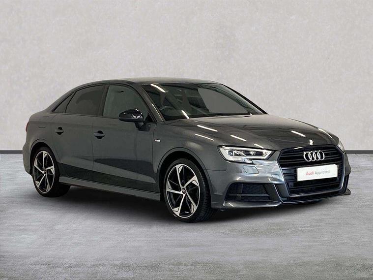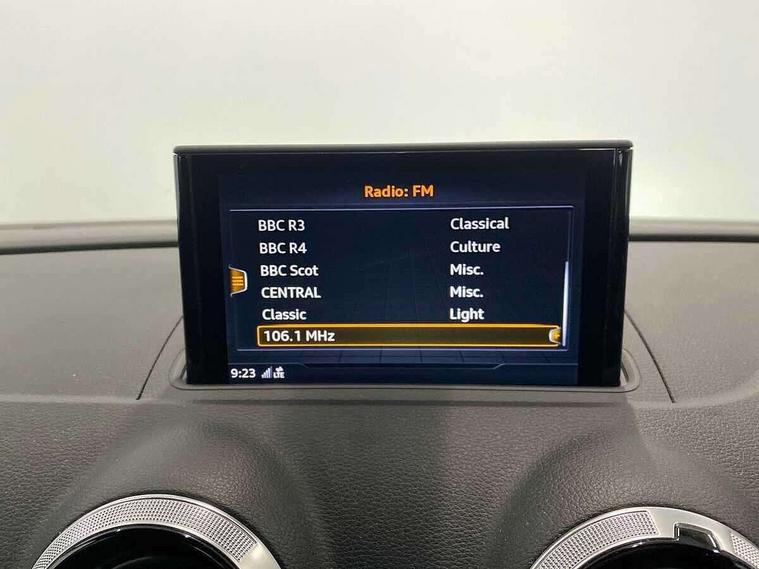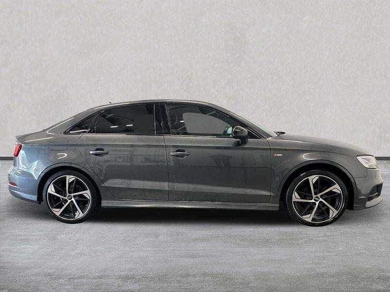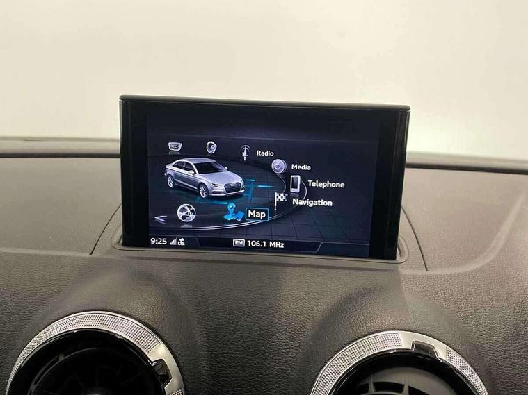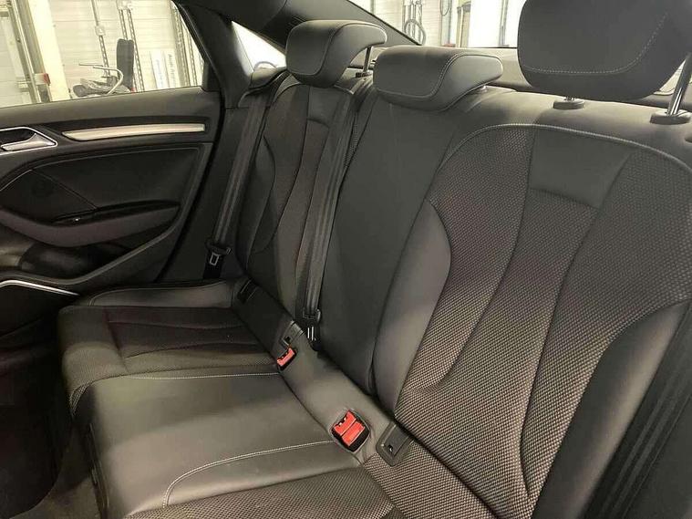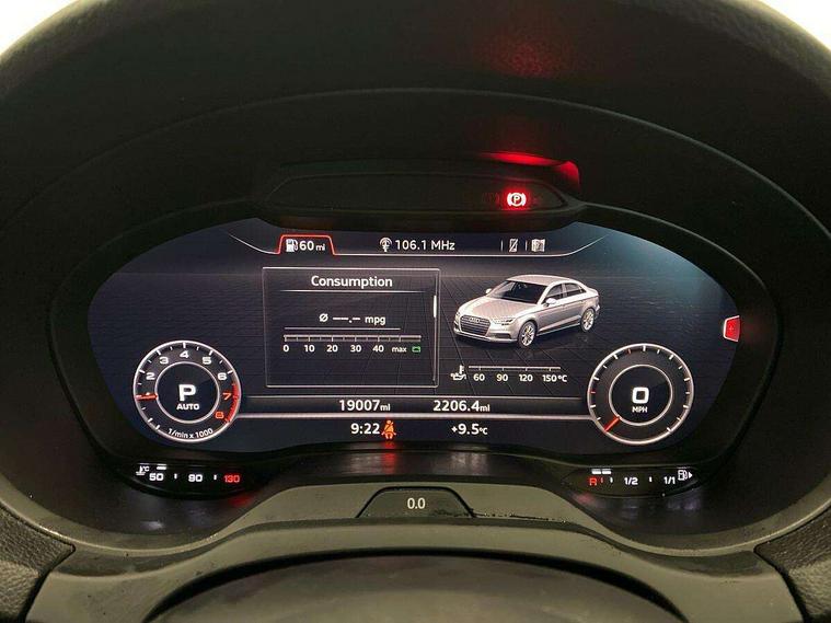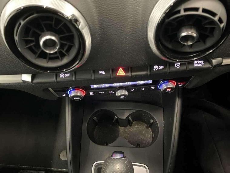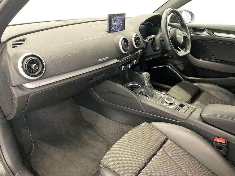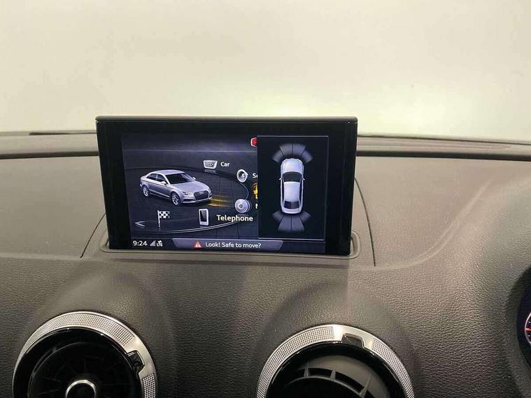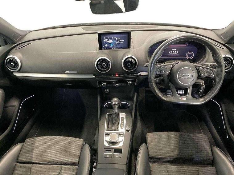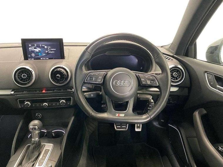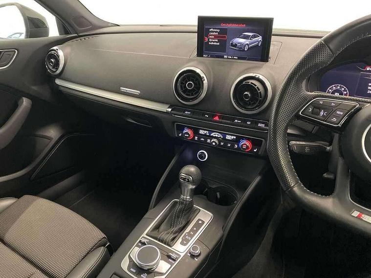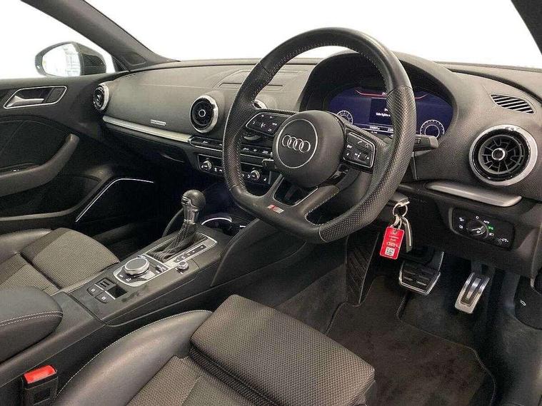 Audi connect, Audi drive select, Audi smartphone interface, Automatic start/stop system, Bluetooth interface, Colour driver's information system display, Electro-mechanical PAS, SD card based MMI navigation, Service indicator, Voice control system, Sports suspension, 2 USB interfaces and Aux-In jack, CD player, DAB Digital radio, MMI radio plus with 7" colour MMI screen and MMI controller, Two SDXC card slots, Auto dimming rear view mirror, Automatic lights and wipers, Black door mirrors, Body colour bumpers, Dual branch tailpipe, Electrically adjustable and heated door mirrors with integrated LED side indicators, Front and rear electric windows, Heated rear window, Heated windscreen washer jets, Model and engine designation badges at rear, Privacy glass - dark tinted rear and rear side windows from B-pillar backwards, S Line badges on the front wings, S Line body styling with high gloss dark chrome radiator grille and rear diffuser in platinum grey, S Line roof edge spoiler, Single chrome exhaust tailpipe, 3 adjustable rear headrests, 3 spoke flat bottomed high multi-function leather sport steering wheel with gearshift paddles, 4 lashing points to secure luggage, 60/40 split folding rear seat, Adjustable front centre armrest, Black cloth headlining, Driver/passenger sunvisors, Dual zone electronic climate control, Front and rear interior lights with delay, Front sport seats with S embossed logo, Front/rear floor mats, Height/depth adjustable steering column, Illuminated door sill trims with S logo, Illuminated glovebox, Illuminated luggage compartment, ISOFIX child seat mounting and Top Tether with front passenger airbag deactivation, Manual height adjustable front seats, Stainless steel pedals, Storage compartments in doors side trims, centre console and under front drivers seat, Black styling pack - A3/S3, LED interior light pack - A3/RS3, Non smoking pack - A3, Storage and luggage pack - A3/RS3, 3 point seatbelts on all seats, ABS/EBD, Active front headrests, Airbags - front driver/passenger, front & rear side, curtain, drivers knee, ASR, EDL, Electromechanical parking brake, ESC - Electronic Stability Control + traction control, Hill hold assist, Predictive pedestrian protection, Seatbelt warning, Tyre pressure warning, Warning triangle and first aid kit, Anti theft alarm, Anti-theft wheel bolts, Immobiliser, Remote control central locking, Aluminium air vent surrounds, Aluminium trim elements, Matt brushed aluminium inlays, 18" 5 arm trapezoid design sport alloy wheels in gloss anthracite black with diamond cut finish, Tool kit, Tyre repair kit,
