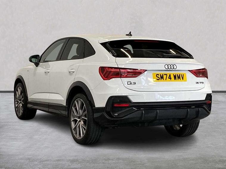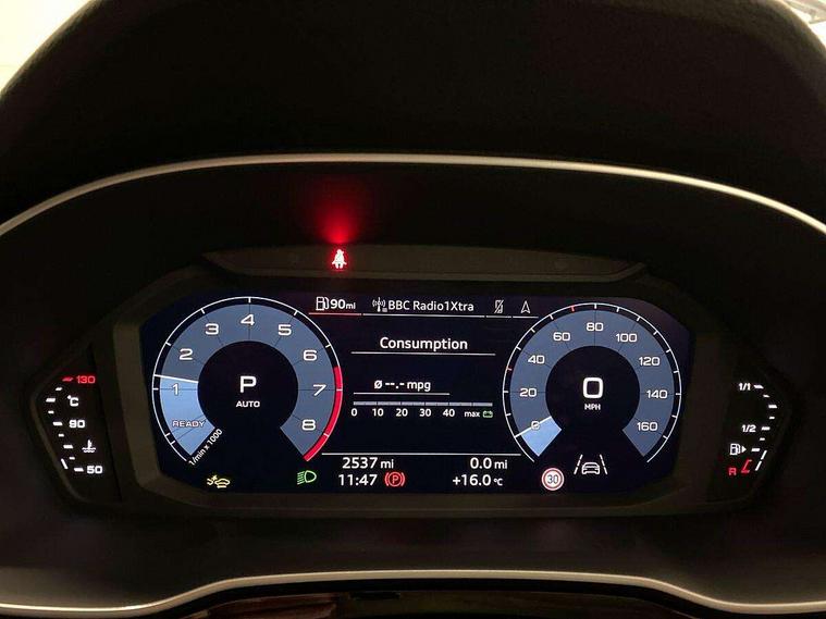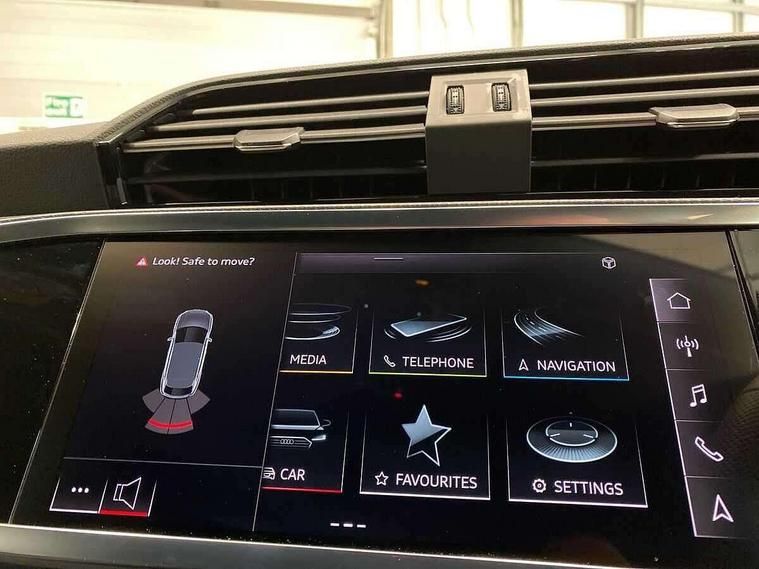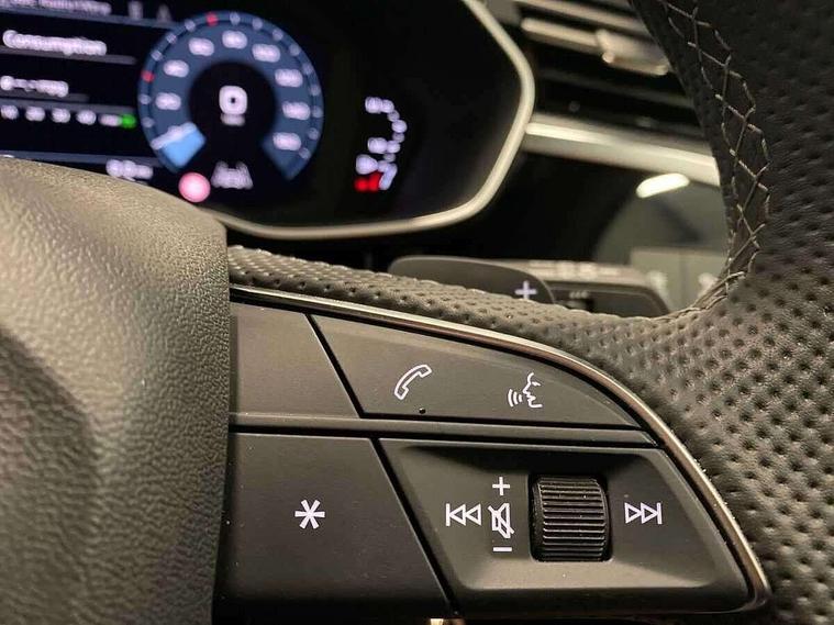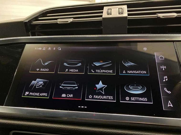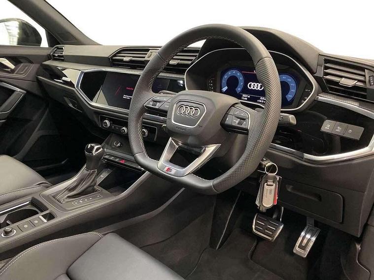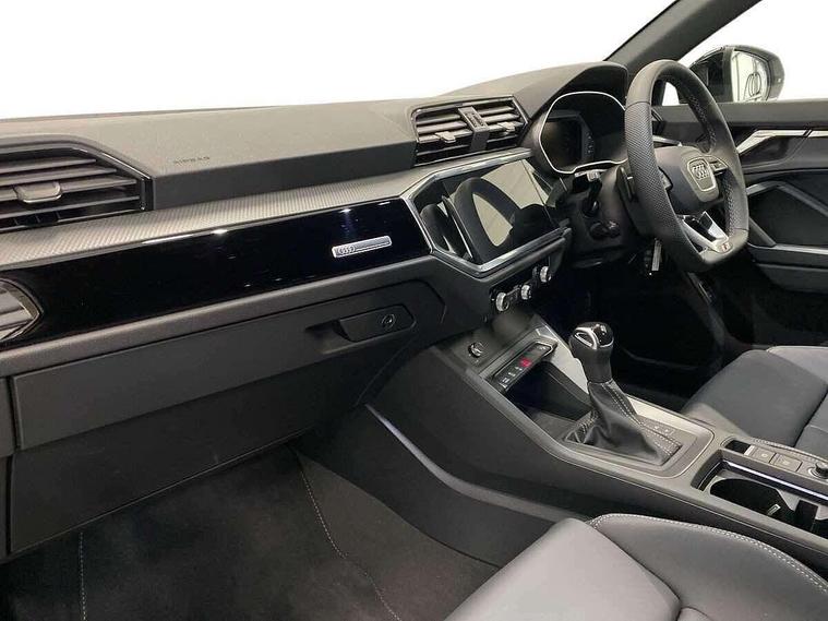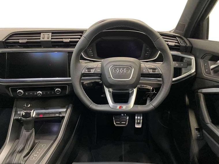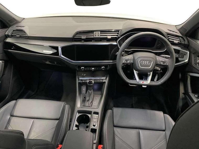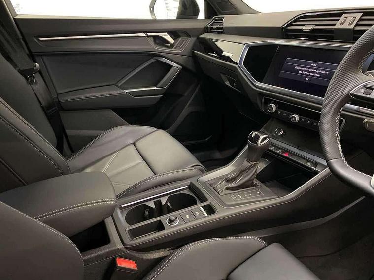 Audi connect safety and service, Audi drive select, Audi lane departure warning, Audi smartphone interface includes wireless Apple carplay/Android Auto, Audi Virtual Cockpit - 10.25" display, Bluetooth interface, Camera based traffic sign recognition, Distraction and Fatigue warning, Legal emergency call, MMI Navigation Plus with high resolution 10.1 inch touchscreen colour display, Power operated tailgate, Progressive steering, Service interval indicator, Start stop system with recuperation, Voice control system with natural language interaction, Sports suspension, 2 USB-C ports with charge and data functions, 6 passive loudspeakers, DAB digital radio module, Acoustic windscreen, Audi Beam uses LEDs to project the Audi logo onto the ground as you exit your Q3, Auto dimming door mirrors, Auto dimming frameless rear view mirror, Diffuser grille in grained matt black, Diffuser trim in selenite silver, Electrically folding, adjustable and heated door mirrors with integrated LED side indicators and kerb view function for passenger side, Front and rear electric windows, Front fog lights, Front underbody protection in manhattan grey paint finish, High gloss black finish B and C pillars, LED Dynamic rear indicators, LED headlights with LED daytime running lights, LED rear lights, LED third brake light, Privacy glass dark tinted rear and rear-side windows (from B-pillar backwards), Rain and light sensors, Rear side wing doors, Rear underbody protection in matt black, Rear wiper, S line front and rear bumpers and side skirts in contrasting Manhattan grey paint finish, Variable front intermittent wipers, 12V socket in rear centre console, 3 seat bench in 2nd row, 40:20:40 folding with manual adjustment for 60:40 forwards/backwards position and backrest angle, Adjustable rear seat bench/backrest with centre armrest and cupholder, Black cloth headlining, Dual zone electronic climate control, Electric lumbar support, Front and rear black floor mats with contrast stitching, Front and rear headrests, Front centre armrest, Height and reach adjustable steering wheel, Illuminated door sill trims with S logo, ISOFIX child seat mounting for front passenger with airbag deactivation and outer rear seat including top tether attachment point for outer rear seats, Luggage compartment sill protection in stainless steel, Manual front seats with height adjustment, Perforated leather gearknob, Single front passenger seat, Stainless steel pedals, Twin leather upholstery with front sport seats + S embossing, Black styling pack - Q3, Non smoking pack - Q3, 3x3 point rear seatbelts, 6 airbags - Driver, front passenger, curtain and side windows, Audi pre-sense front with pedestrain and cyclist recognition, Electrically operated child locks on rear doors, Electromechanical parking brake, Electronic stabilisation control including ABS, ASR and EDL, Front seatbelt reminder, Hill descent control, Hill hold assist, Pre sense basic, Seatbelt monitoring, Tyre pressure warning, Warning triangle and first aid kit, Anti theft alarm, Anti theft wheel bolts, Immobiliser, Remote central locking, Aluminium look interior elements, Detail dashboard around MMI touch colour display in glass look, black with surround in aluminium look, Leatherette door armrest, Piano black inlay,