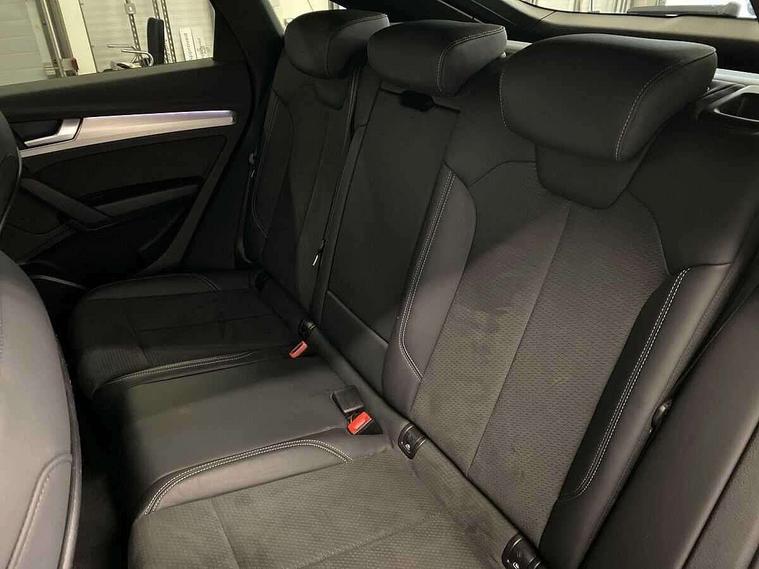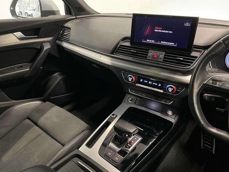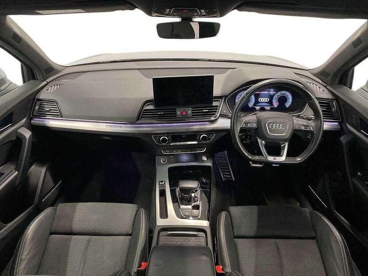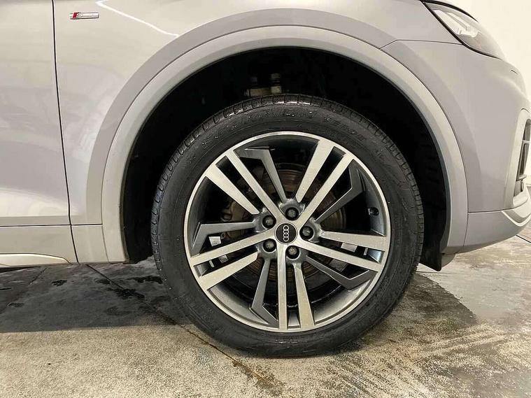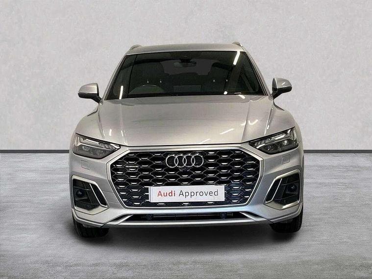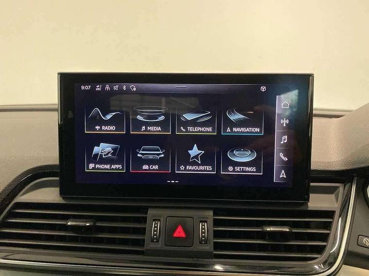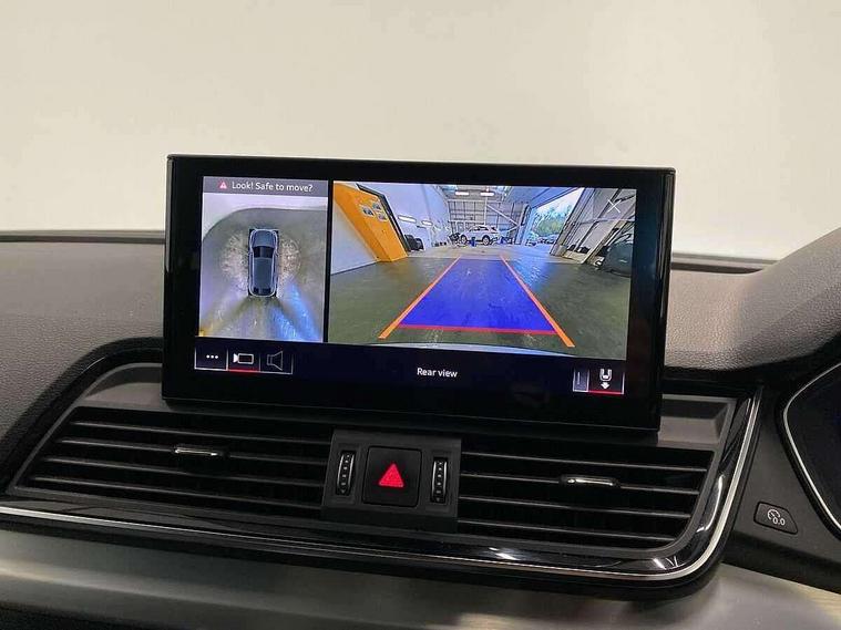 Audi connect safety and service (e-call), Audi connect with Amazon Alexa Integration, Audi drive select, Audi virtual cockpit plus with 12.3" screen and three different layout designs, Audi wireless smartphone interface, Automatic start-stop system with coasting functionality and efficiency programme, Bluetooth interface, Electro - mechanical power assisted steering, MMI navigation plus with 10.1" touch screen, Power tailgate, Reversing camera, Service interval indicator, Voice control system with Audi hotword activation "Hey Audi", Quattro on demand, S line sports suspension, 2 x USB charging port with aux input socket, DAB Digital radio, Acoustic windscreen, Aluminium roof rails, Audi matrix LED headlights with dynamic front and rear indicators, Auto dimming rear view mirror, Automatic headlights and windscreen wipers, Body colour door mirrors, Body colour rear diffuser with matt aluminium silver surrounds, Body colour underbody protection, Chrome plated exhaust trims, Door sills in Selenite silver, Electric adjustable/heated/folding door mirrors, Front air inlet surrounds in aluminium, Front and rear electric windows, Front radiator grille in honeycomb design, Headlight washers, Lower bumpers painted in contrast Manhattan grey, Rear chrome trim strip below lights, Rear privacy glass and rear side windows, Rear spoiler, Rear wiper, Roof bars, S Line badges on the front wings, S Line front and rear bumpers, S Line side skirts, 3 rear headrests, 40:20:40 split folding rear seat with rear centre armrest, Black cloth headlining, Comfort front centre armrest, Contrast stitching on seats, steering wheel and gear lever gaiter, Deluxe 3 zone electronic climate control, Front head restraints, Front/rear floor mats, Gear lever in black leather, Heated front seats, Height/reach adjustable steering column, Illuminated door sill trims with S logo, ISOFIX child seat mounting and top tether, Manual seat adjustment with 4-way electric lumbar support, Removable luggage compartment floor, Stainless steel pedals, Sunvisors with vanity mirrors, Trunk roller cover, High gloss pack - Q5, LED interior light pack - Q5, 3 point seatbelts on all seats, 6 airbags - Driver, front passenger, curtain and side airbags, Electrically operated child locks on rear doors, Electromechanical parking brake, Electronic stabilisation control including ABS, ASR and EDL, Front passenger airbag deactivation, Hill descent control, Hill hold assist, Multi collision brake assist, Pop-up bonnet for pedestrian protection, Pre sense city, Seat belt force limiter, Seatbelt monitoring, Tyre pressure warning, Warning triangle and first aid kit, Anti theft alarm, Anti-theft wheel bolts, Keyless Go access/ignition system, Matt brushed aluminium inlays,