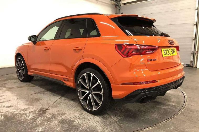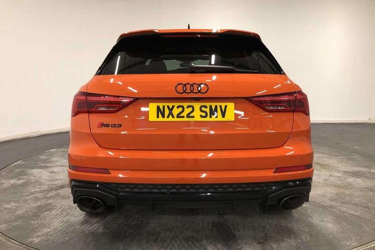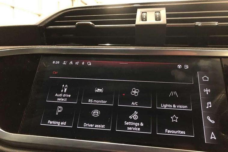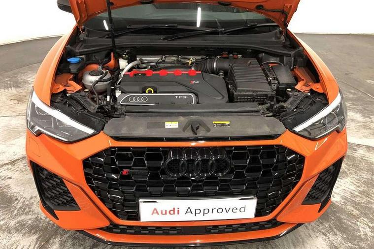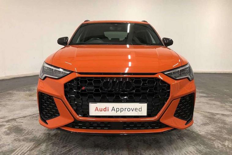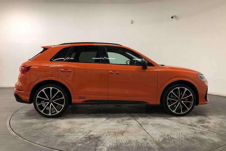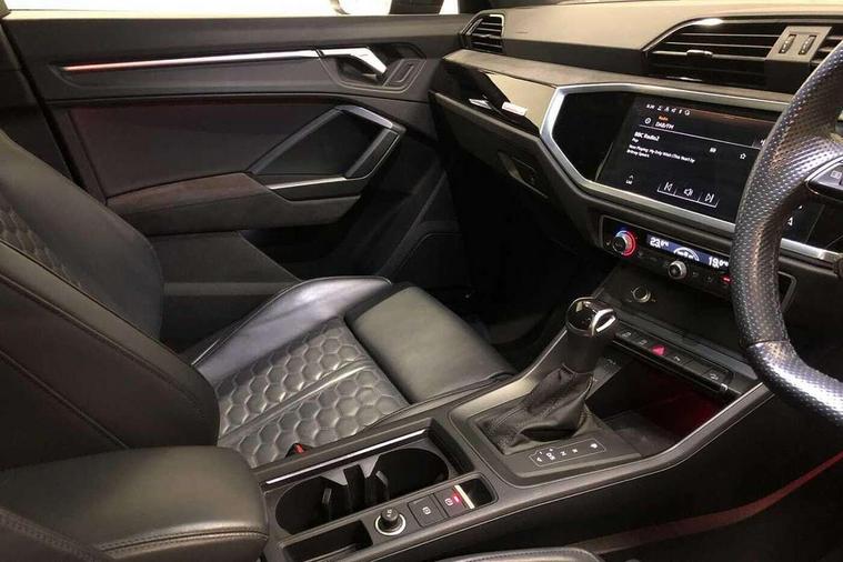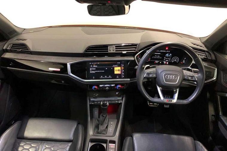 Audi connect safety and service (e-call), Audi drive select with new RS modes, Audi lane departure warning, Audi parking system plus with front and rear sensors, Audi smartphone interface includes wireless Apple carplay/Android Auto, Audi virtual cockpit plus - 12.3 inch display, Bluetooth interface, Camera based traffic sign recognition, MMI Navigation Plus with high resolution 10.1 inch touchscreen colour display, Power operated tailgate, Progressive steering, Start stop system with recuperation, Voice control system with natural language interaction, Quattro all wheel drive, 2 USB-C ports with charge and data functions, Audi sound system, DAB digital radio module, Acoustic windscreen, Audi Beam uses LEDs to project the Audi Sport logo, Auto dimming frameless rear view mirror, Black roof rails, Body colour rear spoiler, Electrically folding, adjustable and heated door mirrors with integrated LED side indicators and kerb view function for passenger side, Flared wheel arches, Flat slits on single frame grille, Headlight washers, High gloss black finish B and C pillars, Honeycomb radiator grille in gloss black, Illuminated door sill trims with RS logo, LED headlights with LED daytime running lights and dynamic rear indicator, LED rear lights, LED third brake light, Panoramic glass sunroof, Privacy glass dark tinted rear and rear-side windows (from B-pillar backwards), Rain and light sensors, Rear side wing doors, Rear wiper, RS specific bumpers with large front air inlets in black, RS Sport exhaust system, dual branch with exhaust flap control and gloss black oval tailpipe trims, Tinted rear windows, Variable front intermittent wipers, 3 seat bench in 2nd row, 4 way electric lumbar support for driver and front passenger, Adjustable rear seat bench/backrest with centre armrest and cupholder, Black Alcantara elements - dashboard and the armrests in the front and rear doors, Black cloth headlining, Dual zone electronic climate control, Electrically adjustable front seats, Fine Nappa leather upholstery with front sports seats + honeycomb stitching and RS embossed logo, Front and rear floor mats, Front and rear head restraints, Front centre armrest, Heated front seats, ISOFIX child seat mounting for front passenger with airbag deactivation and outer rear seat including top tether attachment point for outer rear seats, Single front passenger seat, Stainless steel luggage compartment sill finisher, Stainless steel pedals, Tool kit, Ambient lighting pack - RS Q3, Black styling pack - RS Q3, Non smoking pack - RS Q3, 3x3 point rear seatbelts, 6 airbags - Driver, front passenger, curtain and side windows, Electrically operated child locks on rear doors, Electromechanical parking brake, Electronic stabilisation control including ABS, ASR and EDL, Front seatbelt reminder, Hill descent control, Hill hold assist, Pre sense basic, RS brake system, Seatbelt monitoring, Tyre pressure warning, Warning triangle and first aid kit, Advanced key, Anti theft alarm, Anti theft wheel bolts, Audi pre-sense front with pedestrain and cyclist recognition, Immobiliser, Aluminium look interior elements, Inlay - Black piano finish, MMI touch colour display in glass look, black with surround in aluminium look, Tyre repair kit,