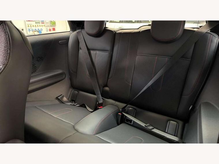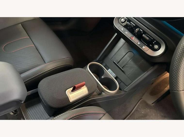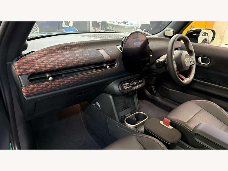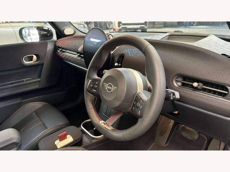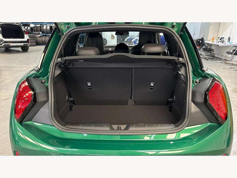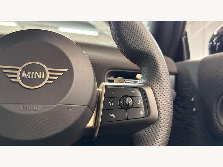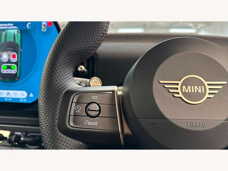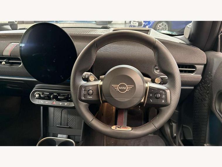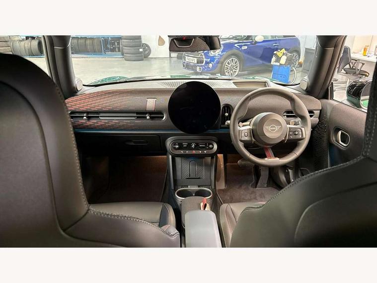 Central toggle bar, Circular OLED Screen, Compatible mobile phone bluetooth with audio streaming, Cruise control, Digital instrument cluster, Electro-mechanical speed dependant steering assistance, Emergency call service, Gaming controller with intelligent personal assistant voice update, MINI Experience Modes, Mini navigation system, On board computer, Service interval indicator, Tailgate, 7 speed sport transmission with double clutch, Adaptive suspension, DAB Digital radio, Personal eSim, Rear USB charger, Adaptable light signatures, Auto headlights, Electric adjustable heated door mirrors, Electric front windows, Front and rear apron, Heated rear window, Heated windscreen washer jets, High gloss black wheel arches, High gloss hexagonal patterned grille surround, JCW body kit, Jet black mirror caps, LED 3rd brake light, LED daytime running lights, LED indicator lights, LED rear lights, Rain sensor window wipers, Rear fog lights, Rear roof spoiler with airblades, Rear window wiper, 2 seat bench in second row, 2 zone automatic air conditioning, 60/40 rear seat bench, Ambient lighting, Black lower band in high gloss, Cupholders, Dark headliner, Floor mats, Front and rear head restraints, Front compact armrest, Heated steering wheel, Height adjustable passenger seat, Lidded storage box in Black/Red knit, Luggage compartment lighting, Partially perforated vescin steering wheel with red accent, black/red decorative strap, Single front passenger seat, Steering wheel paddle shift, Sunvisors with vanity mirrors, Vescin/Cord combination JCW upholstery includes dash knit in black with red accents, Driving assistant pack - Cooper Hatchback, Level 1 pack - Mini Hatchback, Park assistant pack - Cooper Hatchback, 3 point seatbelts on all four seats, 6 Airbags - front, side, head and seat belt tensioners, Anti-lock braking system (ABS), Brake caliper in Black with JCW badge, DSC - Dynamic Stability Control, Electronic parking brake, Front and rear disc brakes, Front ISOFIX (iSize), Front passenger airbag deactivation, JCW Sport Brakes, Traction control, Tyre pressure monitoring system, Alarm, Immobiliser, Remote central locking, Black/Red decorative dash strap, Tyre repair kit,