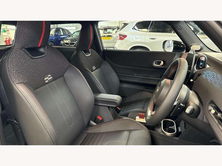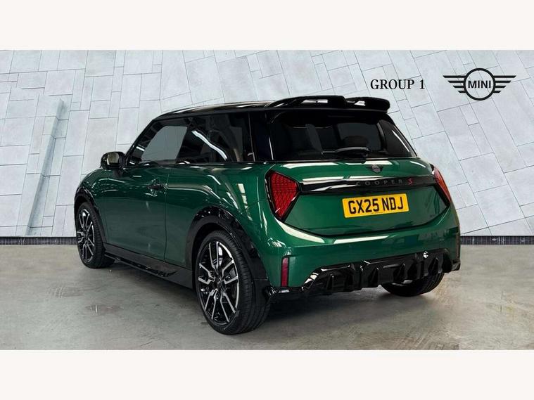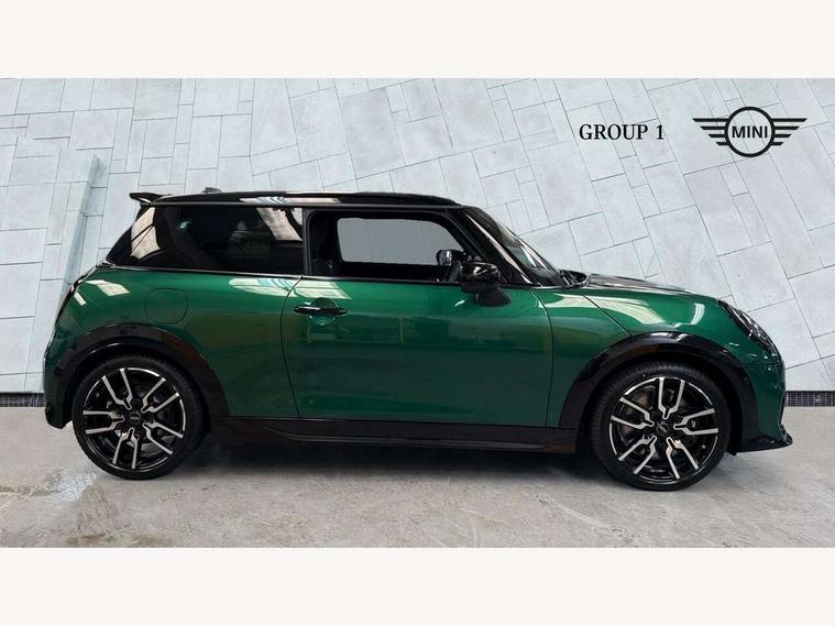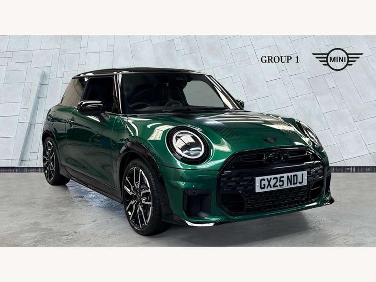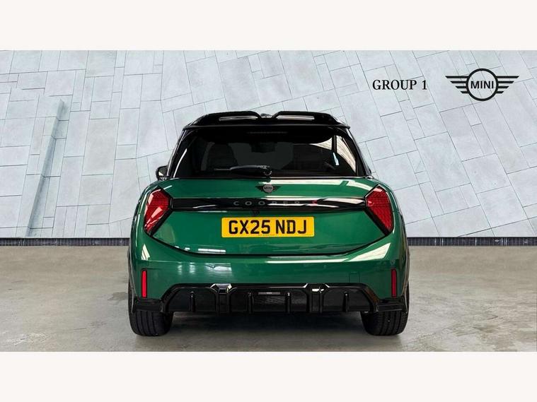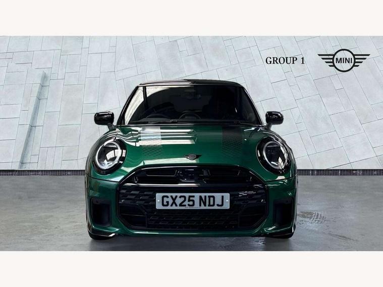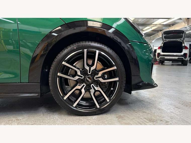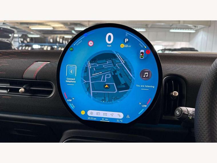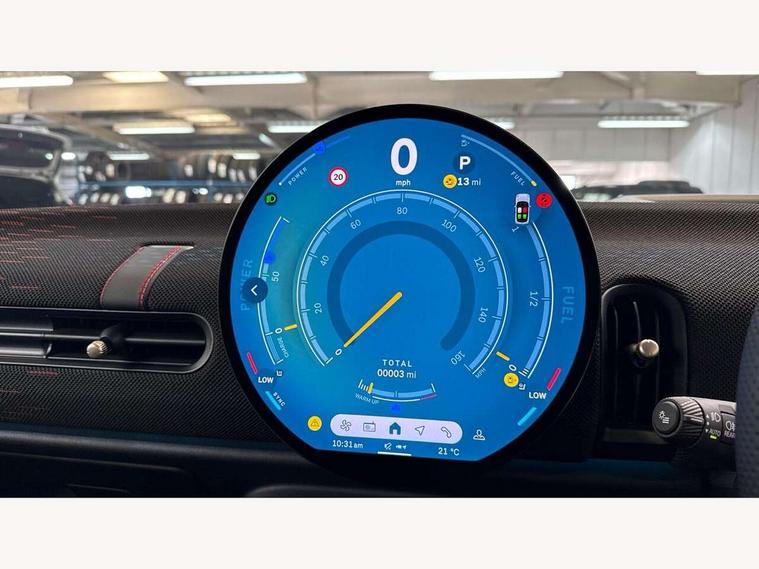 Central toggle bar, Circular OLED Screen, Compatible mobile phone bluetooth with audio streaming, Cruise control, Digital instrument cluster, Electro-mechanical speed dependant steering assistance, Emergency call service, Gaming controller with intelligent personal assistant voice update, MINI Experience Modes, Mini navigation system, On board computer, Service interval indicator, Tailgate, 7 speed sport transmission with double clutch, Adaptive suspension, DAB Digital radio, Personal eSim, Rear USB charger, Adaptable light signatures, Auto headlights, Electric adjustable heated door mirrors, Electric front windows, Front and rear apron, Heated rear window, Heated windscreen washer jets, High gloss black wheel arches, High gloss hexagonal patterned grille surround, JCW body kit, Jet black mirror caps, LED 3rd brake light, LED daytime running lights, LED indicator lights, LED rear lights, Rain sensor window wipers, Rear fog lights, Rear roof spoiler with airblades, Rear window wiper, 2 seat bench in second row, 2 zone automatic air conditioning, 60/40 rear seat bench, Ambient lighting, Black lower band in high gloss, Cupholders, Dark headliner, Floor mats, Front and rear head restraints, Front compact armrest, Heated steering wheel, Height adjustable passenger seat, Lidded storage box in Black/Red knit, Luggage compartment lighting, Partially perforated vescin steering wheel with red accent, black/red decorative strap, Single front passenger seat, Steering wheel paddle shift, Sunvisors with vanity mirrors, Vescin/Cord combination JCW upholstery includes dash knit in black with red accents, Driving assistant pack - Cooper Hatchback, Level 1 pack - Mini Hatchback, Park assistant pack - Cooper Hatchback, 3 point seatbelts on all four seats, 6 Airbags - front, side, head and seat belt tensioners, Anti-lock braking system (ABS), Brake caliper in Black with JCW badge, DSC - Dynamic Stability Control, Electronic parking brake, Front and rear disc brakes, Front ISOFIX (iSize), Front passenger airbag deactivation, JCW Sport Brakes, Traction control, Tyre pressure monitoring system, Alarm, Immobiliser, Remote central locking, Black/Red decorative dash strap, Tyre repair kit,