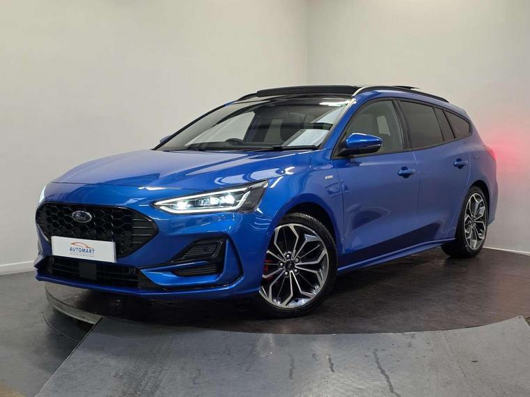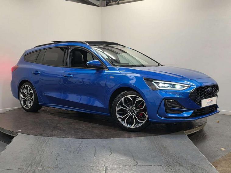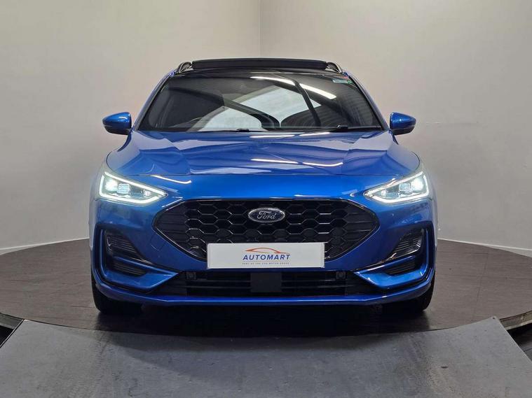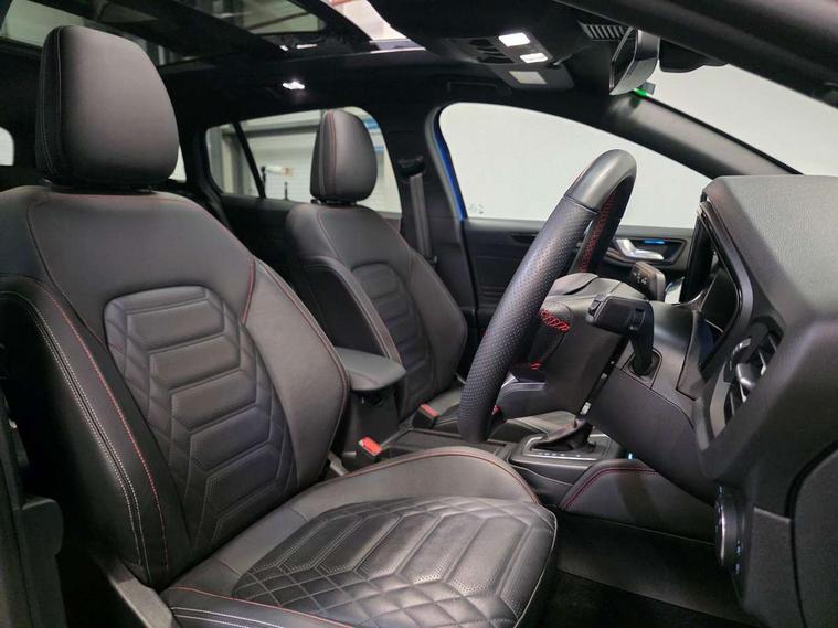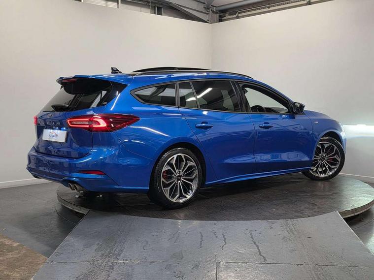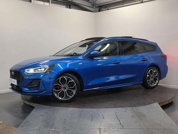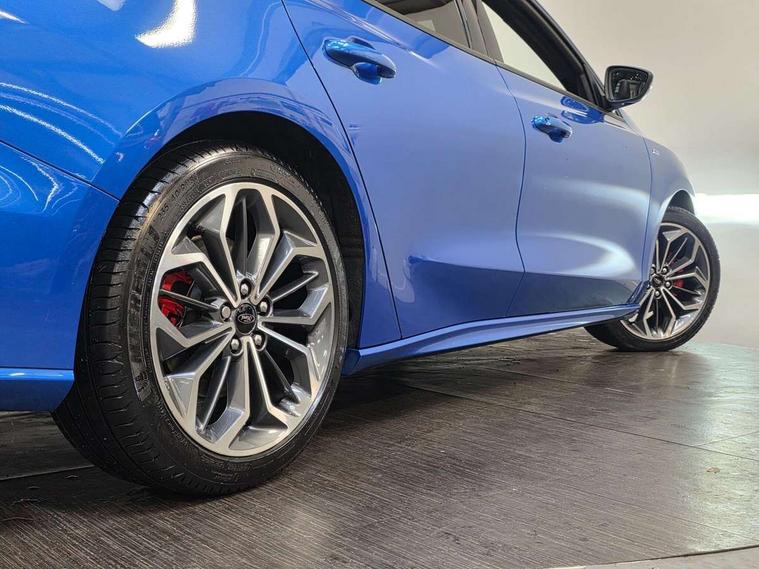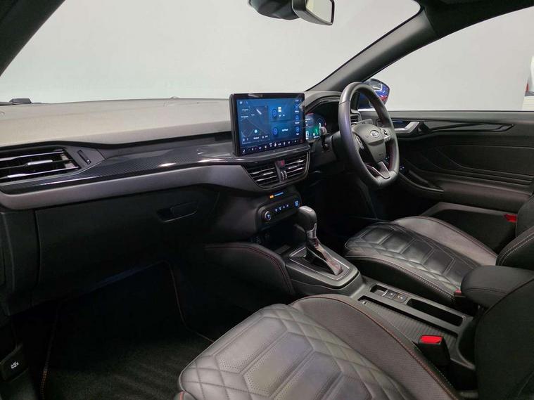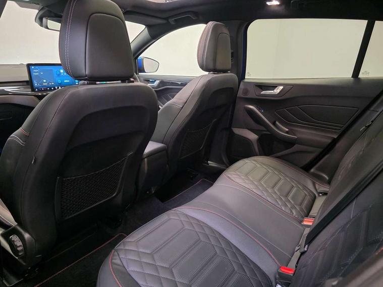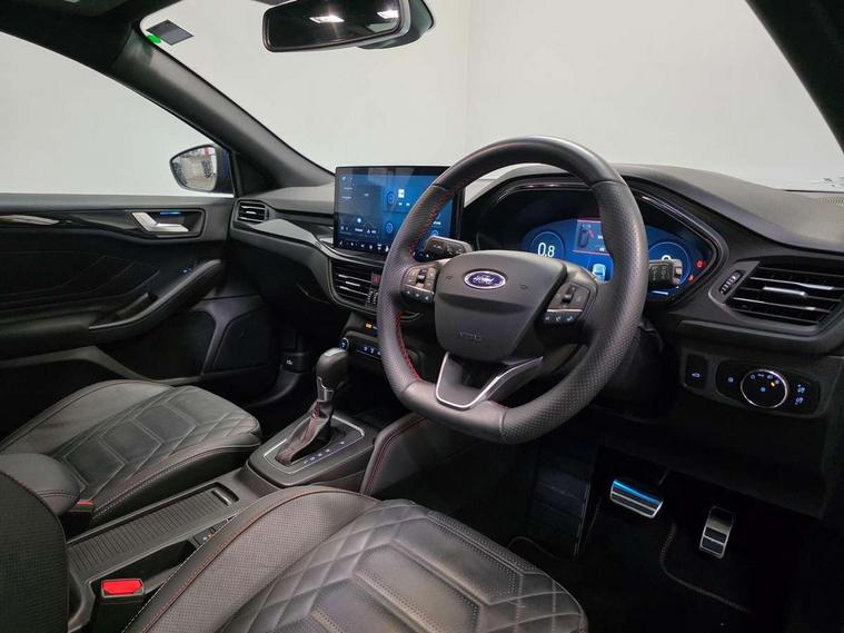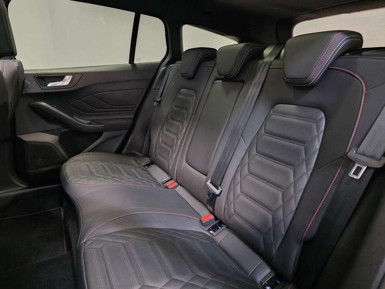 12.3" Digital instrument cluster, Bluetooth system, Digital clock, Easy fuel capless refuelling system, Eco mode, Ford SYNC4 Nav with 13.2'' touchscreen, DAB, Emergency Assistance, Apple Carplay & Android Auto, B&O Premium Audio with 10 speakers, FordPass Connect, Lane keeping system - lane keeping alert and lane keeping aid, PAS, Rev counter, Selectable drive mode, Service interval indicator, Trip computer, Wireless charging pad, Sports tuned suspension, 2 USB ports, Auto headlamps (on/off), Body coloured door handles, Electrically operated front and rear windows with one touch opening and closing, Electrically operated heated power fold door mirrors with puddle lamp with side indicators, Front variable intermittent wipers with electric wash, Heated rear window, LED daytime running lamp, LED rear lamps, LED third brake light, Polished twin tailpipe, Privacy glass, Quickclear heated windscreen, Rain sensor, Rear side wing doors, Tailgate wash/wipe, Unique ST-Line grille, full bodystyling kit, and large body coloured rear roof spoiler, 3 rear headrests, 3 seat bench in 2nd row, Dual zone electronic air temperature control, Full sensico premium upholstery, Height adjustable front headrests, Isofix child seat preparation, Load through ski hatch, Manual 2-way passenger seat adjust, Power 4-way driver seat adjust, with power lumbar adjust, Reach + rake adjustable steering column, Single front passenger seat, ST-Line Design pack - Focus, Winter pack - Focus, 3x3 point rear seatbelts, ABS+Electronic Brake force Distribution, Auto hold function, Driver airbag, EDL traction control, Electronic parking brake, Electronic stability control, Front and rear seatbelt reminder, Front inertia reel height adjustable seatbelts with pre-tensioners, Front passenger airbag, Front side airbags, Passenger airbag deactivate switch, Post collision braking, Pre collision assist with autonomous emergency braking and pedestrian/cyclist detection, Remote/power child rear door locks, Side curtain airbags, Three rear inertia reel lap/diagonal seatbelts, Tyre pressure monitoring system, Keyless entry and keyless start, MyKey system, Remote central locking & engine immobiliser, Thatcham alarm with power door dead locks, 18" 5x3 spoke pearl grey high gloss machined finish alloy wheels with mini spare wheel,