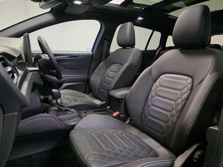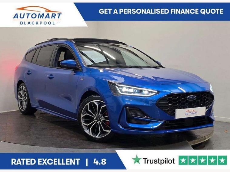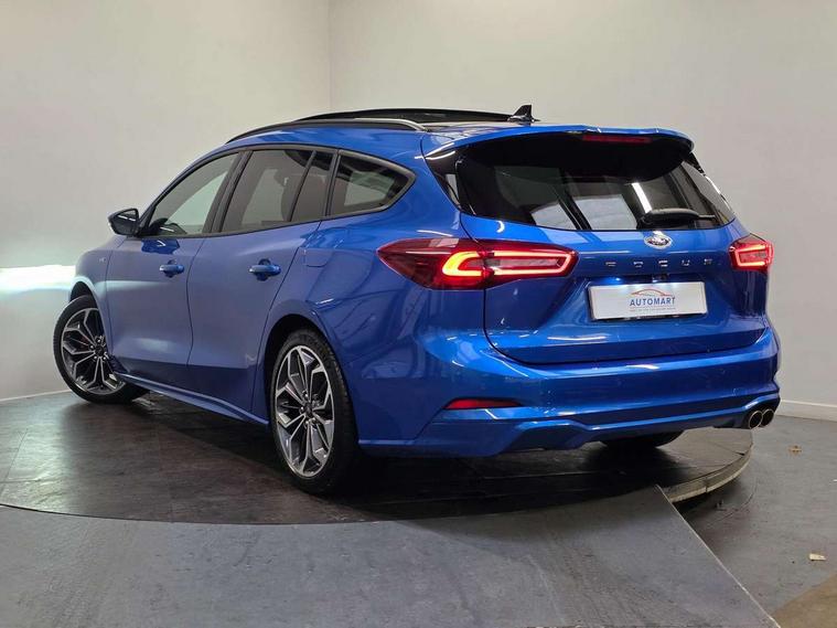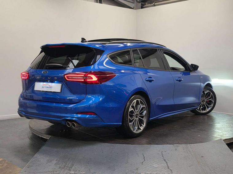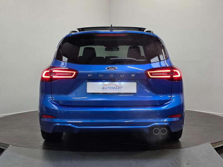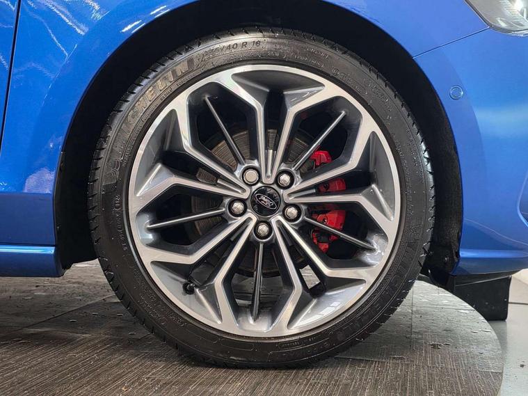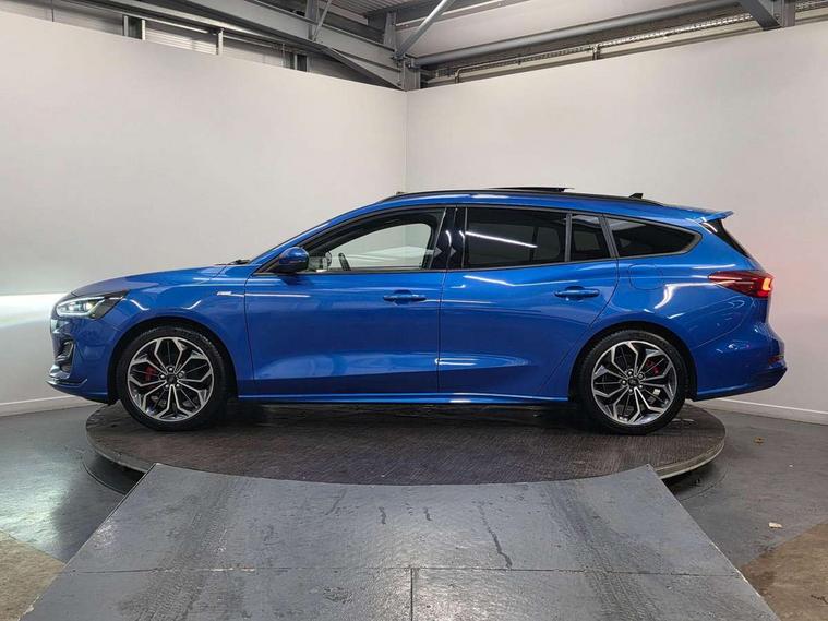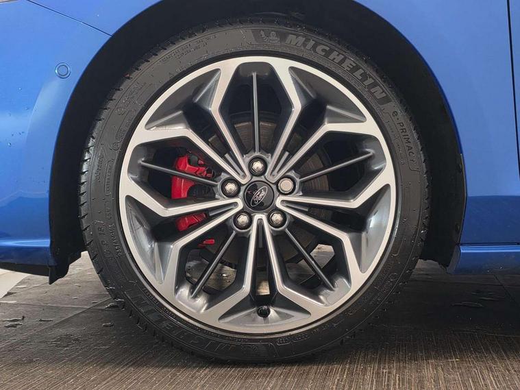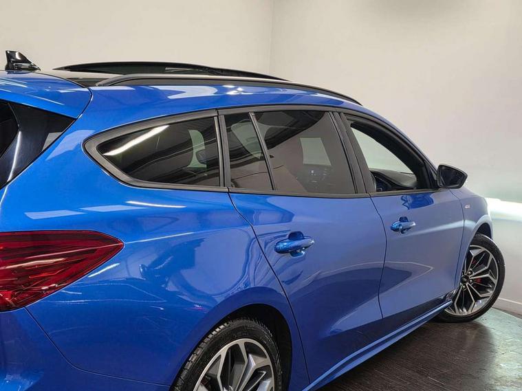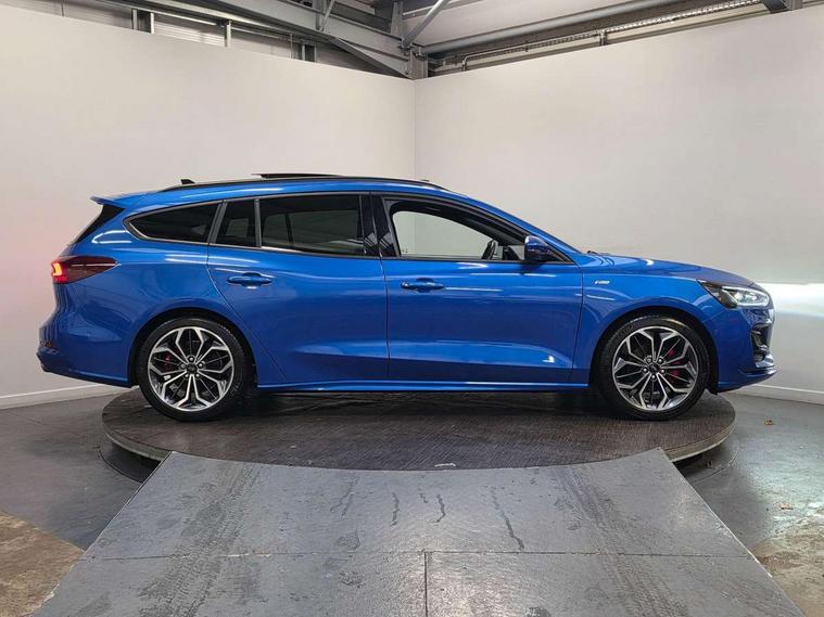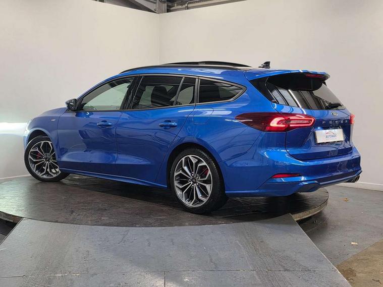 12.3" Digital instrument cluster, Bluetooth system, Digital clock, Easy fuel capless refuelling system, Eco mode, Ford SYNC4 Nav with 13.2'' touchscreen, DAB, Emergency Assistance, Apple Carplay & Android Auto, B&O Premium Audio with 10 speakers, FordPass Connect, Lane keeping system - lane keeping alert and lane keeping aid, PAS, Rev counter, Selectable drive mode, Service interval indicator, Trip computer, Wireless charging pad, Sports tuned suspension, 2 USB ports, Auto headlamps (on/off), Body coloured door handles, Electrically operated front and rear windows with one touch opening and closing, Electrically operated heated power fold door mirrors with puddle lamp with side indicators, Front variable intermittent wipers with electric wash, Heated rear window, LED daytime running lamp, LED rear lamps, LED third brake light, Polished twin tailpipe, Privacy glass, Quickclear heated windscreen, Rain sensor, Rear side wing doors, Tailgate wash/wipe, Unique ST-Line grille, full bodystyling kit, and large body coloured rear roof spoiler, 3 rear headrests, 3 seat bench in 2nd row, Dual zone electronic air temperature control, Full sensico premium upholstery, Height adjustable front headrests, Isofix child seat preparation, Load through ski hatch, Manual 2-way passenger seat adjust, Power 4-way driver seat adjust, with power lumbar adjust, Reach + rake adjustable steering column, Single front passenger seat, ST-Line Design pack - Focus, Winter pack - Focus, 3x3 point rear seatbelts, ABS+Electronic Brake force Distribution, Auto hold function, Driver airbag, EDL traction control, Electronic parking brake, Electronic stability control, Front and rear seatbelt reminder, Front inertia reel height adjustable seatbelts with pre-tensioners, Front passenger airbag, Front side airbags, Passenger airbag deactivate switch, Post collision braking, Pre collision assist with autonomous emergency braking and pedestrian/cyclist detection, Remote/power child rear door locks, Side curtain airbags, Three rear inertia reel lap/diagonal seatbelts, Tyre pressure monitoring system, Keyless entry and keyless start, MyKey system, Remote central locking & engine immobiliser, Thatcham alarm with power door dead locks, 18" 5x3 spoke pearl grey high gloss machined finish alloy wheels with mini spare wheel,