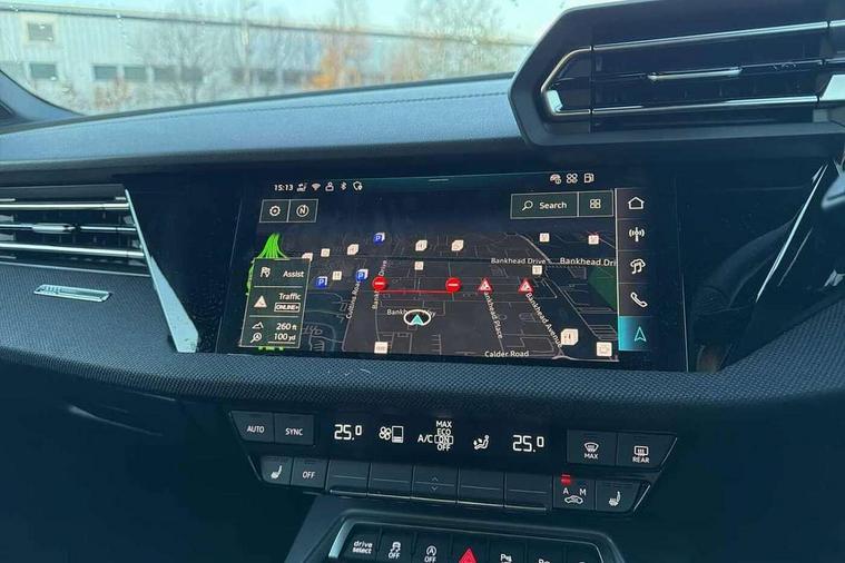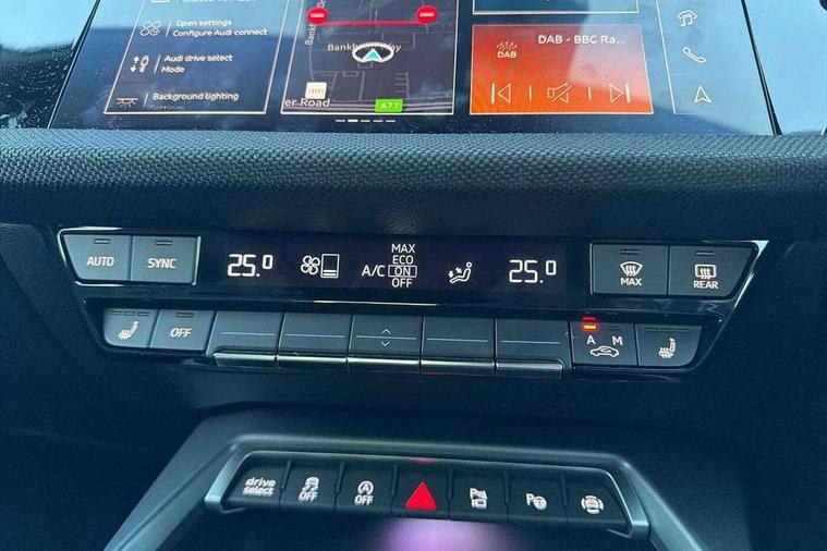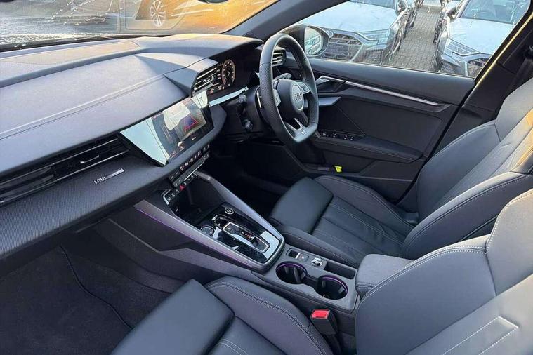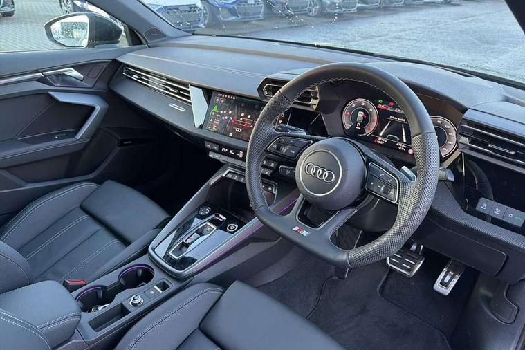 Adaptive cruise control (ACC), Adjustable speed limiter, Audi drive select (Auto, Comfort, Dynamic, Efficiency and Individual), Audi virtual cockpit plus - 12.3" full HD resolution dynamic digital instrument cluster, Automatic start/stop system with recuperation, Bluetooth interface, Camera based traffic sign recognition, Collision avoidance assistant, Driver attention and fatigue detection, e-Call (emergency call), Electromechanical power speed sensitive steering, Emergency assist, Intersection assist, Lane departure warning system, MMI Navigation Plus with high resolution 10.1" colour touch screen display, Park Assist with parking system Plus, Reversing camera, Service indicator, Smartphone interface with app store includes wireless Apple carplay, Android auto and Amazon alexa integration, Trip computer, Voice control system with natural language interaction, Diesel particulate filter, Sports suspension, Audi Phonebox light with wireless charging, Audi sound system - 10 loudspeakers including centre loudspeaker and subwoofer, DAB Digital radio, USB ports with charging function in the rear, Acoustic glass windscreen, All weather light, Anthracite grey Audi rings (front and rear), Audi beam uses LEDs to project the Audi logo onto the ground as you exit your A3, Auto dimming frameless rear view mirror, Automatic dynamic range control, Black accents front and rear bumpers, Black accents in the area of the Audi single frame grille, Black accents window trims strips, Dipped beam, main beam, position light and turning light, Electrically adjustable/heated/folding/auto dimming door mirrors with integrated LED indications + kerb view function for passenger side, Exterior model badging, Front and rear side air inlets in grained matt black with dark liquid chrome frame, Front electric windows, Front radiator grill in high gloss dark chrome, Heat insulating glass windscreen, Illuminated door sills with aluminium inserts at the front with S logo, Intersection light, LED 3rd brake light, LED brake lights, LED daytime running x3, LED headlights with LED rear lights and dynamic rear indicators, LED rear number plate lights, LED reverse light, LED tail lights, Light and rain sensors, Manoeuvring light, Motorway light, Privacy glass - dark tinted rear window, rear door and side windows, Rear diffuser and grill in grained matt black with inlay in dark liquid chrome, Rear electric windows, Rear side wing doors, Rear wiper, S roof spoiler, Side sill trim in dark liquid chrome, Static cornering light, 12V socket and storage compartment in front centre console, 3 seat bench in 2nd row, 3 spoke flat bottomed leather multifunction sport steering wheel with gear shift paddles, 3-zone deluxe automatic air conditioning, 4 way electrically adjustable lumbar support for driver and front passenger, 40/20/40 split folding rear seat bench, Black cloth headlining, Black front and rear floor mats, Front and rear centre armrest in artificial leather with contrasting stitching on armrests and instrument panel, Front and rear headrests, Heated front seats, Height and reach adjustable steering wheel, i-Size child seat mounting on the front passenger side and outer rear seats, i-Size and top tether on the outer rear seats, Manual boot compartment lid, Manually adjustable front seats, Rear centre armrest with cupholder, S badging on the steering wheel, Seat side bolsters, Single front passenger seat, Stainless steel pedals and front footrest in black, Twin leather upholstery with front sports seats S embossed logo, Aluminium interior elements pack - A3, 3x3 point rear seat belts, Driver and front passenger airbag with passenger airbag deactivation, Electronic Stabilisation Control (ESC) including ABS, ASR and EDL, First aid kit with warning triangle and 2 safety vests, Front side airbags with head airbags and interaction airbag, Hill hold assist, Pre-sense front with pedestrian and cyclist detection, Seatbelt monitoring, Tyre pressure loss indicator, Anti theft alarm, Anti-theft wheel bolts, Electronically operated child locks, Immobiliser, Black dashboard,