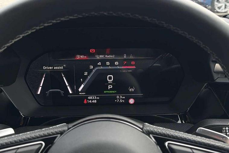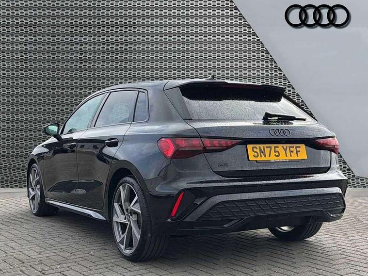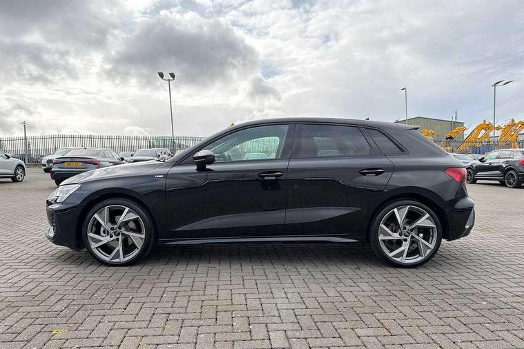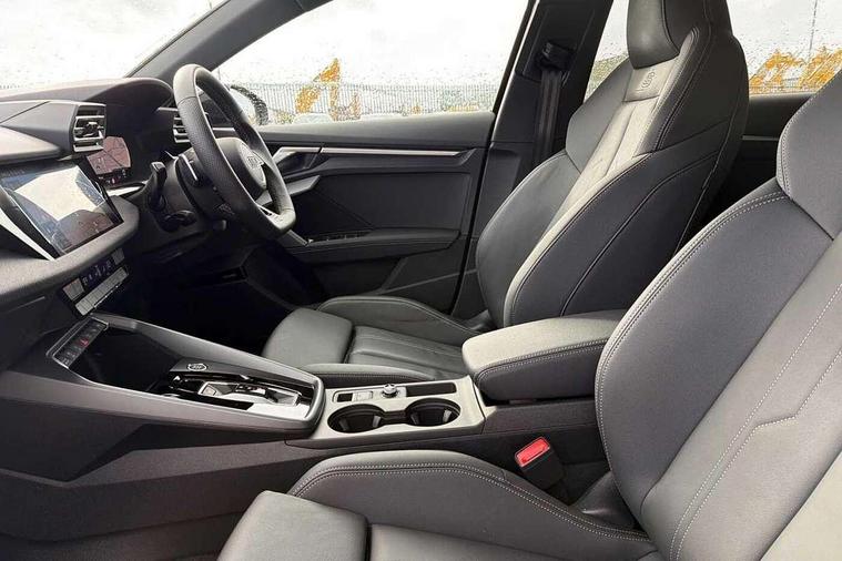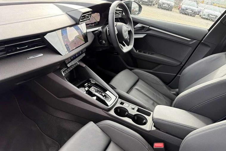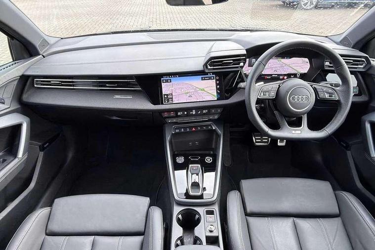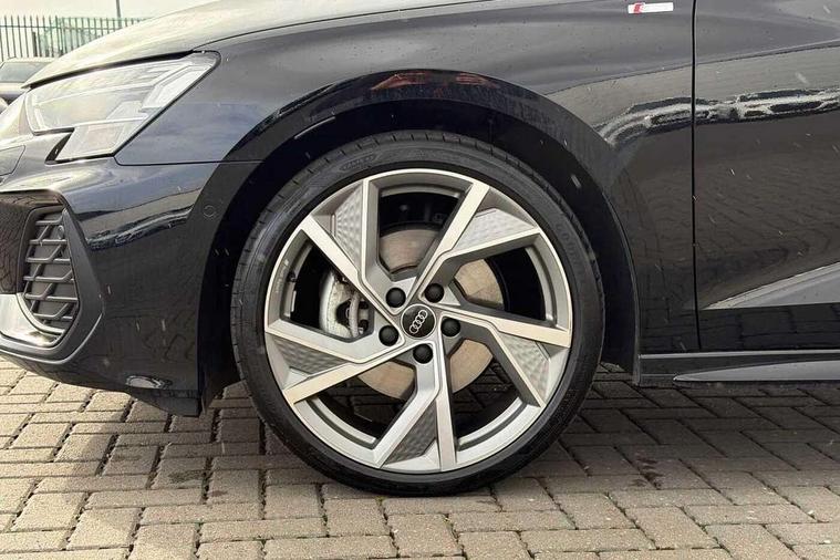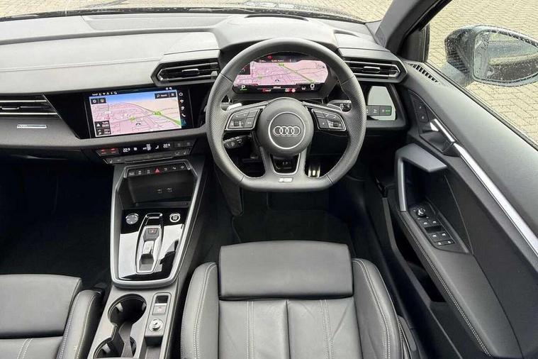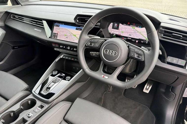 Adjustable speed limiter, Audi drive select, Audi smartphone interface with app store includes wireless Apple carplay, Android auto and Amazon alexa integration, Audi virtual cockpit plus - 12.3" full HD resolution dynamic digital instrument cluster, Automatic start/stop system with recuperation, Bluetooth interface, Camera based traffic sign recognition, Collision avoidance assistant, Cruise control, Distraction and Fatigue warning, e-Call (emergency call), Electromechanical power speed sensitive steering, Emergency assist, Lane departure warning system, MMI Navigation Plus with high resolution 10.1" colour touch screen display, Park Assist with parking system Plus, Service indicator, Tailgate, Trip computer, Voice control system with natural language interaction, Sports suspension, Audi Phonebox light with wireless charging, Audi sound system - 10 loudspeakers including centre loudspeaker and subwoofer, DAB Digital radio, USB ports with charging function in the rear, Acoustic glass windscreen, All weather light, Anthracite grey Audi rings (front and rear), Audi beam uses LEDs to project the Audi logo onto the ground as you exit your A3, Auto dimming frameless rear view mirror, Automatic dynamic range control, Black accents front and rear bumpers, Black accents in the area of the Audi single frame grille, Black accents window trims strips, Dipped beam, main beam, position light and turning light, Electrically adjustable/heated/folding/auto dimming door mirrors with integrated LED indications + kerb view function for passenger side, Exterior model badging, Front and rear side air inlets in grained matt black with dark liquid chrome frame, Front electric windows, Heat insulating glass windscreen, Illuminated door sills with aluminium inserts at the front with S logo, Intersection light, LED 3rd brake light, LED brake lights, LED daytime running x3, LED headlights with LED rear lights and dynamic rear indicators, LED rear number plate lights, LED reverse light, LED tail lights, Light and rain sensors, Manoeuvring light, Motorway light, Privacy glass - dark tinted rear window, rear door and side windows, Rear diffuser and grill in grained matt black with inlay in dark liquid chrome, Rear electric windows, Rear side wing doors, Rear wiper, S roof spoiler, Static cornering light, 12V socket and storage compartment in front centre console, 3 seat bench in 2nd row, 3 spoke flat bottomed leather multifunction sport steering wheel with gear shift paddles, 3-zone deluxe automatic air conditioning, 4 way electrically adjustable lumbar support for driver and front passenger, 40/20/40 split folding rear seat bench, Black cloth headlining, Black front and rear floor mats, Front and rear centre armrest in artificial leather with contrasting stitching on armrests and instrument panel, Front and rear headrests, Heated front seats, Height and reach adjustable steering wheel, Manual boot compartment lid, Manually adjustable front seats, Rear centre armrest with cupholder, S badging on the steering wheel, Seat side bolsters, Single front passenger seat, Stainless steel pedals and front footrest in black, Twin leather upholstery with front sports seats S embossed logo, Aluminium interior elements pack - A3, 3x3 point rear seat belts, Driver and front passenger airbag with passenger airbag deactivation, Electronic Stabilisation Control (ESC) including ABS, ASR and EDL, First aid kit with warning triangle and 2 safety vests, Front side airbags with head airbags and interaction airbag, Hill hold assist, Pre-sense front with pedestrian and cyclist detection, Seatbelt monitoring, Tyre pressure loss indicator, Anti theft alarm, Anti-theft wheel bolts, Electronically operated child locks, Immobiliser, Remote central locking with safelock, Black dashboard,