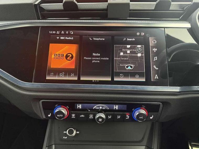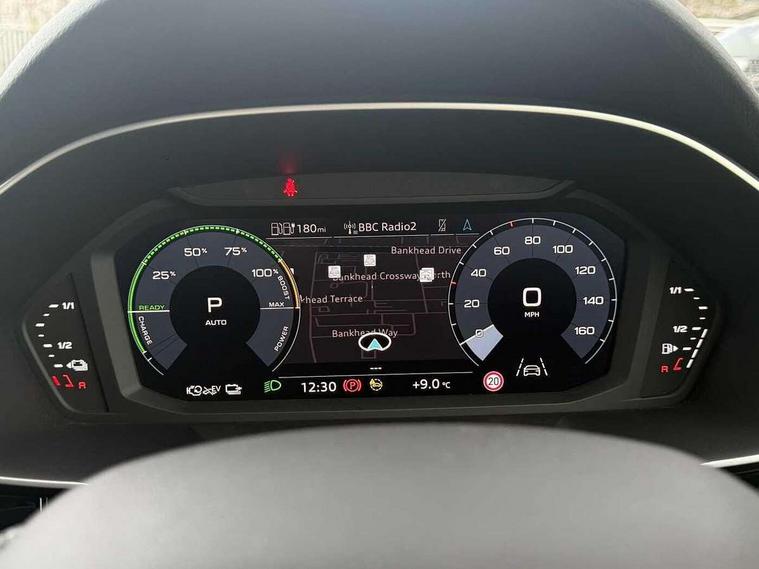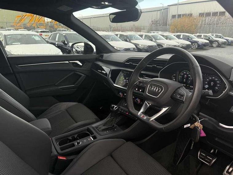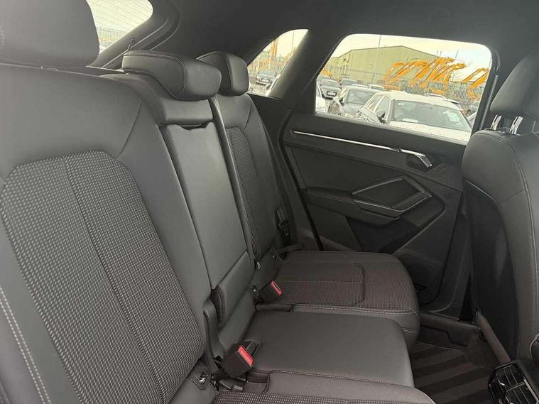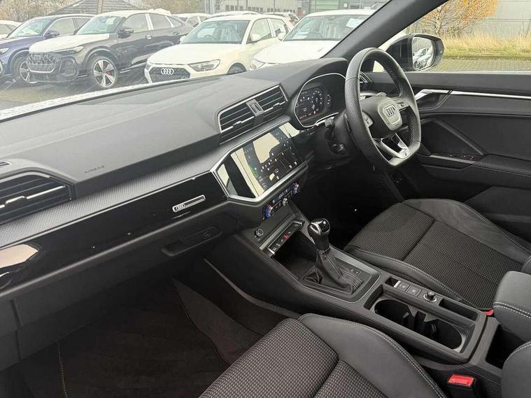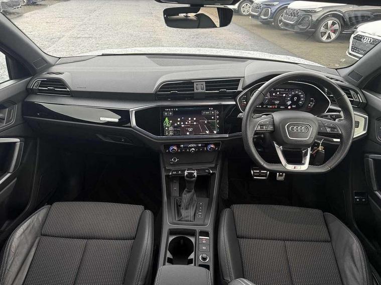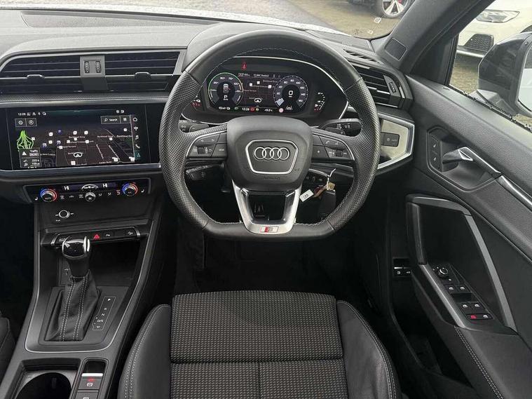 Amazon alexa Integration, Audi drive select, Audi lane departure warning, Audi Virtual Cockpit - 10.25" display, Bluetooth interface, Camera based traffic sign recognition, Legal emergency call, MMI Navigation Plus with high resolution 10.1 inch touchscreen colour display, Power operated tailgate, Progressive steering, Service interval indicator, Smartphone interface includes wireless Apple carplay/Android Auto, Start stop system with recuperation, Voice control system with natural language interaction, 3 pin 10 amp domestic charging cable, 3.6 kw On-board charger, Type 2 mode 3 32 amp charging cable, Type 2 socket for AC charging, 2 USB-C ports with charge and data functions, 6 passive loudspeakers, DAB digital radio module, Acoustic windscreen, Auto dimming frameless rear view mirror, Black roof rails, Electrically folding, adjustable and heated door mirrors with integrated LED side indicators and kerb view function for passenger side, Front and rear electric windows, Front fog lights, Grille vertical bars in aluminium silver/Matt, High gloss black finish B and C pillars, LED Dynamic rear indicators, LED headlights with LED daytime running lights, LED rear lights, LED third brake light, Privacy glass dark tinted rear and rear-side windows (from B-pillar backwards), Rain and light sensors, Rear diffuser grille in grained matt black, Rear diffuser strip in matt anthracite black, Rear side wing doors, Rear wiper, S line bumpers in contrasting Manhattan grey, Variable front intermittent wipers, 12V socket in rear centre console, 3 seat bench in 2nd row, 40:20:40 folding with manual adjustment for 60:40 forwards/backwards position and backrest angle, Adjustable rear seat bench/backrest with centre armrest and cupholder, Black cloth headlining, Dual zone electronic climate control, Front and rear black floor mats with contrast stitching in rock grey, Front and rear headrests, Front and rear roof module including reading lights, Front centre armrest, Glove compartment lighting, Height and reach adjustable steering wheel, Illuminated door sill trims with S logo, ISOFIX child seat mounting for front passenger with airbag deactivation and outer rear seat including top tether attachment point for outer rear seats, Luggage compartment light, Manual front seats with height adjustment, Perforated leather gearknob, Single front passenger seat, Stainless steel luggage compartment sill finisher, Stainless steel pedals, Ambient lighting pack - Q3, Black styling pack - Q3, Non smoking pack - Q3, 3x3 point rear seatbelts, 6 airbags - Driver, front passenger, curtain and side windows, Audi pre-sense front with pedestrain and cyclist recognition, Electrically operated child locks on rear doors, Electromechanical parking brake, Electronic stabilisation control including ABS, ASR and EDL, Front seatbelt reminder, Hill descent control, Hill hold assist, Pre sense basic, Seatbelt monitoring, Tyre pressure warning, Warning triangle and first aid kit, Anti theft alarm, Anti theft wheel bolts, Immobiliser, Remote central locking, Aluminium look interior elements, Detail dashboard around MMI touch colour display in glass look, black with surround in aluminium look, Leatherette door armrest, Piano black inlay, 19" 5 twin arm design diamond cut audi sport alloy wheels in matt grey look, Tool kit, Tyre repair kit,