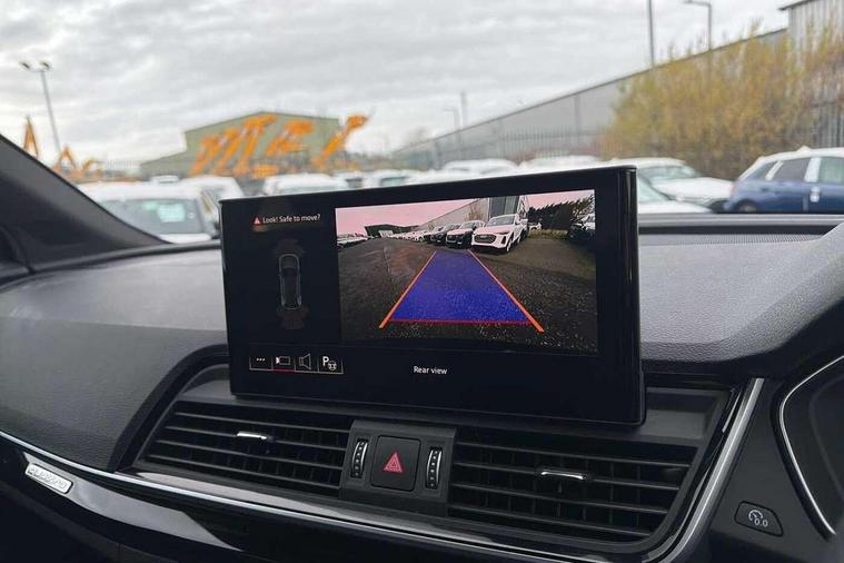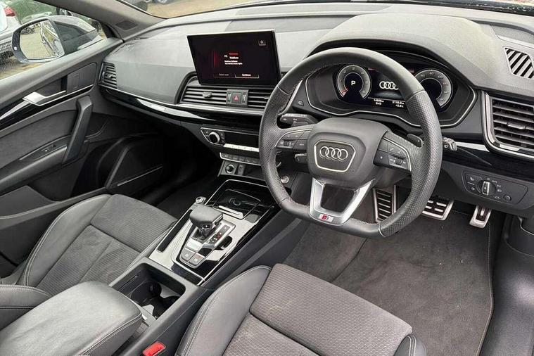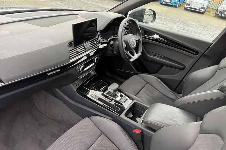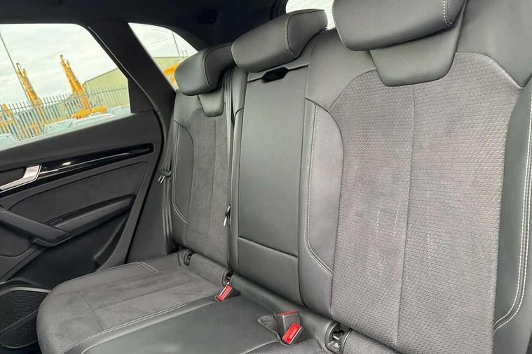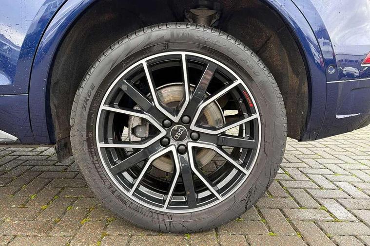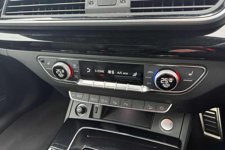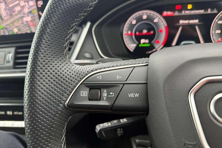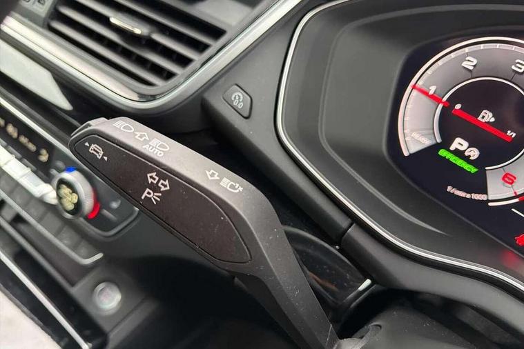 Acoustic front and rear parking sensor, Audi connect safety and service (e-call), Audi drive select, Audi virtual cockpit plus with 12.3" screen and three different layout designs, Audi wireless smartphone interface, Automatic start-stop system with coasting functionality and efficiency programme, Bluetooth interface, Camera based traffic sign recognition, Electro - mechanical power assisted steering, Lane departure warning, MMI navigation plus with 10.1" touch screen, Power tailgate, Reversing camera, Service interval indicator, Voice control system with Audi hotword activation "Hey Audi", Diesel particulate filter, Quattro on demand, S line sports suspension, 2 x USB charging port with aux input socket, 8 loudspeakers, DAB Digital radio, Acoustic windscreen, Auto dimming door mirrors, Auto dimming frameless rear view mirror, Automatic headlight adjustment, Automatic headlights and windscreen wipers, Black roof rails, Black styling with black rings, Body colour bumpers, Body colour rear diffuser with matt aluminium silver surrounds, Body colour underbody protection, Chrome plated exhaust trims, Daytime running lights, Door sills in Selenite silver, Electric adjustable/heated/folding door mirrors, Front air inlet surrounds in aluminium, Front and rear electric windows, Front radiator grille in honeycomb design, LED 3rd brake light, LED headlights and LED tail lights, Loading edge protection in stainless steel, Lower bumpers painted in contrast Manhattan grey, Rear chrome trim strip below lights, Rear privacy glass and rear side windows, Rear side wing doors, Rear wiper, Roof bars, S Line badges on the front wing panels, S Line front and rear bumpers, S Line rear spoiler, S Line side skirts, 3 rear headrests, Black cloth headlining, Comfort front centre armrest, Contrast stitching on seats, steering wheel and gear lever gaiter, Deluxe 3 zone electronic climate control, Front head restraints, Front sport seats with S embossed logo, Front/rear floor mats, Gear lever in black leather, Heated front seats, Height/reach adjustable steering column, Illuminated door sill trims with S logo, Luggage compartment cover, Manual seat adjustment with 4-way electric lumbar support, Single front passenger seat, Stainless steel pedals, Sunvisors with vanity mirrors, Top surface of the rear centre armrest in artificial leather, High gloss pack - Q5, LED interior light pack - Q5, 3 point seatbelts on all seats, 6 airbags - Driver, front passenger, curtain and side airbags, Attention and drowsiness assist, Electrically operated child locks on rear doors, Electromechanical parking brake, Electronic stabilisation control including ABS, ASR and EDL, First aid kit with warning triangle and vests, Front passenger airbag deactivation, Hill descent control, Hill hold assist, ISOFIX child seat mounting for front passenger seat and ISOFIX child seat mounting with Top Tether for outer rear seats, Multi collision brake assist, Pop-up bonnet for pedestrian protection, Pre sense city, Seatbelt monitoring, Tyre pressure warning, Anti theft alarm, Anti-theft wheel bolts, Remote central locking, Remote control key with SAFELOCK and keyless go, Air vents inserts and centre console in gloss black, Tool kit, Tyre repair kit,