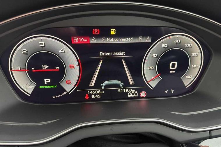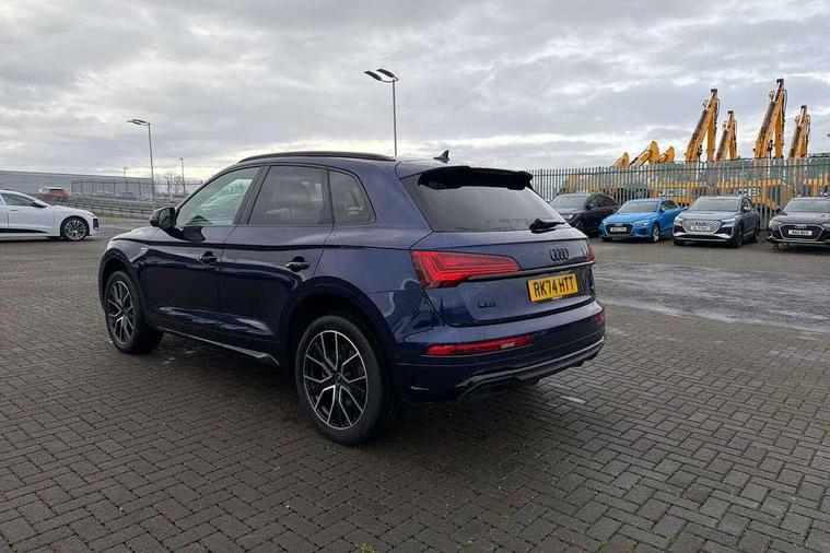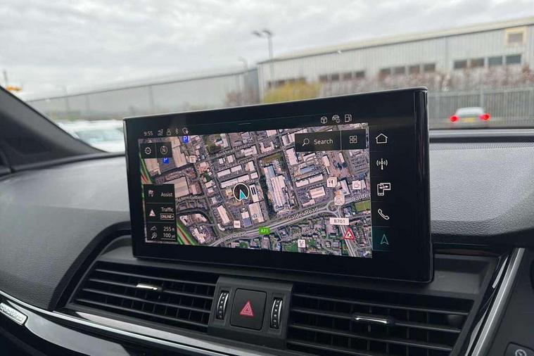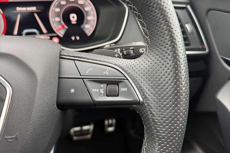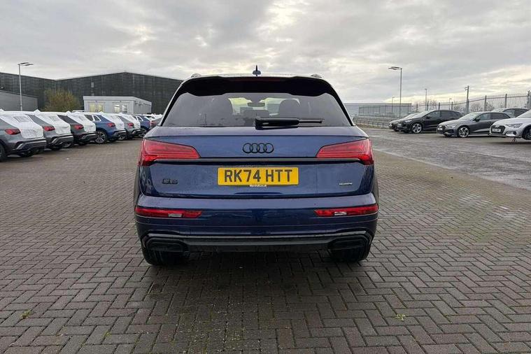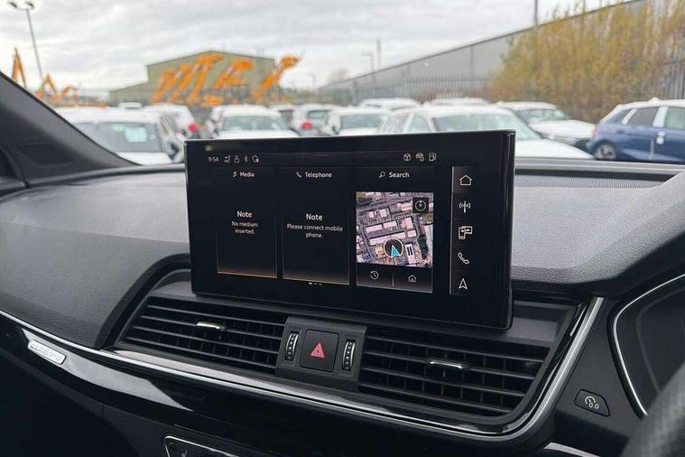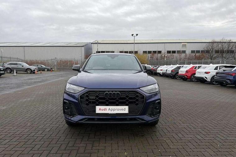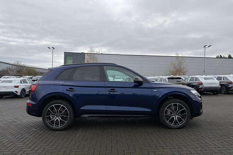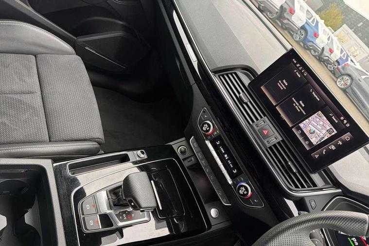 Acoustic front and rear parking sensor, Audi connect safety and service (e-call), Audi drive select, Audi virtual cockpit plus with 12.3" screen and three different layout designs, Audi wireless smartphone interface, Automatic start-stop system with coasting functionality and efficiency programme, Bluetooth interface, Camera based traffic sign recognition, Electro - mechanical power assisted steering, Lane departure warning, MMI navigation plus with 10.1" touch screen, Power tailgate, Reversing camera, Service interval indicator, Voice control system with Audi hotword activation "Hey Audi", Diesel particulate filter, Quattro on demand, S line sports suspension, 2 x USB charging port with aux input socket, 8 loudspeakers, DAB Digital radio, Acoustic windscreen, Auto dimming door mirrors, Auto dimming frameless rear view mirror, Automatic headlight adjustment, Automatic headlights and windscreen wipers, Black roof rails, Black styling with black rings, Body colour bumpers, Body colour rear diffuser with matt aluminium silver surrounds, Body colour underbody protection, Chrome plated exhaust trims, Daytime running lights, Door sills in Selenite silver, Electric adjustable/heated/folding door mirrors, Front air inlet surrounds in aluminium, Front and rear electric windows, Front radiator grille in honeycomb design, LED 3rd brake light, LED headlights and LED tail lights, Loading edge protection in stainless steel, Lower bumpers painted in contrast Manhattan grey, Rear chrome trim strip below lights, Rear privacy glass and rear side windows, Rear side wing doors, Rear wiper, Roof bars, S Line badges on the front wing panels, S Line front and rear bumpers, S Line rear spoiler, S Line side skirts, 3 rear headrests, Black cloth headlining, Comfort front centre armrest, Contrast stitching on seats, steering wheel and gear lever gaiter, Deluxe 3 zone electronic climate control, Front head restraints, Front sport seats with S embossed logo, Front/rear floor mats, Gear lever in black leather, Heated front seats, Height/reach adjustable steering column, Illuminated door sill trims with S logo, Luggage compartment cover, Manual seat adjustment with 4-way electric lumbar support, Single front passenger seat, Stainless steel pedals, Sunvisors with vanity mirrors, Top surface of the rear centre armrest in artificial leather, High gloss pack - Q5, LED interior light pack - Q5, 3 point seatbelts on all seats, 6 airbags - Driver, front passenger, curtain and side airbags, Attention and drowsiness assist, Electrically operated child locks on rear doors, Electromechanical parking brake, Electronic stabilisation control including ABS, ASR and EDL, First aid kit with warning triangle and vests, Front passenger airbag deactivation, Hill descent control, Hill hold assist, ISOFIX child seat mounting for front passenger seat and ISOFIX child seat mounting with Top Tether for outer rear seats, Multi collision brake assist, Pop-up bonnet for pedestrian protection, Pre sense city, Seatbelt monitoring, Tyre pressure warning, Anti theft alarm, Anti-theft wheel bolts, Remote central locking, Remote control key with SAFELOCK and keyless go, Air vents inserts and centre console in gloss black, Tool kit, Tyre repair kit,