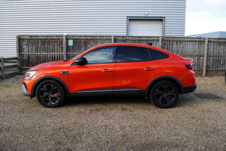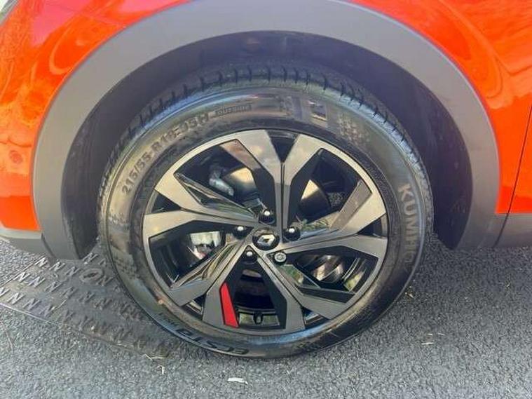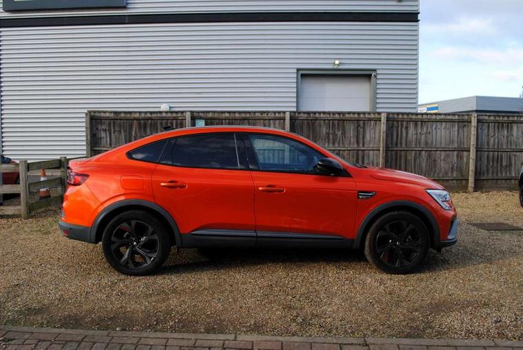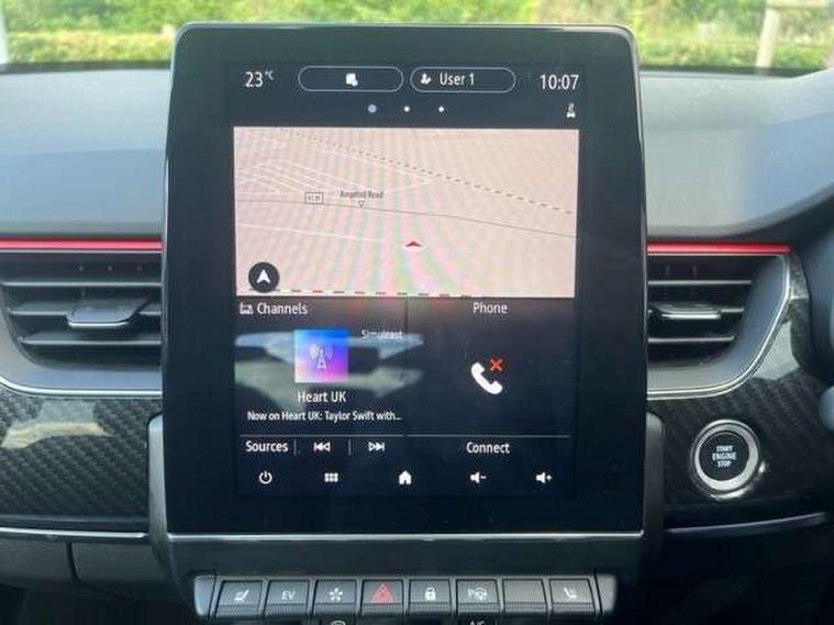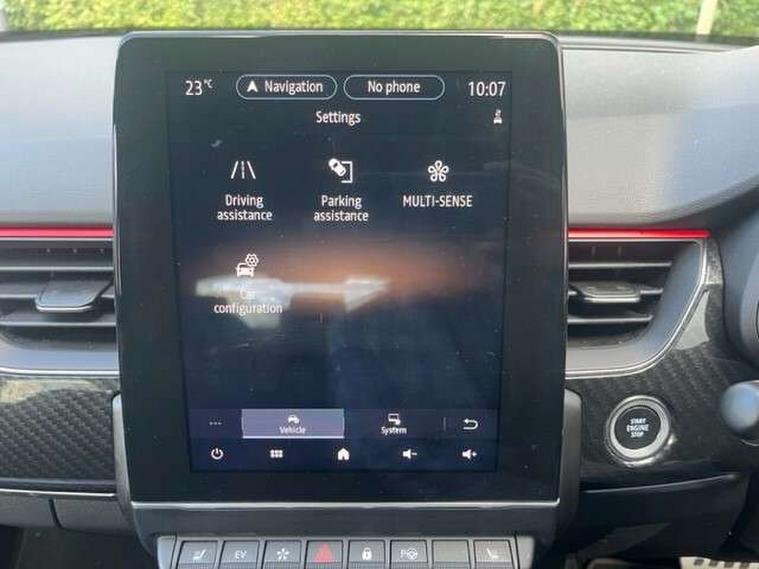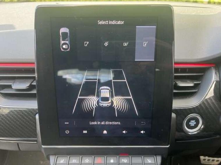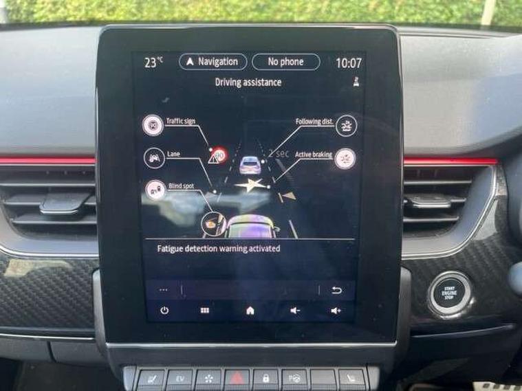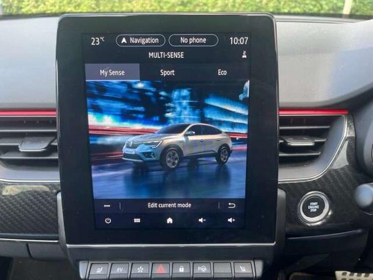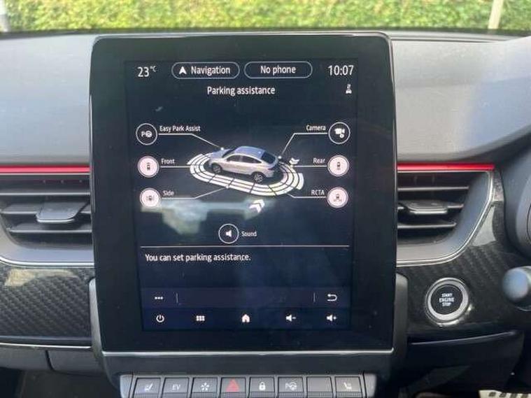 7" TFT Driver information display, Blind spot warning, Bluetooth system, EASY LINK 9.3" portrait touchscreen with navigation, Google search and traffic information, eCall emergency call system, Eco mode, EV button to activate pure mode, Front and rear parking sensors, Gear change indicator, Lane departure warning, Lane keep assist, Multi-sense - 3 driving modes and 8 ambient lighting, Rear cross traffic alert, Rear view camera, Renault automatic emergency assist, Smartphone integration compatible with Apple CarPlay and Android Auto, Traffic sign recognition with over speed prevention, Trip computer, Variable assistance electric power steering, Wireless phone charger, DAB radio, USB port, 3rd brake light, Auto dimming rear view mirror, Automatic headlights, Automatic high / low beam, Automatic windscreen wipers with rain sensor, Black side door protection with gun metal insert, Body coloured bumpers, C-shaped LED front signature lighting, Chrome decopart on wing (fender molding) with R.S. Line badge, Double chromed exhaust tailpipes elements, Extra tinted rear windows and tailgate, Frameless rear view mirror, Front and rear electric windows, Front bumper with F1 blade and honeycomb front grille, Front driver window with one touch facility and anti-pinch function, Front grille with chrome on upper part, Full LED headlights, Glossy black door mirror and lower window lining, Gun Metal front and rear skid plates, Heated rear window, R.S. Line badges on front wing and hatch door, Rain sensor, Rear windscreen wiper, Shiny black shark fin antenna, Side mirrors adjustable electrically, electrically foldable, with defrosting and temperature sensor, automatically foldable at vehicle closure, 3 seat bench in 2nd row, 60:40 split and fixed base rear seats, Aluminium pedals, Automatic climate control with combined filter, humidity sensor and AQS, Black interior roof lining, Carbon style dashboard, Central console with storage, Driver's seat height adjustment, Electrically adjustable front seats, Front and rear head restraints, Height and reach adjustable steering wheel, ISOFIX child seat fixing points on rear outermost seats, LED front and rear roof lights, Passenger seat height adjuster, R.S. line black suede-leather upholstery with red/grey stiching, R.S. Line perforated leather steering wheel with red/black harmony and R.S. Line badge, Rear air vents, Red inserts on air vents, Single front passenger seat, Parking Pack - Hands-free parking & flank protection - Arkana, Winter pack - Arkana, 3x3 point rear seat belts, ABS+EBA, Active emergency braking system, B Brake Mode - One pedal driving with increased regenerative braking, Distance warning alert, Driver airbag, Driver and passenger front and side airbag deactivation, Driver and passenger side airbags, Driver height adjustable seat belt, Electronic parking brake with auto hold, ESC (Electronic Stability Control), Front and rear no seatbelt warning sound, Front curtain airbags, Front head airbags, Hill start assist, Passenger airbag, Tyre pressure warning light, Anti drill door locks and locking fuel cap, Central door locking, Deadlocking system, Hands free keycard with Keyless access and start, RAID (Renault Anti-Intruder Device) automatic door locking, Rear side wing door and window child locking function (front driver door control panel), Superlocking, Thatcham alarm, 18" Silverstone diamond alloy wheels with red inserts,