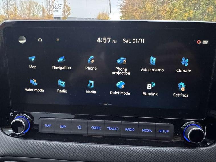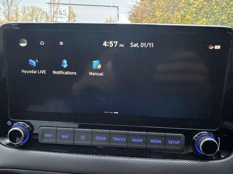 10.25" touchscreen centre console display satellite navigation with live services and mapcare, Blind spot Collision Warning (BCW), Bluetooth connectivity, Cruise control + speed limiter, Digital clock, Driver attention warning, Driver supervision instrument cluster with 10.25" LCD display, eCall emergency call system, Forward collision avoidance assist with pedestrian detection, Front parking sensor, Head up Display, Intelligent speed limit warning, Lane follow assist, Lane keep assist, Leading vehicle departure alert (LVDA), Parking system with rear camera and guidance system, PAS, Phone connection with apple carPlay and android auto, Rear cross traffic collision warning (RCCW), Rear parking sensor, Roadside assistance, Safe exit warning (SEW), Windscreen washer fluid sensor and warning indicator, Wireless phone charging pad, 6 speed intelligent manual transmission, Front and rear USB ports, Krell premium audio system with 8 speakers including external amplifier and subwoofer, RDS and Digital DAB, Steering wheel mounted audio/phone controls, Auto dimming rear view mirror, Automatic headlights with dusk sensor, Automatic windscreen wipers with rain sensor, Body colour door mirrors and handles, Door mirror integrated indicators, Electric front/rear windows with drivers one touch/anti-trap, Electric tilt/slide glass sunroof, Electrically adjustable and heated door mirrors, Front fog lights, LED daytime running lights, LED Headlights, LED rear lights, Painted anthracite body garnish, Positioning Lights - LED, Power folding door mirrors, Privacy glass - Rear windows and tailgate, Rear roof spoiler with integrated LED brake light, Rear side wing doors, Rear skid plate - silver, Rear wiper, Roof rails, Solar glass with front door glass and windscreen shade band, Variable front intermittent wipers, Windscreen auto defog function, 12V power outlet in front console, 3 seat bench in 2nd row, 60/40 split folding rear seat, Adjustable head restraints, Air conditioning climate control, Ambient lighting, Centre interior light, Door scuff plate, Driver and passenger front seat pockets, Driver's seat electric adjustments, Driver's seat electric lumbar support, Driver/passenger sunvisors and illuminated vanity mirrors, Front interior light, Front passenger's seat electric adjustments, Heated front seats, Heated rear seats, Heated steering wheel, Height/reach adjustable steering column, Isofix rear child seat fastenings, Leather upholstery, Leather wrapped steering wheel and gear knob, Luggage compartment lighting, Luggage hooks, Luggage net, Metal paint effect interior door handles, Parcel shelf, Rear centre armrest, Rear centre console with air vents, Single front passenger seat, Sunglasses holder, Ventilated front seats, Vertical adjustment rear head restraints, Trailer wiring package - Kona, Airbags - front, front side and curtain airbags, Anti-lock brake system (ABS), Childproof rear door locks, Downhill brake control, EBD + Brake Assist, Electric parking brake, Electronic stability control, Fasten seatbelt reminder, Fixed 3 point for second row centre passenger seatbelt, Front seatbelt pretensioners, Height adjustable front seatbelts, Hill start assist control (HAC), Passenger airbag deactivate switch, Rear seat alert, Traction control, Tyre pressure monitoring system, Alarm/immobiliser, Deadlocks, Folding key, Locking wheel nuts, Remote central locking, Smart key with keyless entry and engine start/stop button, 18" Alloy wheels,