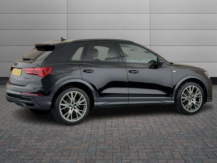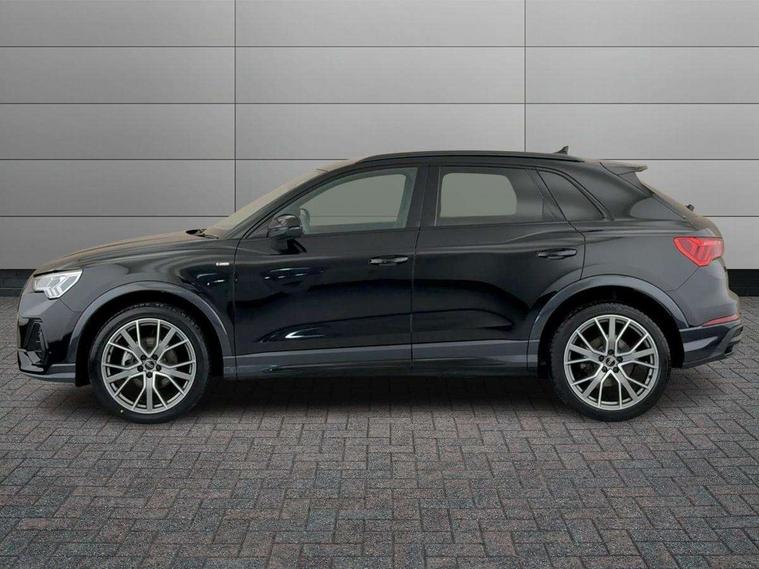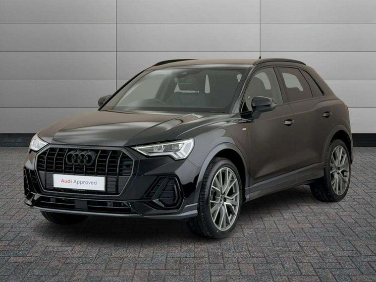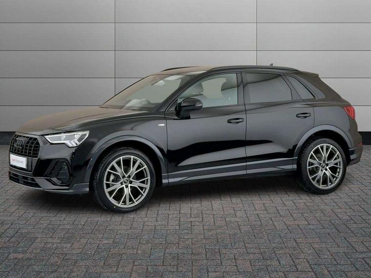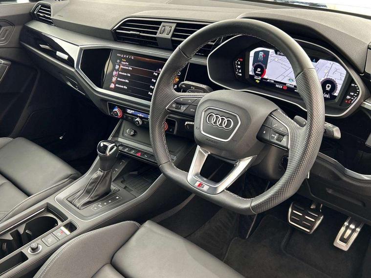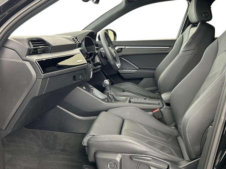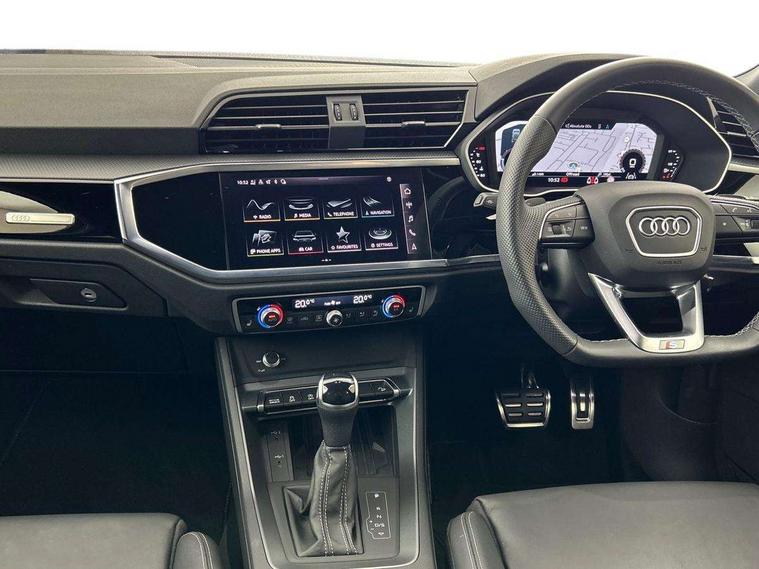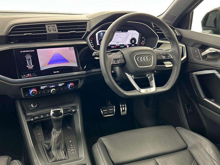 Amazon alexa Integration, Audi connect safety and service, Audi drive select, Audi lane departure warning, Audi Virtual Cockpit - 10.25" display, Bluetooth interface, Camera based traffic sign recognition, Distraction and Fatigue warning, Legal emergency call, MMI Navigation Plus with high resolution 10.1 inch touchscreen colour display, Power operated tailgate, Progressive steering, Service interval indicator, Smartphone interface includes wireless Apple carplay/Android Auto, Start stop system with recuperation, Voice control system with natural language interaction, Diesel particulate filter, Sports suspension, 2 USB-C ports with charge and data functions, 6 passive loudspeakers, DAB digital radio module, Acoustic windscreen, Audi Beam uses LEDs to project the Audi logo onto the ground as you exit your Q3, Auto dimming door mirrors, Auto dimming frameless rear view mirror, Black roof rails, Electrically folding, adjustable and heated door mirrors with integrated LED side indicators and kerb view function for passenger side, Front and rear electric windows, Front fog lights, Grille vertical bars in aluminium silver/Matt, High gloss black finish B and C pillars, LED Dynamic rear indicators, LED headlights with LED daytime running lights, LED rear lights, LED third brake light, Privacy glass dark tinted rear and rear-side windows (from B-pillar backwards), Rain and light sensors, Rear diffuser grille in grained matt black, Rear diffuser strip in matt anthracite black, Rear side wing doors, Rear wiper, S line bumpers in contrasting Manhattan grey, Variable front intermittent wipers, 12V socket in rear centre console, 3 seat bench in 2nd row, 40:20:40 folding with manual adjustment for 60:40 forwards/backwards position and backrest angle, Adjustable rear seat bench/backrest with centre armrest and cupholder, Black cloth headlining, Dual zone electronic climate control, Electric lumbar support, Front and rear black floor mats with contrast stitching in rock grey, Front and rear headrests, Front centre armrest, Height and reach adjustable steering wheel, Illuminated door sill trims with S logo, ISOFIX child seat mounting for front passenger with airbag deactivation and outer rear seat including top tether attachment point for outer rear seats, Manual front seats with height adjustment, Perforated leather gearknob, Single front passenger seat, Stainless steel luggage compartment sill finisher, Stainless steel pedals, Twin leather upholstery with front sport seats + S embossing, Black styling pack - Q3, Non smoking pack - Q3, 3x3 point rear seatbelts, 6 airbags - Driver, front passenger, curtain and side windows, Audi pre-sense front with pedestrain and cyclist recognition, Electrically operated child locks on rear doors, Electromechanical parking brake, Electronic stabilisation control including ABS, ASR and EDL, Front seatbelt reminder, Hill descent control, Hill hold assist, Pre sense basic, Seatbelt monitoring, Tyre pressure warning, Warning triangle and first aid kit, Anti theft alarm, Anti theft wheel bolts, Immobiliser, Remote central locking, Aluminium look interior elements, Detail dashboard around MMI touch colour display in glass look, black with surround in aluminium look, Leatherette door armrest, Piano black inlay,