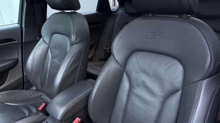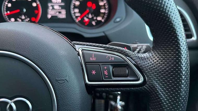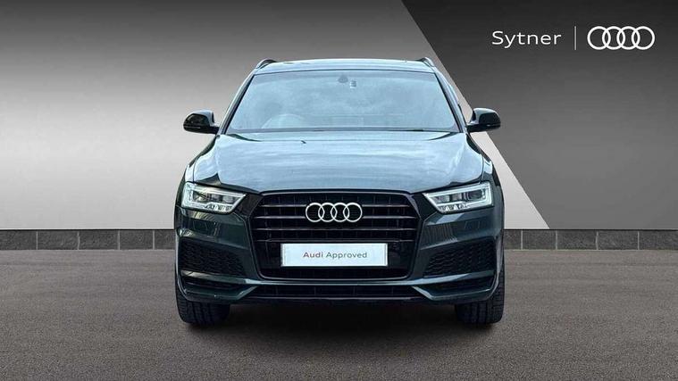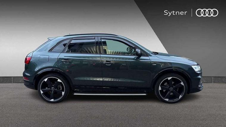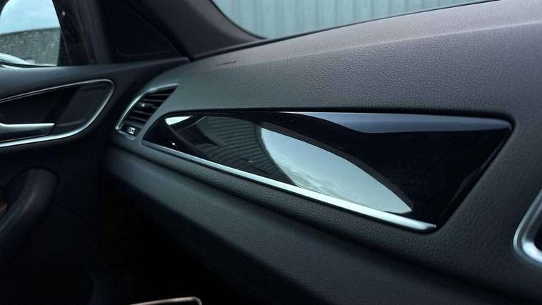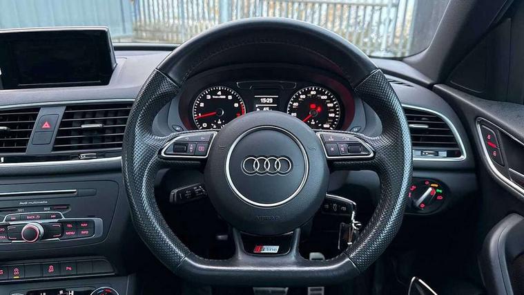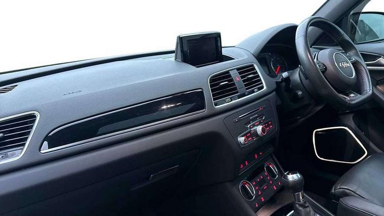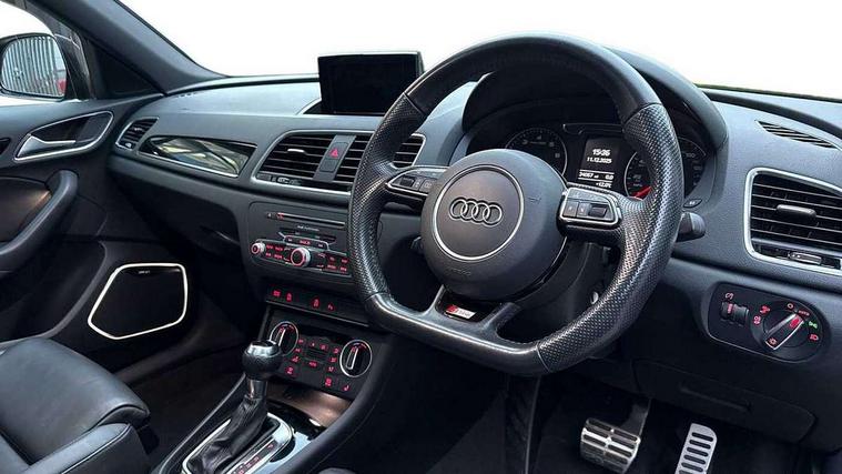 6.5" colour display screen, Audi drive select, Cruise control, Electro-mechanical PAS, Low washer fluid indicator, MMI - Multi Media Interface control system, On board computer, Remote electric boot opening/closing, Service interval indicator, Voice control system, Sports suspension, Audi music interface, BOSE sound system, DAB digital radio module, Acoustic windscreen, Aluminium window surround, Auto dimming rear view mirror, Black exhaust tailpipes, Black high gloss door mirrors, Black roof rails, Coming home function, Door mirror integrated indicators, Front and rear electric windows, Front fog lights, Front lip spoiler, Heated windscreen washer jets, High Gloss Black Contrast Bumpers, High Gloss Black rear spoiler, LED daytime running lights, LED headlights with headlight washers, LED rear lights, Light and rain sensor for auto activation of lights and windscreen wipers, Loading sill protector in stainless steel, Privacy glass, Rear diffuser with platinum insert, Rear wiper, S Line body styling, Sunband for windscreen, 12V socket in rear centre console, 3 spoke flat bottom multi-function perforated leather steering wheel with contrast stitching and aluminium gearshift paddles, Aluminium door sill trims, Aluminium gear knob, Black cloth headlining, Door sill trim strips, Dual zone climate control, Electric front lumbar adjustment, Front and rear headrests, Front and rear velour floor mats, Front centre armrest with storage compartment and angle adjustment, Front sports seats, Height/reach adjust steering wheel, ISOFIX on front passenger and rear outer seats, Jack and tool kit, Retractable luggage cover, Reversible boot floor, Split fold rear seat, Stainless steel pedals, Storage compartment and 12V socket, Under floor storage in luggage area, Audi Exclusive black styling pack - Q3, LED interior light pack - Q3, 3x3 point rear seatbelts, ABS+Electronic Brake force Distribution, Curtain airbags, Driver and passenger airbags, Driver and passenger side airbags, EDL + ASR, Electrically operated child locks on rear doors, Electromechanical parking brake, ESP, First aid kit, Front passenger airbag deactivation, Head airbags, Seatbelt warning light, Tyre pressure monitoring system, Warning triangle, Locking wheel bolts, Remote central locking, Thatcham category 1 alarm + immobiliser, Piano black finish inlay,