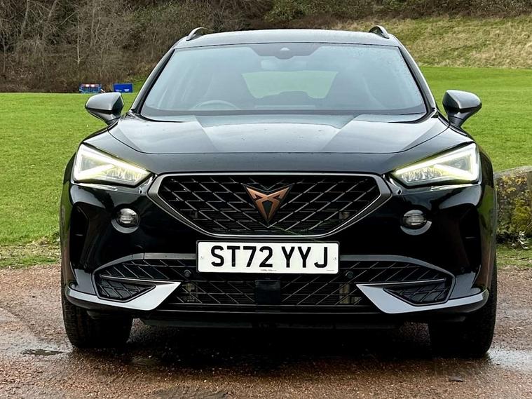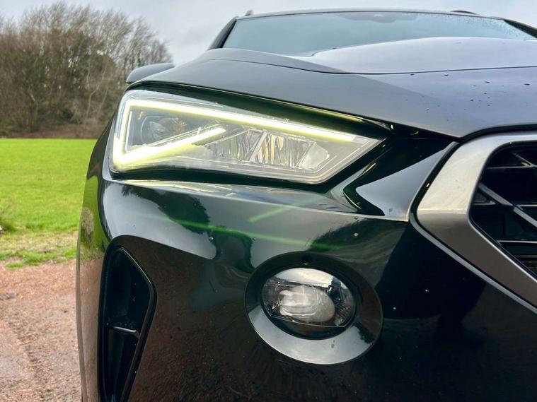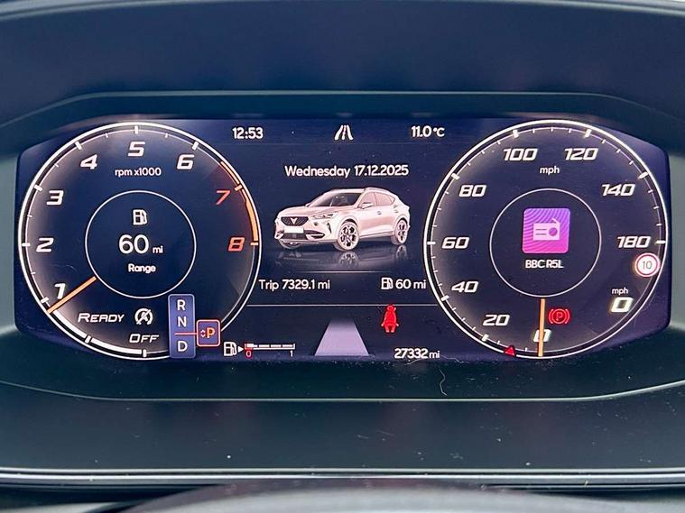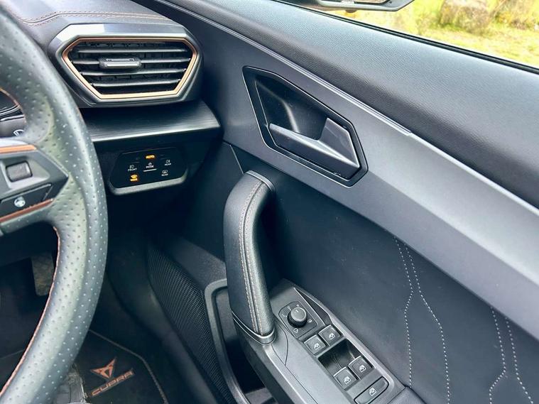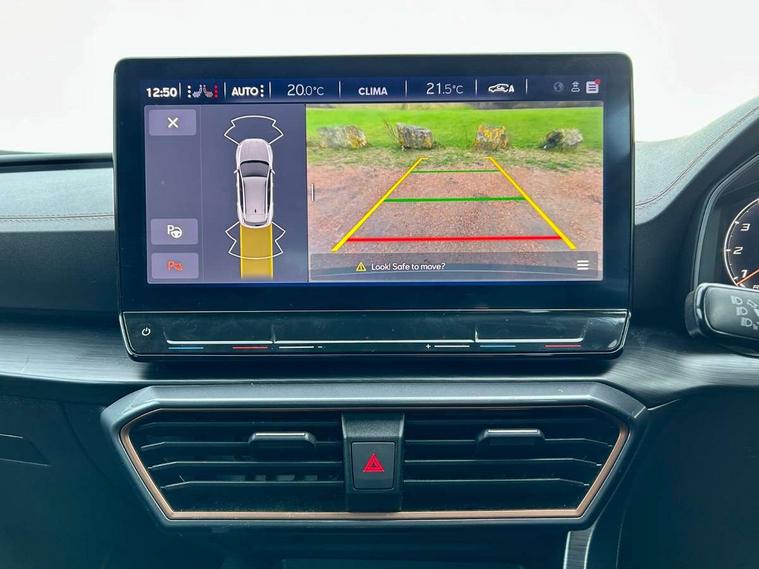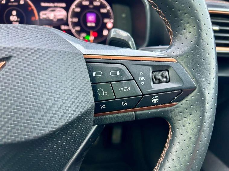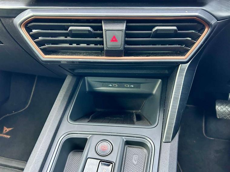 Digital cockpit and configurable dashboard, Driver alert system, Driving profile selection, Forward collision warning with automatic braking, Lane assist, Navigation system with 12'' Touchscreen Display, Park assist (inc front/rear parking sensors), PAS, Predictive adaptive cruise control with speed limiter, Rear view camera, RPM, trip computer, outside temp gauge, instrument light brightness, low fuel warning light, lights on reminder, gearshift indicator, Service interval indicator, Start/stop system with regenerative braking, Voice control system, Wireless apple carplay, Wireless phone charger, Electronic locking differential and dynamic traction support, Standard suspension, 2 front and 2 rear USB type C sockets, Auxiliary input socket, DAB radio, Auto dimming rear view mirror, Body colour door handles, Body coloured bumpers, Dark grey wing mirror, Daytime running light with automatic headlight control and coming home feature, Dynamic headlight range control, Electric front/rear windows, Electrically adjustable heated and folding door mirrors with memory function, Front fog lamps with cornering function, Gloss black roof rails and window surrounds, LED Headlights, LED Taillights with dynamic indicator, Rain sensing wipers, Rear diffuser with black simulated exhaust pipes, Rear side wing doors, Rear wash/wipe, Third brake light, Tinted rear windows, Welcome lights, 12v power supply in centre console, 12V socket, 12v socket in loadspace, 2 front and 2 rear reading lights, 230V socket, 3 seat bench in 2nd row, 60/40 split rear bench seat with armrest and mechanical seat release, Black headlining, Dust/pollen filter, Front and rear head restraints, Front centre armrest, Height/reach adjust steering wheel, Illuminated interior front door sills, Illuminated sunvisor with mirror, Isofix, Leather multi function heated steering wheel with gear shift paddles, Luggage tie-down hooks, Single front passenger seat, Three zone climate control with control panel in rear, Variable luggage/load compartment floor, Wraparound lighting, Genuine Nappa leather Pack - Cupra, 3 point seatbelts on all rear seats, ABS, Brake control system - ESC and brake booster, Child proof door locks, Driver and front passenger airbags with front passenger airbag de-activation, Electronic parking brake, Front and rear disc brakes, Front side curtain airbags, Hill hold control, Public e-call, Seat belt reminder for front and rear seats, Tyre pressure monitoring system, Anti theft alarm system, Keyless entry and start system (KESSY), Locking wheel bolts, Copper and aluminium interior detailing, 19" 'Exclusive' machined sport matte black and silver alloy wheels,