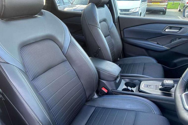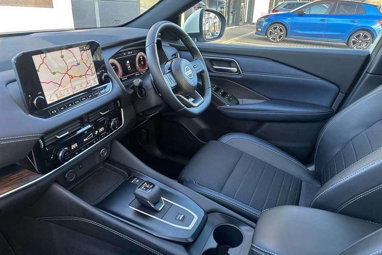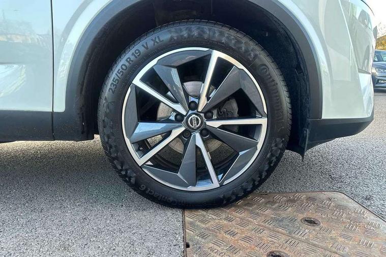 Blind spot warning, Drive modes (sport, normal, eco), Electric speed sensitive power steering, Emergency and breakdown call, Front and rear parking sensors, Full Digital 12.3" TFT Digital Combimeter, Google maps services - search, weather, 3D maps and Google street view, Hands free power tailgate, Idle stop/start system, Intelligent around view monitor, Intelligent Cruise control (ICC), Intelligent driver alert system, Intelligent forward collision warning, Intelligent lane intervention, Lane departure prevention, Lane departure warning system, Moving object detection, Nissan connect 9" touchscreen infotainment system, Nissan connect navigation, Push button starter, Rear cross traffic alert, Remote control services - door locks, lights, horn and car locator, Telematics - notifications and connectivity services, TomTom live traffic services, Traffic sign recognition with legal speed adjustment, Trip computer, Virtual personal assistant and firmware over the air capability, Wireless Apple CarPlay and wired Android Auto, Wireless charging pad, 6 speakers, AM/FM audio system with DAB, Bluetooth audio streaming, Front USB connections (Type-A and Type-C), Rear USB charging only ports (Type-A and Type-C), Auto dimming rear view mirror, Auto rear wiper when reversing, Body colour mirror caps, Body coloured door handles, Bodyside mouldings, Chrome side window finisher, Door handle with button, Dusk sensor, Electric auto folding door mirrors, Electrically adjustable and heated door mirrors with LED turn indicator, Fixed panoramic glass roof with electric sunshade, Follow me home headlights, Front and rear LED turning signals, Intelligent auto headlights, LED daytime running lights, LED rear lights, One touch front and rear electric windows with remote opening and closing, Partially body coloured bumpers, Privacy glass, Rear roof spoiler, Rear side wing doors, Rear styling plate, Roof rails, Shark fin antenna, Splash free rain sensing wipers, Super UV and infrared cut glass, Three blink turn signal, 12v power socket in dashboard and luggage, 2 way electrical driver lumbar adjustment, 2x Rear coat hooks, 3 bench rear seats in 2nd row, 3 rear headrests, 4 folding assist grip, 6 Luggage hooks - 4 on floor, 2 on side, 60/40 split folding rear seat bench, 8 way electric adjustable drivers seat, Ambient lighting around centre console, Ambient lighting in front doors, Centre console storage tray, Chrome interior door handles, Cloth/syntech leather monoform upholstery, Dark headlining, Driver and front passenger sunvisors with illuminated vanity mirrors, Driver seat back pocket, Dual zone automatic climate control with pollen filter, Front and rear door storage, Front cupholders x 2, Front door with bottle holders, Glovebox with light, Hard trunk cover, Height adjustable front headrests, Leather steering wheel, Luggage board system, Luggage space lighting, Manual lumbar support on passenger seat, Manually adjustable passenger (slide recline + lifter), Multifunction steering wheel, Passenger seat back pocket, PVC front centre console and armrest, Rear armrest with 2 cupholders, Rear door bottle holders, Single front passenger seat, Soft PVC kneepad, Steering wheel gearshift paddles, Steering wheel switches, Tilt/telescopic adjustable steering wheel, Two rear isofix child seat anchorage points with top tether, Welcome light and doors with console tray ambient lighting, Heat pack - Qashqai, Tech Pack (ProPILOT + HUD), 3x3 point rear seatbelt pretensioners + load limiters, ABS, ESP, EBD and brake assist, Active brake limited slip, Auto hold function, Child locks on rear doors, Curtain and front side, far side airbags, Driver and passenger airbags, Driver, passenger and 2nd row rear seat belt reminder, Electronic parking brake, Front seatbelt pretensioners + load limiters, Height adjustable front seatbelts, Hill start assist, Intelligent blind spot intervention, Intelligent front emergency braking with pedestrian, cyclist recognition and junction assist, Intelligent rear automatic braking, Tyre pressure monitoring system, Vehicle dynamic control, Capless fuel filler, Engine immobiliser, Nissan i-key, Rear bumper with silver insert, Remote central door locking with deadlocking, Thatcham Cat.1 alarm, 19" Alloy wheels,