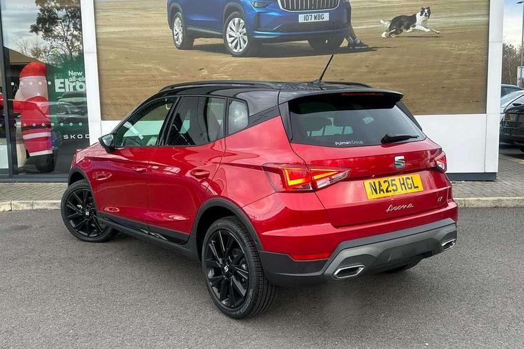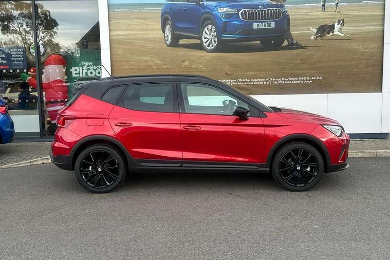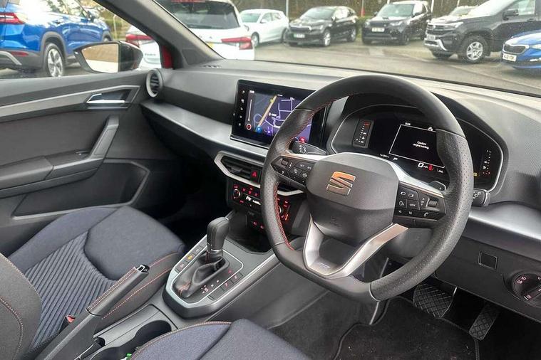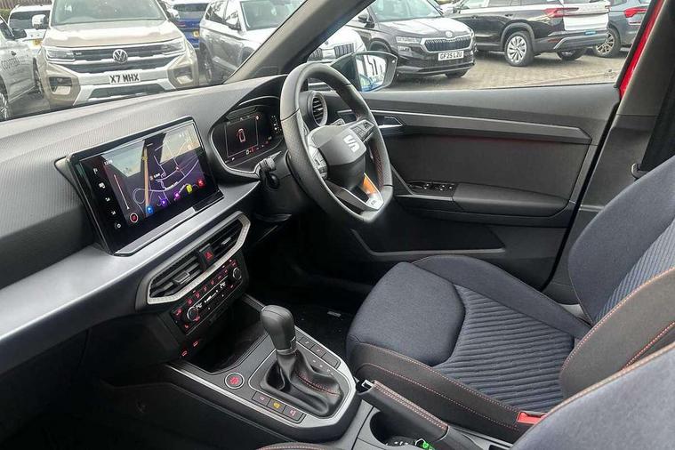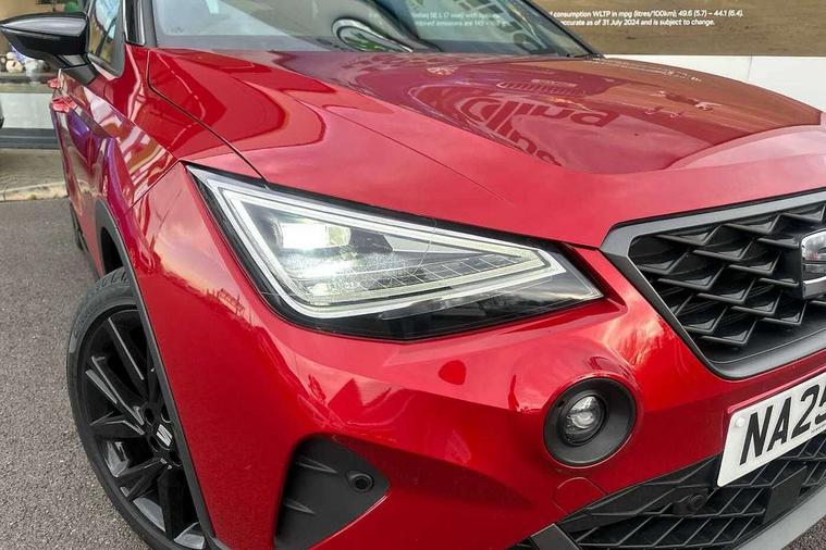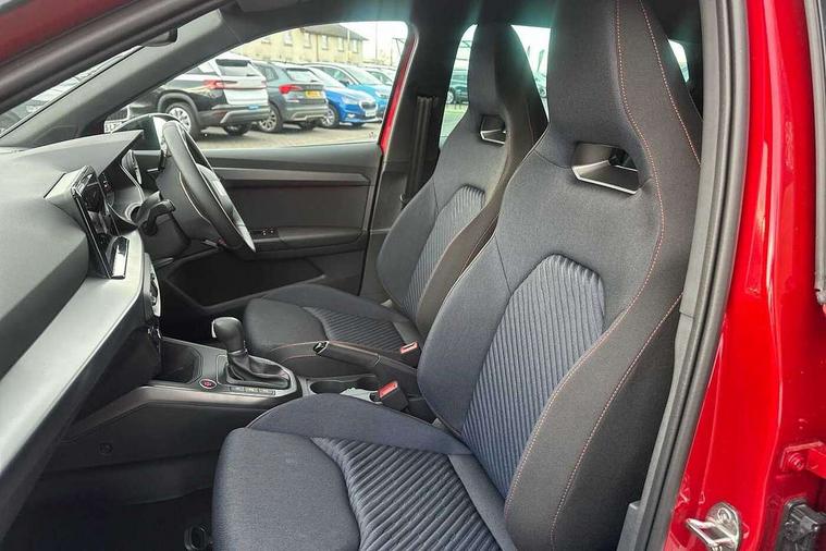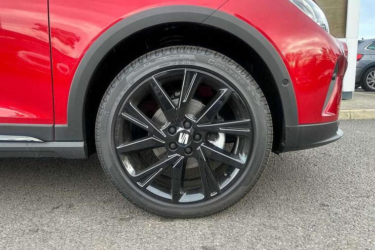 'Lights On' Reminder warning buzzer, 10" Digital cockpit, Digital clock, E-call, Electric speed sensitive power steering, Full link smartphone integration with mirror link, wireless apple carplay, Google android auto + USB Type C cable for apple and android devices, Lane keeping system, Low fuel warning light, Outside temperature display, Park assist system, Rear view camera, RPM counter, SEAT Drive profile - Four different models normal-sport-eco-individual, steering response, throttle response and gear shifts mode, Trip computer, Wireless phone charger, 6 speakers, 9.2" colour touchscreen with navigation system, voice control and USB port (type c), Bluetooth interface for hands free and audio streaming, DAB digital radio and AM/FM radio, Steering wheel mounted audio controls, Anti theft roof antenna, Auto dimming interior rear view mirror, Automatic activation of hazard warning lights, Black roof rails and window surrounds, Black side skirts, Body coloured bumpers, Body coloured door handle inserts, Dark tinted rear windows, Electric front/rear windows, Electrically adjustable, heated and folding door mirrors, Front fog lights with cornering function and rear fog light, FULL LED automatic headlights with dynamic headlight range control, coming and leaving home, LED daytime running lights, Lasered lettering on B pillar, LED rear tail lights and licence plate lights, Protective side mouldings, Rain sensing wipers, Rear side wing doors, Rear spoiler, Rear window wash/wipe, Roof colour door mirrors, Third brake light, Twin exhaust pipe styling hidden exhaust pipe, Visible VIN plate, 2 cupholders, 3 seat bench in 2nd row, 60/40 split folding rear seat, Aircare filter, Black interior roof, Double boot floor, Driver sunvisor with covered mirror + card holder, Dual zone climate control, Front courtesy light with front reading lights, Front seat back storage pockets, Gear shift indicator, Grey interior air vents, Heated front seats, Height adjustable front seats, Height/reach adjustable steering column, Illuminated air vent surrounds, Illuminated boot, Instrument lighting with brightness control, Interior ambient lighting, Interior light in footwell, central console and door panel, ISOFIX points in outer rear seats with top tether anchorage points, Microsuede cloth upholstery, Passenger sunvisor with vanity mirror, Perforated flat bottomed leather steering wheel/gear knob/handbrake with red stitching and FR logo, Potentiometer, Single front passenger seat, Sports cloth bucket seats, Steering wheel mounted gearshift paddles, Two front and three rear height adjustable headrests, Interior chrome pack - Arona, Safe and driving pack (S) - Arona, Safety and driving pack (M) - Arona, ABS, Active front headrests, Child locks on rear doors, Driver and front passenger airbags with front passenger airbag de activation, front side and curtain airbags, Emergency Brake Assist (EBA) and front assist, Front and rear seatbelt reminder, Hill hold control, Multi-Collision braking, Tiredness recognition system, Traction control, Tyre pressure monitoring system, Alarm with back up horn with tow away protection, Deadlock, Electronic engine immobiliser, KESSY Keyless entry and go, Locking wheel bolts, Remote central locking, Titan black dashboard, 18" Black alloy wheels,