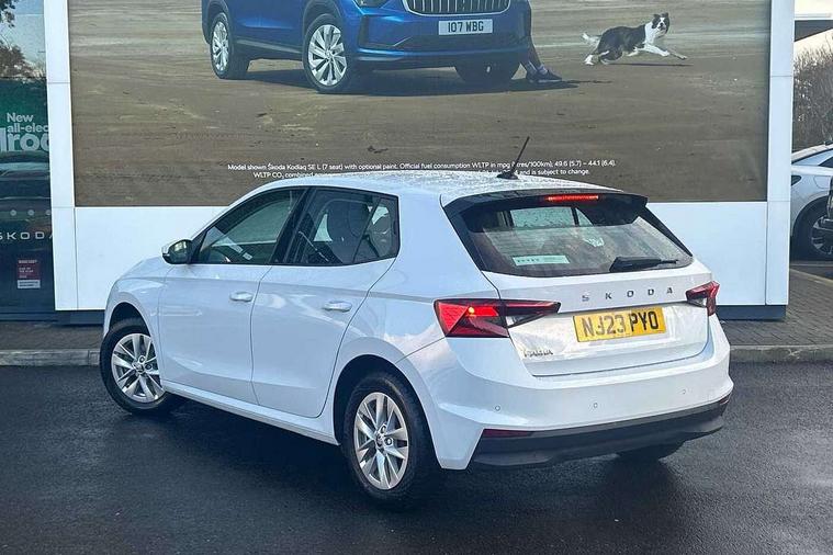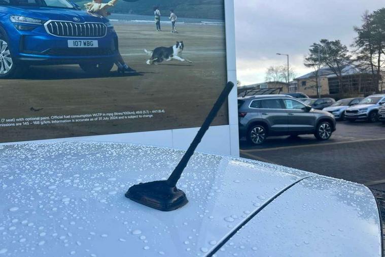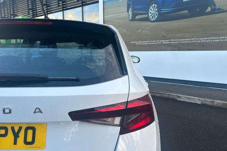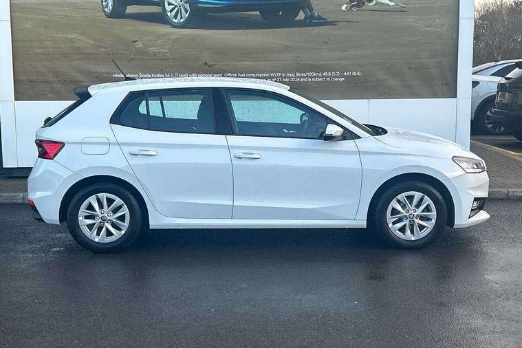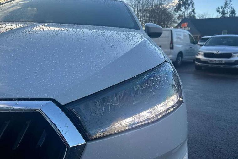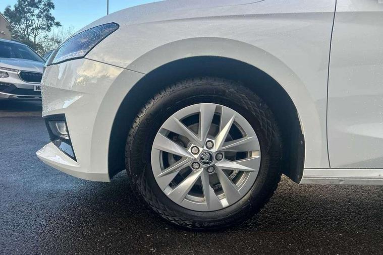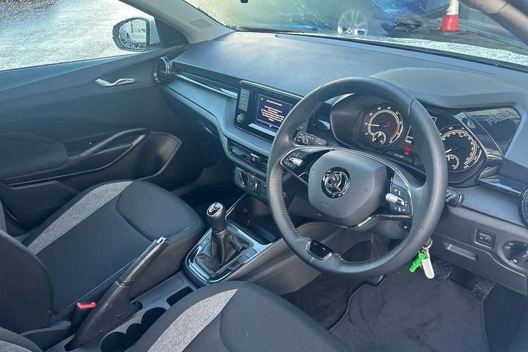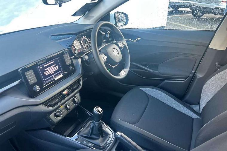 Bluetooth connection, Driver alert system - DAS, Electromechanical power steering, Exterior temperature gauge, Lane assist including road edge detection, Multifunction trip computer in black and white, Service interval indicator, Speed limiter, 2x USB-C in the front (for data transmission and charging), 4 speakers in front, Auxiliary socket for external MP3 player, DAB digital radio reception, Radio Swing with 6.5" colour display, Basic LED Headlights, Basic rear lights, Body colour door mirrors, Body coloured bumpers, Dimming rear view mirror with black frame, Door mirror integrated indicators, Electrically adjustable and heated door mirrors, Electrically adjustable front windows with function auto up/down, Front fog lights, Front window wiper intermittent control, Headlight range control - Automatic, Ice scraper in fuel cap, LED daytime running lights with coming and leaving home feature, Mechanical adjustable rear windows, Rain sensor, Rear LED fog light, Rear side wing doors, Rear window wiper with washing nozzles, Roof mounted spoiler, SKODA tailgate lettering in chrome, Third brake light, 2 reading lights in front and 2 reading lights in rear, 2 spoke leather multifunction steering wheel, 3 rear headrests, Backrest split and folding, Central console with fixed cup holder and storage box, Chrome handbrake release button, Fabric upholstery, Gearshift knob/handle in leather, Grain satin black interior door handles, Hand brake lever handle in leather, Height adjustable front headrests, Height adjustable front seats, Height adjustable steering wheel, ISOFIX and TopTether anchorage points to the outer rear seats, ISOFIX and TopTether on the front passenger seat, Luggage compartment lighting, Manual air conditioning, Manually adjustable lumbar support in front seats, Pollen filter, Rear seat bench unsplit, Single front passenger seat, Storm grey headlining, Sun visors with mirror and airbag label on passenger side, Ticket holder, 3-point height adjustable front seats belts with pretensioner and force limiter, Automatic warning lights in case of crash, Driver and passengers airbag with switch off function, e-Call+, ESC including ABS, MSR, ASR, EDS, HBA and XDS, Front and rear seat belt warning, FRONT ASSIST (AEB City and AEB Inter Urban), Front side airbags, Head airbags, One tone horn, Pedestrian protection, Three rear 3-points safety seat belts with pretensioner and force limiter including stop function for outer rear seat belts, Tyre pressure monitoring system, Anti-theft alarm system including immobiliser, interior monitoring, backup horn, and towing protection, Central locking with radio remote control, interior controls, SAFE function and 2 foldable keys, Black painted air vents, Glossy black decorative trim, Grain satin black central console cover, Grain satin black lower decorative trim, Satin black door and side trim panel in front, Anti-theft wheel bolts protection, Super-low rolling resistance tyres,