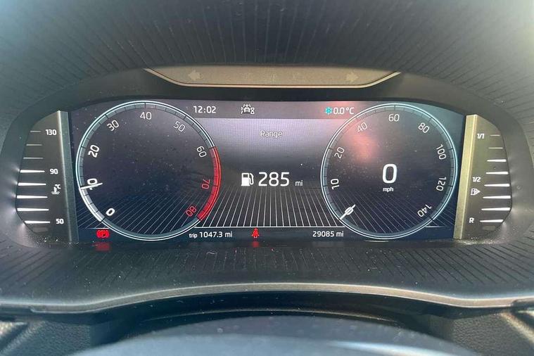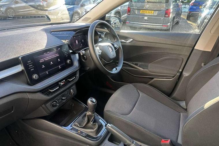 Bluetooth connection, Driver alert system - DAS, Electromechanical power steering, Exterior temperature gauge, Lane assist including road edge detection, Service interval indicator, Virtual cockpit with 10.25" colour display, 2x USB-C in the front (for data transmission and charging), 6 Speakers (4 in front and 2 in rear), Auxiliary socket for external MP3 player, Bolero radio with 8" colour display, DAB digital radio reception, Basic rear lights, Body coloured bumpers, Dimming rear view mirror with black frame, Door mirror integrated indicators, Electrically adjustable and heated door mirrors, Electrically adjustable front windows with function auto up/down, Front window wiper intermittent control, Headlight range control - Automatic, Ice scraper in fuel cap, LED daytime running lights with coming and leaving home feature, Mechanical adjustable rear windows, Privacy glass, Rear LED fog light, Rear side wing doors, Rear window wiper with washing nozzles, Roof mounted spoiler, SKODA tailgate lettering in chrome, Third brake light, 3 rear headrests, Backrest split and folding, Central console with fixed cup holder and storage box, Chrome handbrake release button, Fabric upholstery, Gearshift knob/handle in leather, Grain satin black interior door handles, Hand brake lever handle in leather, Height adjustable front headrests, Height adjustable steering wheel, ISOFIX and TopTether anchorage points to the outer rear seats, ISOFIX and TopTether on the front passenger seat, Luggage compartment lighting, Pollen filter, Rear seat bench unsplit, Single front passenger seat, Storm grey headlining, Sun visors with mirror and airbag label on passenger side, Ticket holder, Umbrella in drivers door, 3-point height adjustable front seats belts with pretensioner and force limiter, Automatic warning lights in case of crash, Driver and passengers airbag with switch off function, e-Call+, ESC including ABS, MSR, ASR, EDS, HBA and XDS, Front and rear seat belt warning, FRONT ASSIST (AEB City and AEB Inter Urban), Front side airbags, Head airbags, One tone horn, Pedestrian protection, Three rear 3-points safety seat belts with pretensioner and force limiter including stop function for outer rear seat belts, Tyre pressure monitoring system, Anti-theft alarm system including immobiliser, interior monitoring, backup horn, and towing protection, Anodized cross line upper decorative trim, Colour Edition air vents, Grain satin black central console cover, Grain satin black lower decorative trim, Satin black door and side trim panel in front, Anti-theft wheel bolts protection, Super-low rolling resistance tyres,