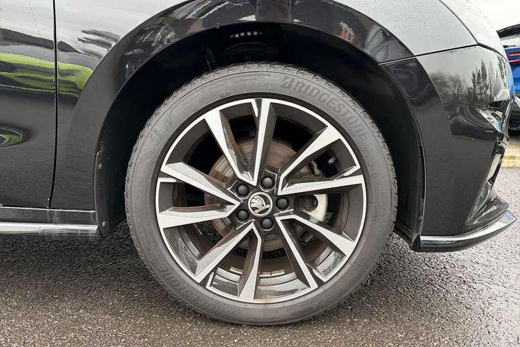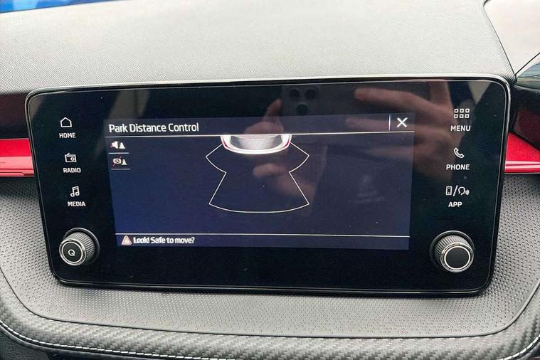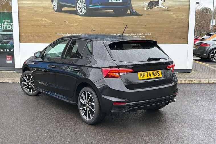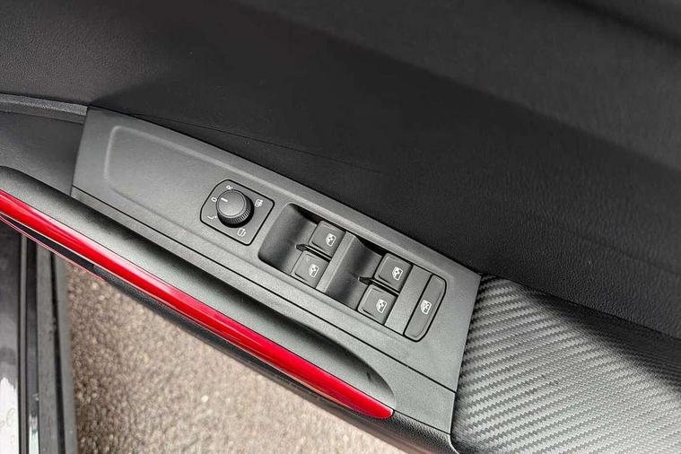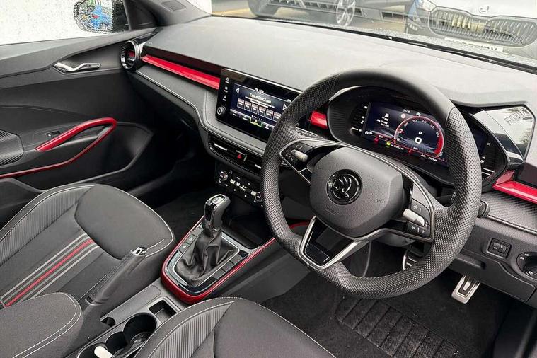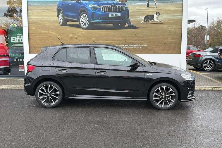 Advanced driver attention and drowsiness monitor, Bluetooth connection, Electromechanical power steering, Exterior temperature gauge, Service interval indicator, Traffic sign recognition, Virtual cockpit with 10.25" colour display, Wireless SmartLink for Apple CarPlay and Android Auto, 6 Speakers (4 in front and 2 in rear), Auxiliary socket for external MP3 player, DAB digital radio reception, Auto dimming rear view mirror, Black radiator grille, Body coloured bumpers, Door mirror integrated indicators, Front and rear electric windows, Front window wiper intermittent control, Headlight range control - Automatic, Ice scraper in fuel cap, LED daytime running lights with coming and leaving home feature, LED rear lights, Monte Carlo badging, Privacy glass, Rear LED fog light, Rear side wing doors, Rear window wiper with washing nozzles, Roof mounted spoiler, SKODA tailgate lettering in black, Sports bumpers, Third brake light, 2 reading lights in front and 2 reading lights in rear, 3 rear headrests, Aluminium pedals, Backrest split and folding, Black headlining, Central console with removable cup holder and storage box, Chrome handbrake release button, Door sills with fabia badging, Dual zone air conditioning with climatronic electronic control, Fabric/artificial leather upholstery, Front centre armrest, Front sports seats, Gearshift knob/handle in leather, Hand brake lever handle in leather, Height adjustable front headrests, Height adjustable front seats, Height adjustable steering wheel, ISOFIX and TopTether anchorage points to the outer rear seats, ISOFIX and TopTether on the front passenger seat, Luggage compartment lighting, Manually adjustable lumbar support in front seats, Metallic painted red central console cover, Metallic red interior door handles, Pollen filter, Rear seat bench unsplit, Single front passenger seat, Sun visors with mirror and airbag label on passenger side, Textile floor mats, Ticket holder, Umbrella in drivers door, 3-point height adjustable front seats belts with pretensioner and force limiter, Automatic warning lights in case of crash, Driver and passengers airbag with switch off function, e-Call+, ESC including ABS, MSR, ASR, EDS, HBA and XDS, Front and rear seat belt warning, FRONT ASSIST (AEB City and AEB Inter Urban), Front side airbags, Head airbags, Hill hold control, One tone horn, Pedestrian protection, Three rear 3-points safety seat belts with pretensioner and force limiter including stop function for outer rear seat belts, Tyre pressure monitoring system, Anti-theft alarm system including immobiliser, interior monitoring, backup horn, and towing protection, Central locking with radio remote control, interior controls, SAFE function and 2 foldable keys, Carbon effect door and side trim panels, Carbon effect lower decorative trim with white stitching, Monte carlo air vents, Red metallic upper decorative trim, Anti-theft wheel bolts protection, Super-low rolling resistance tyres,