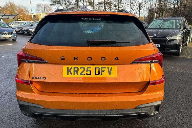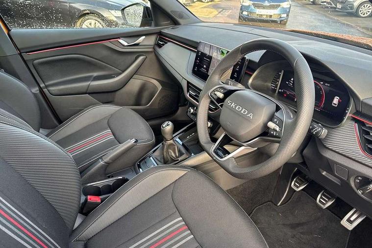 Advanced driver attention and drowsiness monitor, Bluetooth system, E-call, Front assist system, PAS, Rear parking sensors, Rear view camera, Service indicator, Speed limiter, Traffic sign recognition, Virtual cockpit with 10.25" display, Voice control system, Wireless smartlink, 4 USB C ports, 8 Speakers, 9.2" Skoda navigation display, DAB Digital radio, Auto dimming rear view mirror, Automatic headlight control with coming home and leaving home feature, Black door mirrors, Black radiator grille, Black rear diffuser, Black roof spoiler, Body colour bumpers, Body colour door handles, Boot lettering in black, Extended tailgate glass, Fixed panoramic sunroof with black roof rails, Front and rear electric windows, Heated rear window, LED daytime running lights, LED high beam, LED low beam, LED third brake light, Light sensors, Monte carlo plaque, Privacy glass, Rear side wing doors, Rear wiper, Ticket holder inside windscreen, 12V socket in luggage compartment, 3 seat bench in 2nd row, Aluminium pedals, Ambient lighting in white/red, Art leather carbon decor inserts, Art leather carbon door inserts, Black roof lining, Cargo elements, Chrome inner door handles, Driver and passenger sun visors with vanity mirror, Dual zone climate control, Front and rear roof lights, Front centre armrest, Front head restraints, Glove compartment with illumination, Height adjustable driver seat, Height adjustable front passenger seat, Ice scraper, Inner circulation control with pollen filter, ISOFIX on front passenger seat, Isofix preparation for back seats, Leather gearknob and handbrake lever, Manual lumbar support for front seats, Monte Carlo cloth upholstery, Net package and top tether hooks in boot space, Net under rear shelf, Pocket on the back of both front seats include mobile phone pockets, Rake/reach adjustable steering wheel, Reading lights, Rear centre armrests, Red hotstamping, Single front passenger seat, Sports seats, Textile floor mats, Third rear headrest, Top tether for front passenger seat, Umbrella in driver's door, Light and view plus package - Kamiq, 3x3 point rear seatbelts, Airbags - driver and front passenger, Disc brakes, ESP, Extended and predictive pedestrian/cyclist protection, Front passenger airbag deactivation switch, Front side airbags with curtain airbags, Hill hold control, Manual leather parking brake, Manual rear child locks, One tone horn, Seatbelt reminder for driver an co-driver, Traction control, Tyre pressure monitor, Anti-theft alarm system with interior monitoring, backup horn, towing protection and remote central locking with SAFE system, Anti-theft wheel bolts, Electronic engine immobilizer, 18" Ursa black diamond cut alloy wheels,
