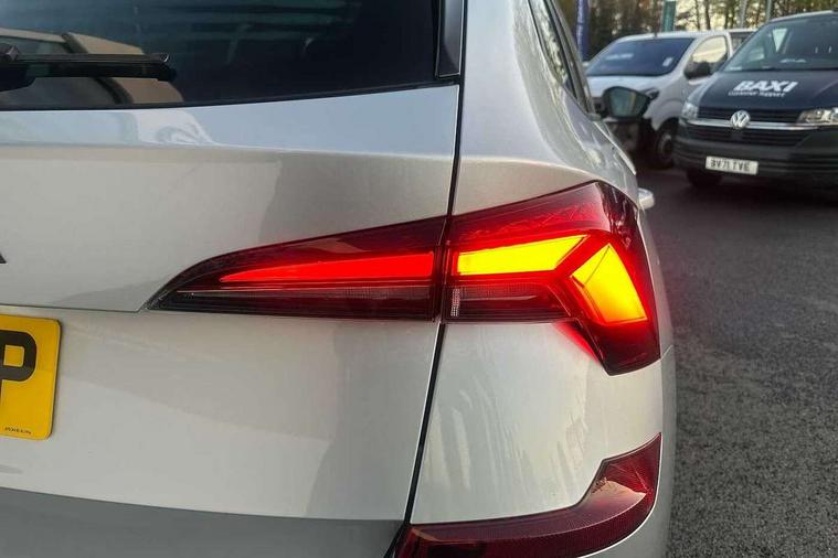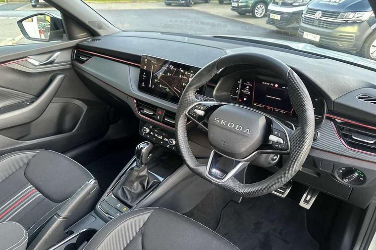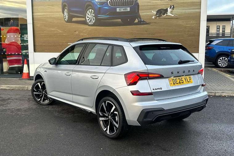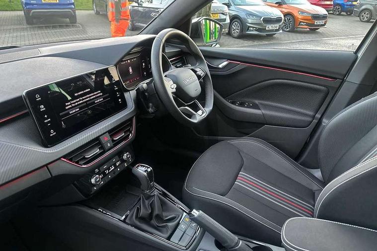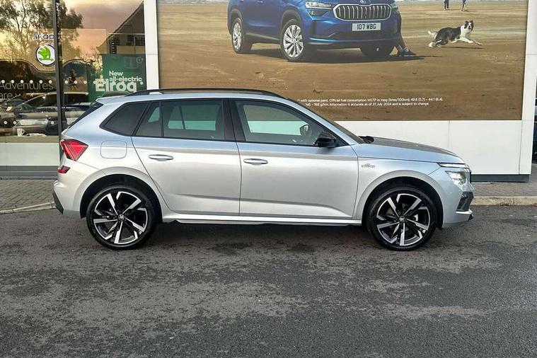 Advanced driver attention and drowsiness monitor, Bluetooth system, E-call, Front assist system, PAS, Rear parking sensors, Rear view camera, Service indicator, Speed limiter, Traffic sign recognition, Virtual cockpit with 10.25" display, Voice control system, Wireless smartlink, 4 USB C ports, 8 Speakers, 9.2" Skoda navigation display, DAB Digital radio, Auto dimming rear view mirror, Automatic headlight control with coming home and leaving home feature, Black door mirrors, Black radiator grille, Black rear diffuser, Black roof spoiler, Body colour bumpers, Body colour door handles, Boot lettering in black, Extended tailgate glass, Fixed panoramic sunroof with black roof rails, Front and rear electric windows, Heated rear window, LED daytime running lights, LED high beam, LED low beam, LED third brake light, Light sensors, Monte carlo plaque, Privacy glass, Rear side wing doors, Rear wiper, Ticket holder inside windscreen, 12V socket in luggage compartment, 3 seat bench in 2nd row, Aluminium pedals, Ambient lighting in white/red, Art leather carbon decor inserts, Art leather carbon door inserts, Black roof lining, Cargo elements, Chrome inner door handles, Driver and passenger sun visors with vanity mirror, Dual zone climate control, Front and rear roof lights, Front centre armrest, Front head restraints, Glove compartment with illumination, Height adjustable driver seat, Height adjustable front passenger seat, Ice scraper, Inner circulation control with pollen filter, ISOFIX on front passenger seat, Isofix preparation for back seats, Leather gearknob and handbrake lever, Manual lumbar support for front seats, Monte Carlo cloth upholstery, Net package and top tether hooks in boot space, Net under rear shelf, Pocket on the back of both front seats include mobile phone pockets, Rake/reach adjustable steering wheel, Reading lights, Rear centre armrests, Red hotstamping, Single front passenger seat, Sports seats, Textile floor mats, Third rear headrest, Top tether for front passenger seat, Umbrella in driver's door, Light and view plus package - Kamiq, 3x3 point rear seatbelts, Airbags - driver and front passenger, Disc brakes, ESP, Extended and predictive pedestrian/cyclist protection, Front passenger airbag deactivation switch, Front side airbags with curtain airbags, Hill hold control, Manual leather parking brake, Manual rear child locks, One tone horn, Seatbelt reminder for driver an co-driver, Traction control, Tyre pressure monitor, Anti-theft alarm system with interior monitoring, backup horn, towing protection and remote central locking with SAFE system, Anti-theft wheel bolts, Electronic engine immobilizer, 18" Ursa black diamond cut alloy wheels,