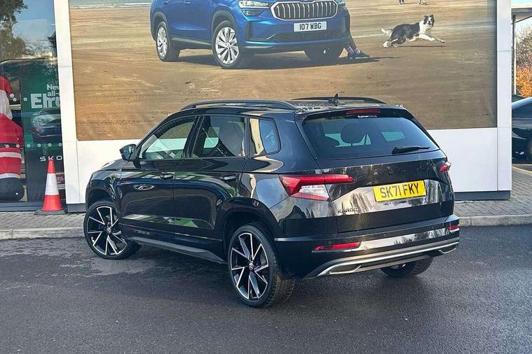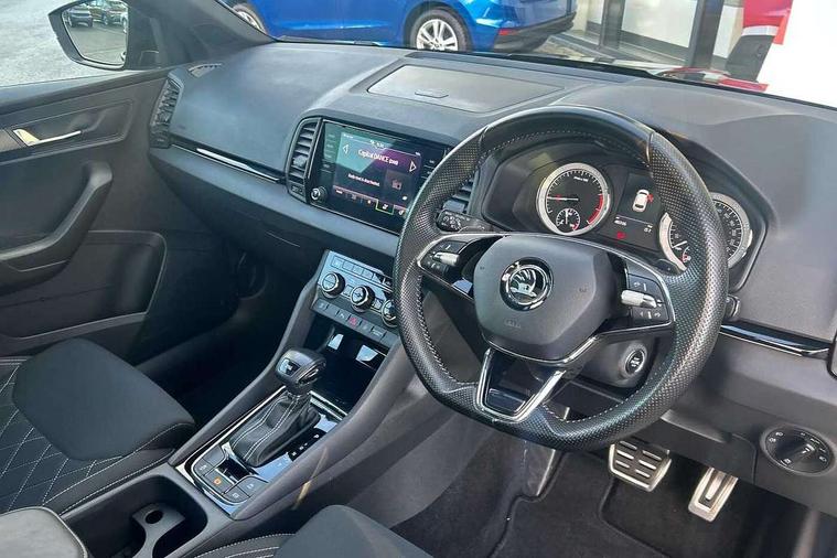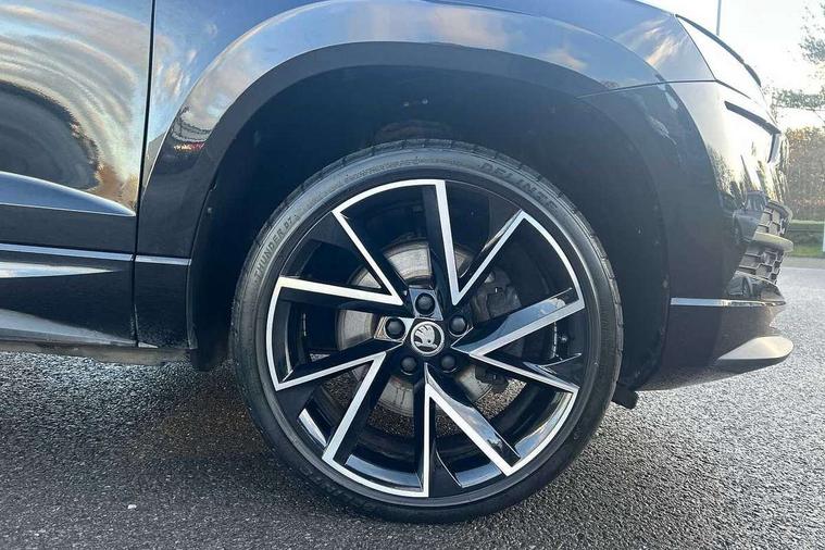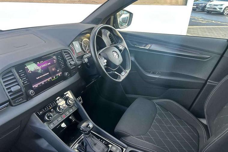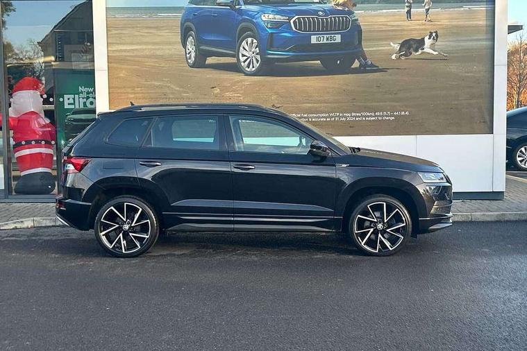 Care connect, Drive mode selector, Driver fatigue sensor, Multifunction colour trip computer, Outside temperature gauge, Service interval indicator, SmartLink wireless for Apple and wired for Android, Start/stop system with regenerative braking, USB C Port x 2 in front centre console, DAB radio with Bluetooth, USB connection, Wireless charging without wireless aerial connection, Acoustic glass, Aero front windscreen wipers with intermittent function, Automatic headlight control system, Black door mirrors, Black electric window control buttons, Black radiator grille, Black roof rails, Body colour door handles, Body coloured bumpers, Electric front and rear windows with child proof lock, Front door steps with SportLine logo, Full LED headlights + adaptive front light system + LED daytime running lights and front cornering fog lights, Headlight washers, Heated rear windscreen, LED rear lights with high functionality, Light assistant (coming/leaving home/tunnel light), Panoramic sliding sunroof, Privacy glass, Protective door side sills in body colour, Rear diffuser, Safety reflectors on front doors, Skoda lettering on tailgate in black, Sportline badge on front fender, Sportline decorative inserts with badging, Sports front and rear bumpers, Third brake light, 1.5 litre bottle holders in driver and front passenger door panels, 12V socket in boot, 12v socket in front centre armrest with storage compartment and rear air vents, 2 Folding hooks and nets in boot, 2 Front readings lights for driver and passenger, 3 rear height adjustable headrests, 4 foldable roof handles with rear coat hooks, Aluminium pedals, Black roof headlining, Cargo elements in boot, Chrome inner door handles, Door sill scuff plates, Driver and passenger seats height adjust, Front head restraints, Height adjustable front three point seats belts with tensioners, Height/reach adjust steering wheel, Ice scraper, Illuminated and cooled glovebox, Illuminated luggage compartment, Isofix child seat preparation outer rear, Manual lumbar support for front seats, Net programme in boot, Pen holder, Pollen filter, Rear reading lights, Rear seats fixed folding and divided 60:40, Retractable parcel shelf attachable to tailgate, Safety vest holder, Solid rear boot cover, Storage box in upper central dashboard closed, Storage compartment below the passenger seat, Sunvisors with illuminated vanity mirrors, Textile floor mats, Umbrella under passenger seat, Welcome animation with sportline logo, LED Interior lighting pack with Skoda welcome logo - Karoq, Airbags - Front side, head, knee and curtain, Automatic door unlocking in case of crash, Automatic fuel cut off in case of crash, Driver airbag, Electronic parking brake with auto hold function, Emergency rear braking signal, ESC including ABS, MSR, ASR, EDS, HBA, DSR, RBS, MKB and traction control, Front assist radar scanning of the space in front of the car with automatic braking, Hill hold control, Passenger airbag with switch-off function, Pedestrian monitor, Seatbelt reminder signalisation and pretensioner for all seats, Three point seatbelts rear, Two tone horn, Tyre pressure display, Tyre pressure monitor, Alarm with interior monitoring, back up horn and tilt sensor with safe function, Electronic engine immobiliser, Keyless entry and keyless start with safe system, Remote central locking with 2 remote folding keys, Black air vent surround, 19" Vega anthracite alloy wheels, Anti-theft wheel bolts protection, Storage on wheel cover,