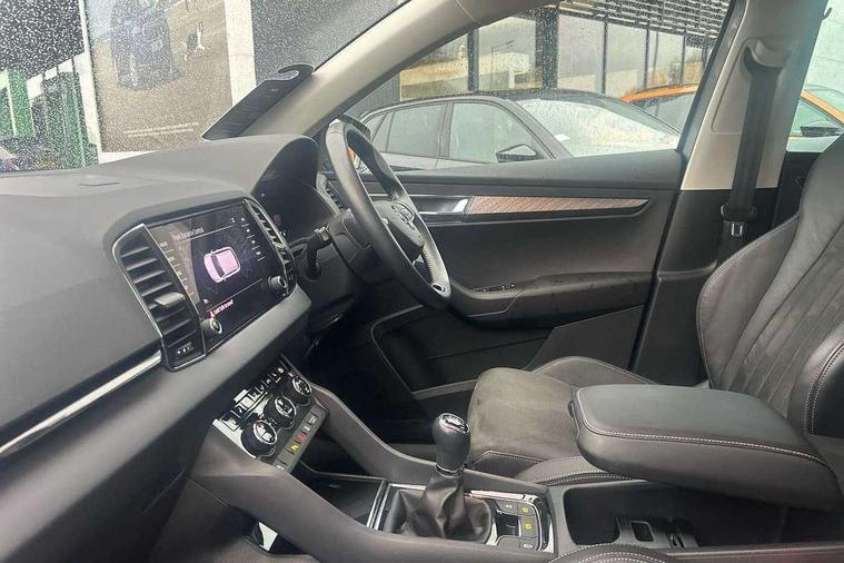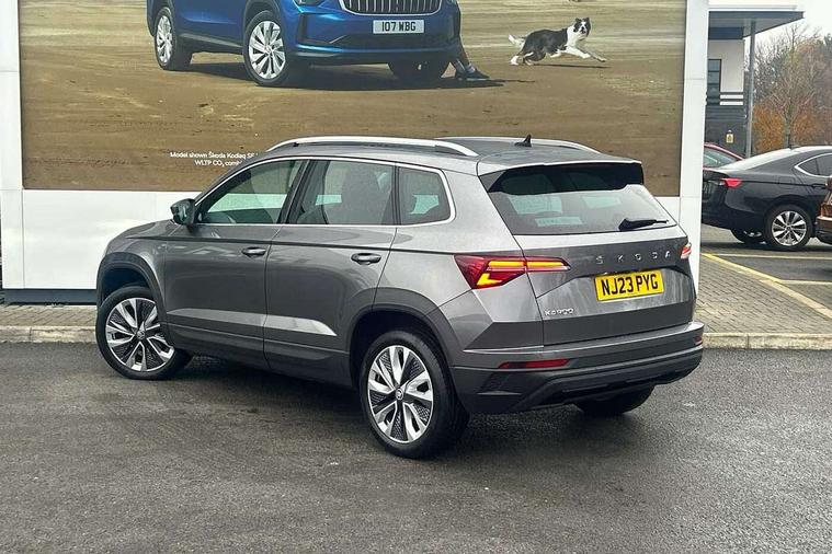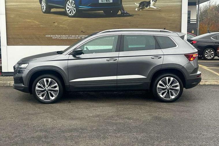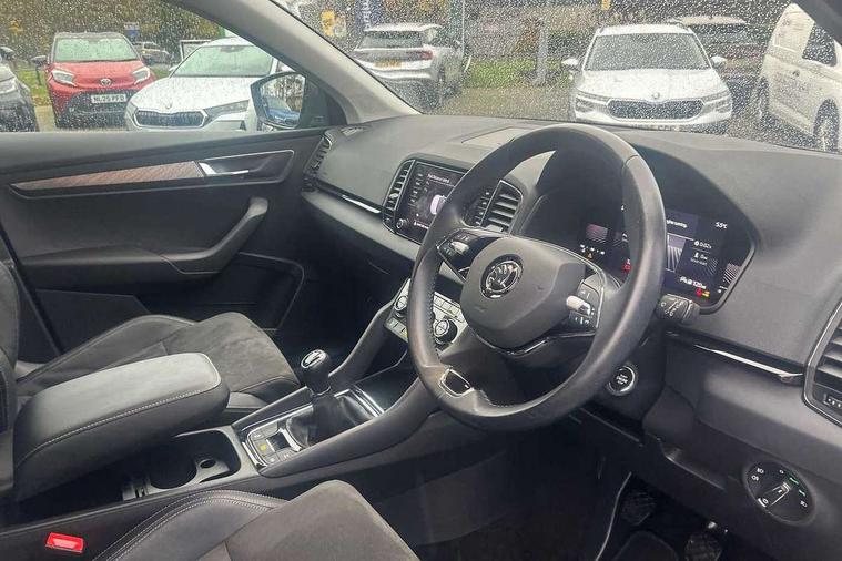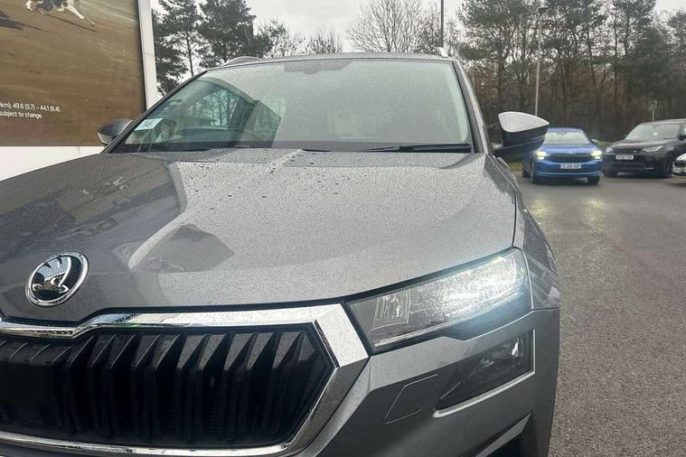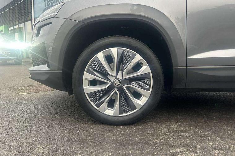 8" Digital display, Care connect, Drive mode selector, Driver fatigue sensor, Electro-mechanical PAS, Emergency services call system, Outside temperature gauge, Service interval indicator, SmartLink wireless for Apple and wired for Android, Start/stop system with regenerative braking, USB C Port x 2 in front centre console, 8 Speakers, DAB radio with Bluetooth, USB connection, Acoustic glass, Aero front windscreen wipers with intermittent function, Auto dimming rear view mirror with light and rain sensors, Black electric window control buttons, Body colour door mirrors and handles, Dynamic headlight range control with cornering light function, Electric front and rear windows with child proof lock, Heated rear windscreen, LED daytime running lights, LED rear lights with high functionality welcome effect and dynamic indicators, Light assistant (coming/leaving home/tunnel light), Plastic scuff plates, Privacy glass, Rear side wing doors, Rear spoiler, Rear window wiper with washer system and intermittent control, Safety reflectors on front doors, Third brake light, 1.5 litre bottle holders in driver and front passenger door panels, 12V socket in boot, 12v socket in front centre armrest with storage compartment and rear air vents, 2 Folding hooks and nets in boot, 2 spoke leather heated multifunction steering wheel, 2 x Tablet holder, 3 rear height adjustable headrests, 3 seat bench in 2nd row, 4 foldable roof handles with rear coat hooks, Black floor carpet, Chrome inner door handles, Decorative door sills with KAROQ badging, Double sided boot floor, Foldable hooks in the boot, Front head restraints, Height adjustable front three point seats belts with tensioners, Height/reach adjust steering wheel, Ice scraper, Illuminated glovebox, Illuminated luggage compartment, Isofix child seat preparation for front passenger seat, Isofix child seat preparation outer rear, Manual lumbar support for front seats, Pen holder, Pollen filter, Rear boot cover, Rear reading lights, Rubbish bin door, Safety vest holder, Single front passenger seat, Storage box in upper central dashboard closed, Sunvisors with illuminated vanity mirrors, Textile floor mats, Ticket holder, VarioFlex seats with standard rear seat release, Chrome roof rails + chrome pack - Karoq, Parking pack - Karoq, Automatic door unlocking in case of crash, Automatic fuel cut off in case of crash, Child locks on rear doors, Driver airbag, Electronic parking brake with auto hold function, Emergency rear braking signal, ESC including ABS, MSR, ASR, EDS, HBA, DSR, RBS, MKB and traction control, Front side airbags, Hill hold control, Knee airbags, Passenger airbag with switch-off function, Pedestrian monitor, Seatbelt reminder signalisation and pretensioner for all seats, Three point seatbelts rear, Two tone horn, Tyre pressure display, Tyre pressure monitor, Alarm with interior monitoring, back up horn and tilt sensor with safe function, Electronic engine immobiliser, Keyless entry and start/stop, Remote central locking with 2 remote folding keys, Chrome framed air vents, 18" Procyon silver alloy wheels with anthracite aero inserts, Anti-theft wheel bolts protection, Storage on wheel cover, Tool kit,