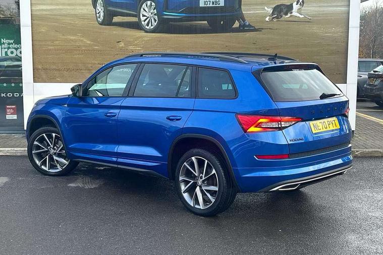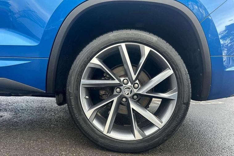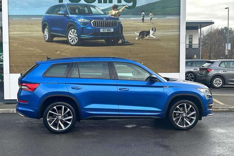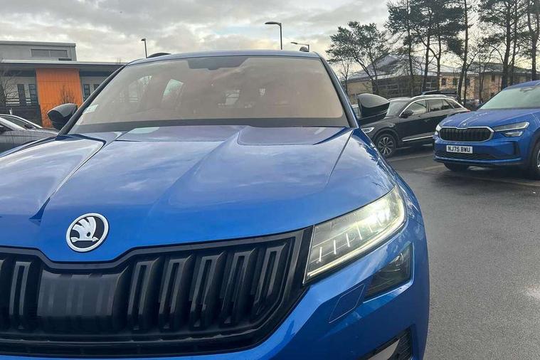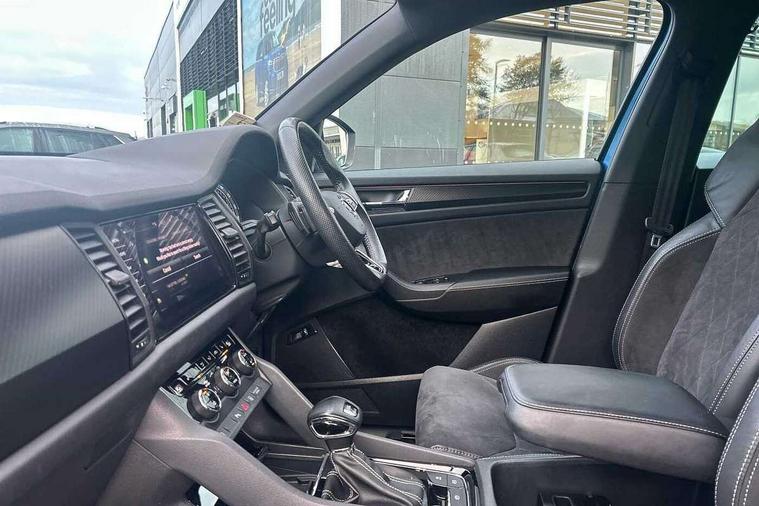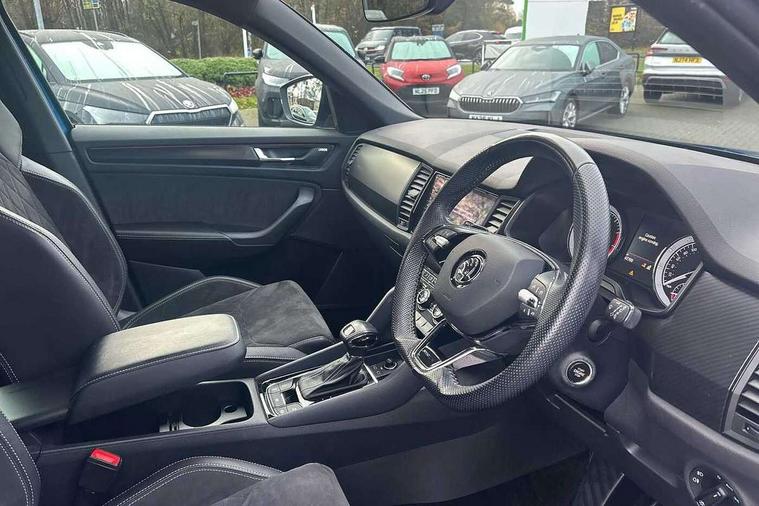 Bluetooth system, Columbus satellite navigation with 9.2" touch screen and integrated Wi-Fi + WLAN and web radio, Digital voice enhancement, ECO Stop/start function, Exterior temperature indicator, Map care, Progressive power assisted steering, SmartLink plus, Speed limiter, Sports dials, Tailgate unlocking from outside, USB C Port x 2 in front centre console, Bolero Radio, DAB Digital radio, DVD System, Aero front windscreen wipers with intermittent function, Aero rear window wiper, Auto dimming rear view mirror, Automatic activation of hazard warning lights, Black electric window control buttons, Black roof rails and door mirrors with radiator grille and window surrounds, Black wheel arch surrounds, Body colour bumpers, Body colour door handles, Chrome exhaust tailpipe, Electric front and rear windows, Electrically adjustable/heated/foldable and auto dimming door mirrors with memory function, Front door steps with SportLine logo, Full LED Headlights with adaptive front light system and LED daytime running lights, Headlight washers, Heated rear window, LED front fog lights with static cornering light function, LED rear fog light, LED third brake light in rear spoiler, Light assistant (coming home/tunnel light), Rain and light sensors, Rear diffuser, Rear spoiler, Safety reflectors on front and rear doors, Sportline badge on front fender, Sports front and rear bumpers, Sunset privacy glass, Tailgate lettering in Black, Without engine designation, 12V socket in boot, 2 rails with 2 hooks including 4 hooks for net programme, 3 spoke leather sports heated multi-function steering wheel with hands off detection, 4 foldable roof handles with rear coat hooks, 4 lashing points on luggage floor, 60:40 foldable rear seat with sliding adjustment and backrest angle adjustment, Alcantara door panels, Alcantara/Leather upholstery with Sport seats with silver stitching, Aluminium pedals, Black roof headlining, Bottle holders in door panel in the 1.5 litre front and 1 litre rear, Cargo storage compartments, Centre console with open storage box, cup holder and 12V socket, Chrome headlight control button, Chrome interior door handles, Coat hooks on B pillar, Covered storage compartment on driver side, Front and rear door armrest with black adductor trim, Front and rear height adjustable headrests, Front centre armrest with storage compartment, cup holder and 12V socket, Front courtesy lights, Gear shift lever with chrome frame and black gloss insert, Illuminated and cooled glovebox, Illuminated luggage compartment, Isofix child seat fittings in outer rear seats with top tether, Manually adjustable steering column, Net programme in boot (1x horizontal Net, 2x vertical Nets), Overhead glasses storage compartment, Paddles on steering wheel for DSG gearbox, Pollen filter, Rear centre armrest with cupholders, Roll up luggage compartment cover with intermediate position, Small Bags on the inner sides of the front backrests, Storage compartment in lower middle instrument panel with closing, Three rear height adjustable headrests, Ticket holder on A Pillar, Umbrella in door panel, LED Interior Light pack - Kodiaq Scout/Sport Line/VRS/Laurin + Klement, Auto door release and activation of warning lights in the event of an accident, Driver and passenger airbags, Electronic parking brake with hill hold control, Emergency rear braking signal, ESC (incl. ABS+MSR+ASR+EDS+HBA+DSR+RBS+MKB), Front and rear three point safety belt on all seats, Front assist includes AEB city/urban, Front passenger airbag deactivation switch, Front side airbags, Fuel cut off safety device, Head and knee airbags, Rear disc brakes, Safety vest holder in door, Seat belt reminder for all seats, Two tone horn, Tyre pressure monitor, Warning lights in front doors, Alarm with interior monitoring and tilt sensor with safe function, Immobiliser, Keyless entry and start system (KESSY), Remote central locking, Carbon finish dashboard and door inserts, Chrome air vent surrounds, 20" Vega Anthracite alloy wheels with anti-theft wheel bolts,