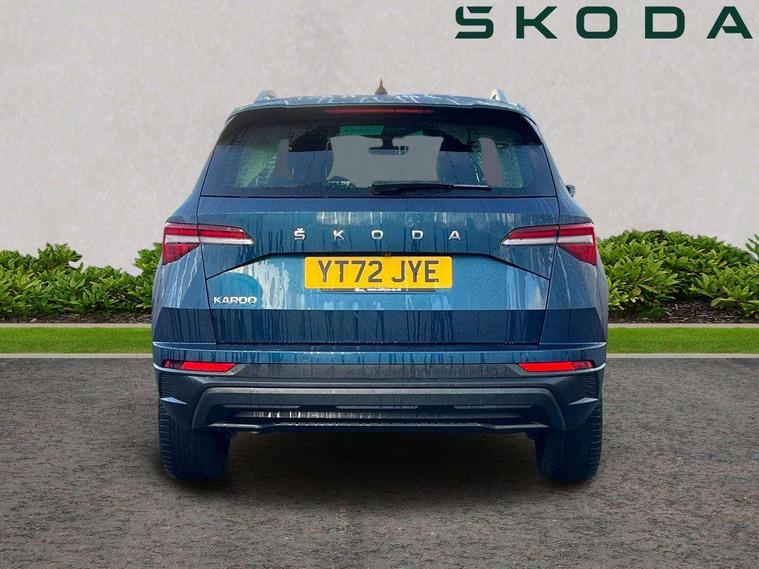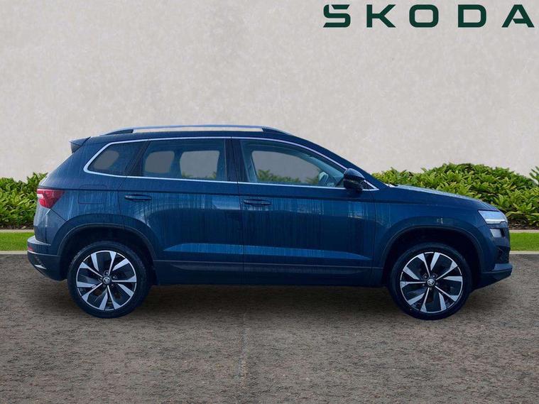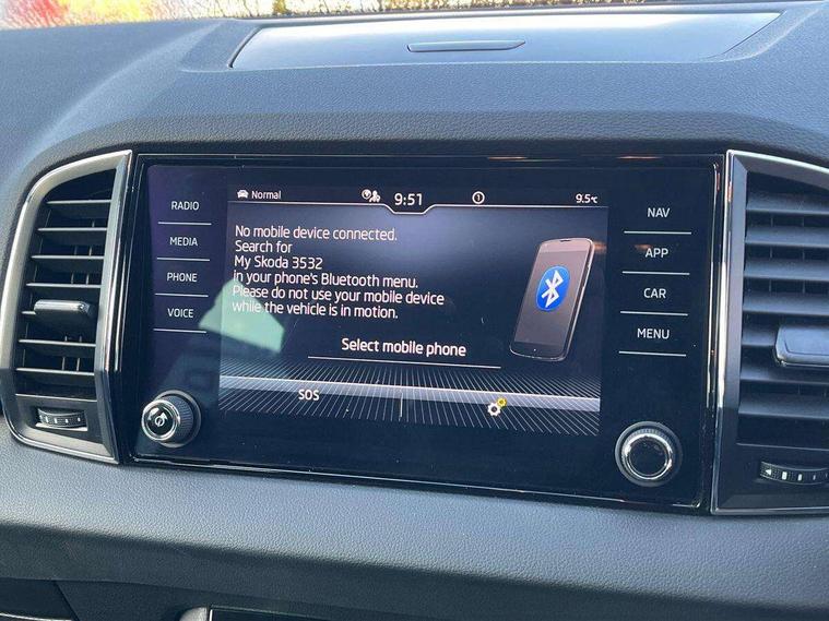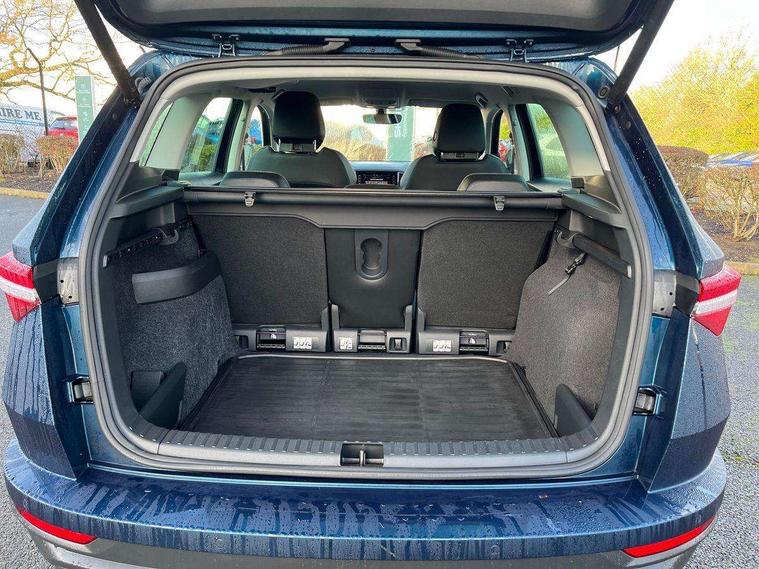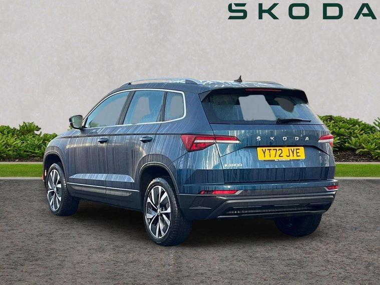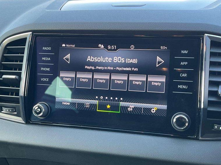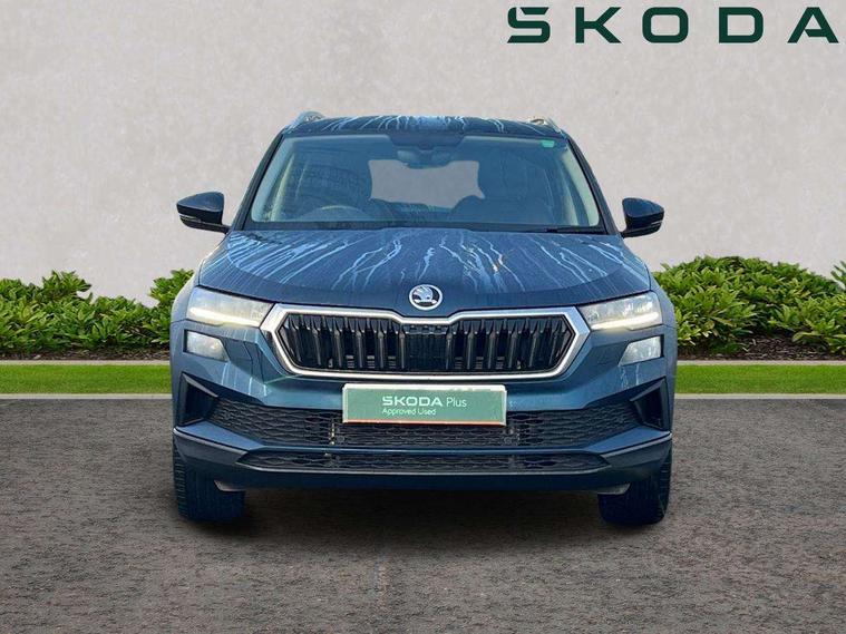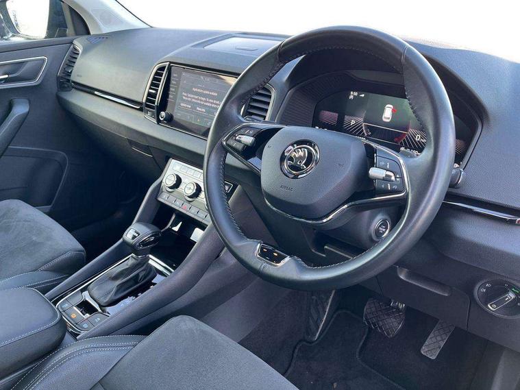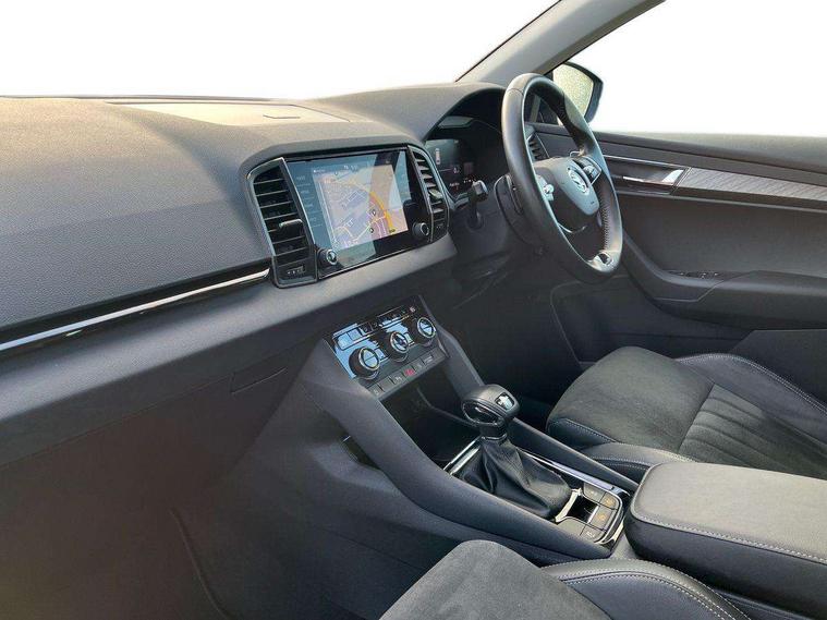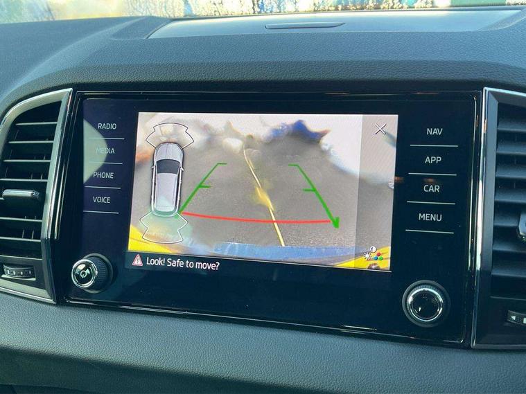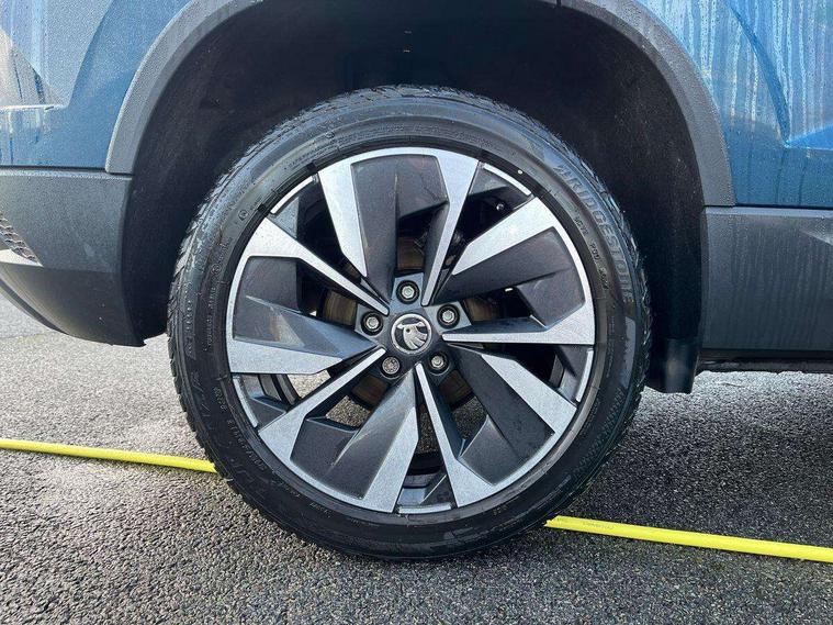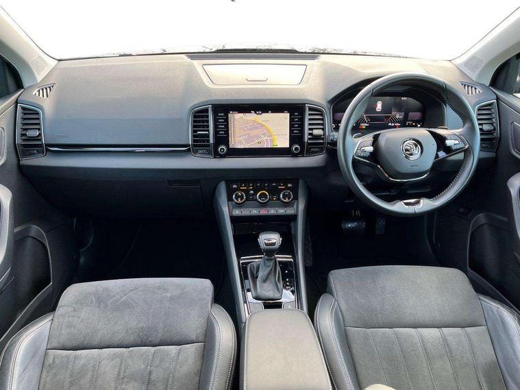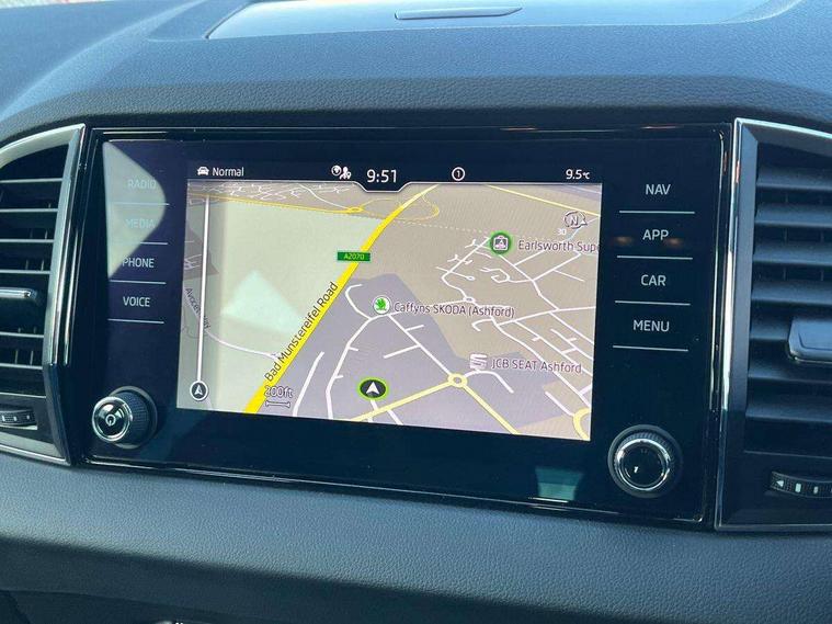 8" Digital display, Care connect, Colour multifunction trip computer, Driver fatigue sensor, Emergency services call system, Outside temperature gauge, Service interval indicator, SmartLink wireless for Apple and wired for Android, Start/stop system with regenerative braking, USB C Port x 2 in front centre console, 8 Speakers, DAB radio with Bluetooth, USB connection, Acoustic glass, Aero front windscreen wipers with intermittent function, Auto dimming rear view mirror with light and rain sensors, Automatic headlight control system, Black electric window control buttons, Body colour door mirrors and handles, Electric front and rear windows with child proof lock, Heated rear windscreen, LED daytime running lights, LED rear lights with high functionality welcome effect and dynamic indicators, Light assistant (coming/leaving home/tunnel light), Plastic scuff plates, Privacy glass, Rear side wing doors, Rear spoiler, Rear window wiper with washer system and intermittent control, Safety reflectors on front doors, 1.5 litre bottle holders in driver and front passenger door panels, 12V socket in boot, 12v socket in front centre armrest with storage compartment and rear air vents, 2 Folding hooks and nets in boot, 2 spoke leather heated multifunction steering wheel with DSG paddles, 2 x Tablet holder, 3 rear height adjustable headrests, 3 seat bench in 2nd row, 4 foldable roof handles with rear coat hooks, Black floor carpet, Chrome inner door handles, Decorative door sills with KAROQ badging, Double sided boot floor, Foldable hooks in the boot, Front head restraints, Height adjustable front three point seats belts with tensioners, Height/reach adjust steering wheel, Ice scraper, Illuminated glovebox, Illuminated luggage compartment, Isofix child seat preparation for front passenger seat, Isofix child seat preparation outer rear, Manual lumbar support for front seats, Pen holder, Pollen filter, Rear boot cover, Rear reading lights, Rubbish bin door, Safety vest holder, Single front passenger seat, Storage box in upper central dashboard closed, Sunvisors with illuminated vanity mirrors, Textile floor mats, Ticket holder, VarioFlex seats with standard rear seat release, Chrome roof rails + chrome pack - Karoq, Parking pack - Karoq, Automatic door unlocking in case of crash, Automatic fuel cut off in case of crash, Child locks on rear doors, Driver airbag, Electronic parking brake with auto hold function, Emergency rear braking signal, ESC including ABS, MSR, ASR, EDS, HBA, DSR, RBS, MKB and traction control, Front side airbags, Hill hold control, Knee airbags, Passenger airbag with switch-off function, Pedestrian monitor, Seatbelt reminder signalisation and pretensioner for all seats, Three point seatbelts rear, Two tone horn, Tyre pressure display, Tyre pressure monitor, Alarm with interior monitoring, back up horn and tilt sensor with safe function, Electronic engine immobiliser, Keyless entry and start/stop, Remote central locking with 2 remote folding keys, Chrome framed air vents, Anti-theft wheel bolts protection, Storage on wheel cover, Tool kit,