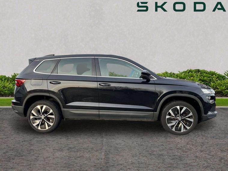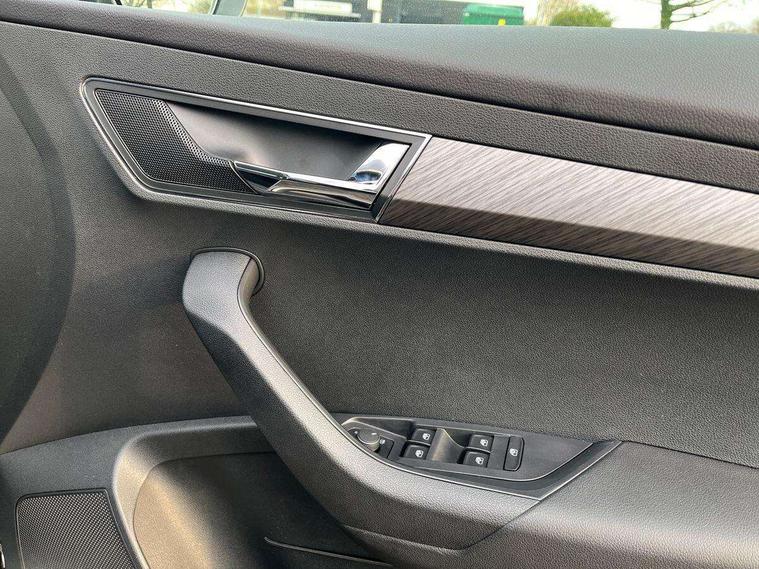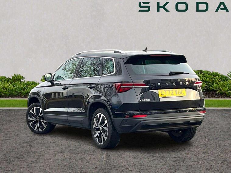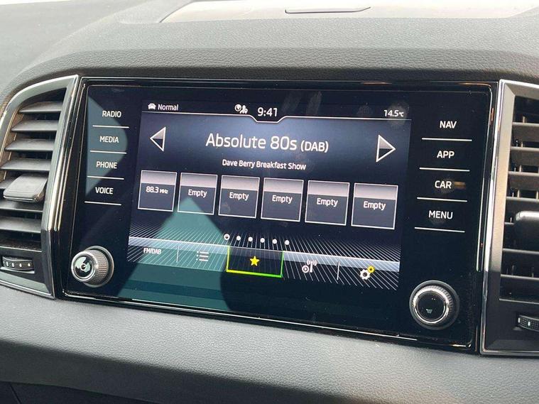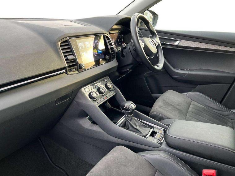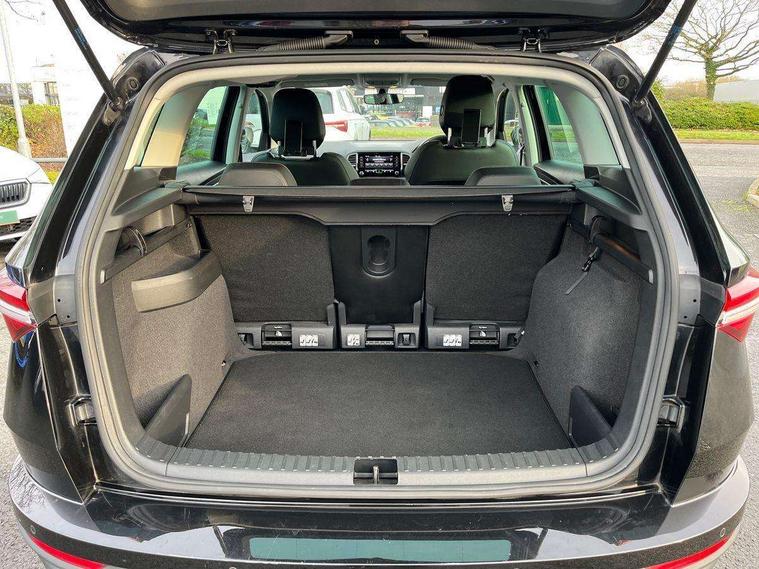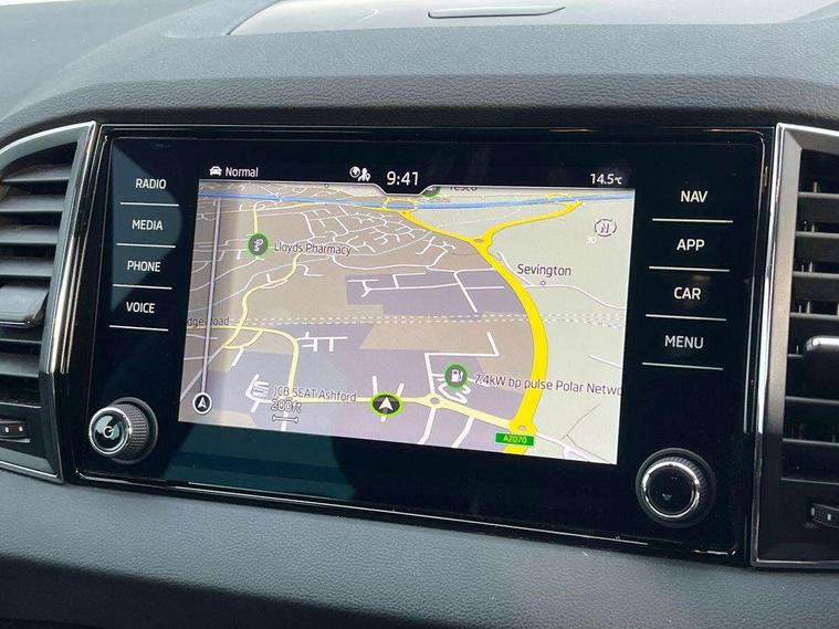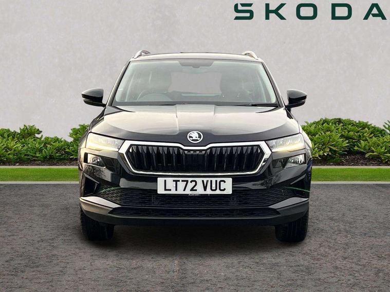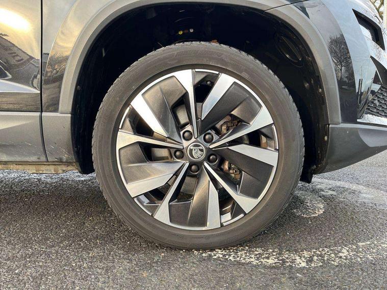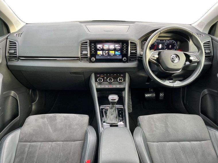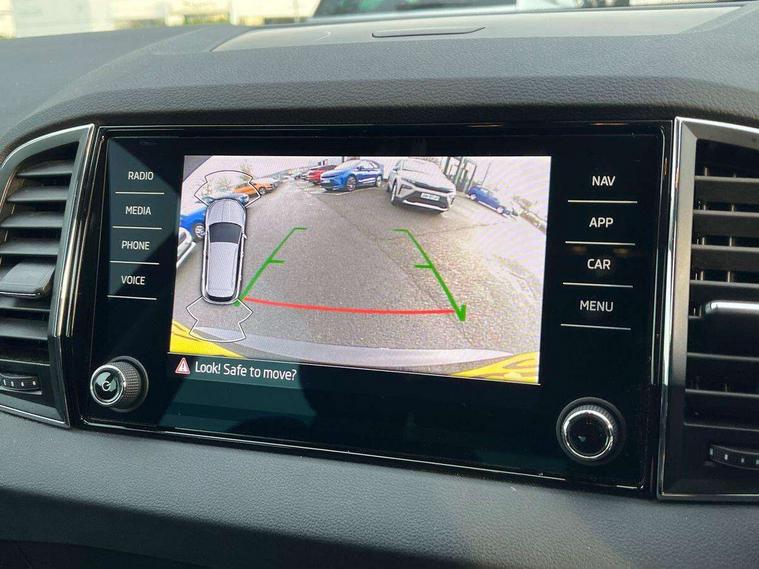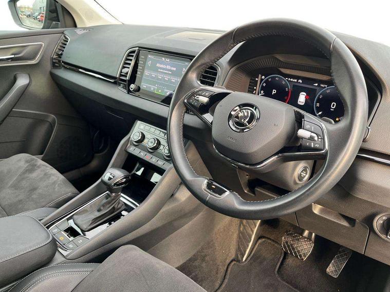 8" Digital display, Care connect, Colour multifunction trip computer, Driver fatigue sensor, Emergency services call system, Outside temperature gauge, Service interval indicator, SmartLink wireless for Apple and wired for Android, Start/stop system with regenerative braking, USB C Port x 2 in front centre console, 8 Speakers, DAB radio with Bluetooth, USB connection, Acoustic glass, Aero front windscreen wipers with intermittent function, Auto dimming rear view mirror with light and rain sensors, Automatic headlight control system, Black electric window control buttons, Body colour door mirrors and handles, Electric front and rear windows with child proof lock, Heated rear windscreen, LED daytime running lights, LED rear lights with high functionality welcome effect and dynamic indicators, Light assistant (coming/leaving home/tunnel light), Plastic scuff plates, Privacy glass, Rear side wing doors, Rear spoiler, Rear window wiper with washer system and intermittent control, Safety reflectors on front doors, 1.5 litre bottle holders in driver and front passenger door panels, 12V socket in boot, 12v socket in front centre armrest with storage compartment and rear air vents, 2 Folding hooks and nets in boot, 2 spoke leather heated multifunction steering wheel with DSG paddles, 2 x Tablet holder, 3 rear height adjustable headrests, 3 seat bench in 2nd row, 4 foldable roof handles with rear coat hooks, Black floor carpet, Chrome inner door handles, Decorative door sills with KAROQ badging, Double sided boot floor, Foldable hooks in the boot, Front head restraints, Height adjustable front three point seats belts with tensioners, Height/reach adjust steering wheel, Ice scraper, Illuminated glovebox, Illuminated luggage compartment, Isofix child seat preparation for front passenger seat, Isofix child seat preparation outer rear, Manual lumbar support for front seats, Pen holder, Pollen filter, Rear boot cover, Rear reading lights, Rubbish bin door, Safety vest holder, Single front passenger seat, Storage box in upper central dashboard closed, Sunvisors with illuminated vanity mirrors, Textile floor mats, Ticket holder, VarioFlex seats with standard rear seat release, Chrome roof rails + chrome pack - Karoq, Parking pack - Karoq, Automatic door unlocking in case of crash, Automatic fuel cut off in case of crash, Child locks on rear doors, Driver airbag, Electronic parking brake with auto hold function, Emergency rear braking signal, ESC including ABS, MSR, ASR, EDS, HBA, DSR, RBS, MKB and traction control, Front side airbags, Hill hold control, Knee airbags, Passenger airbag with switch-off function, Pedestrian monitor, Seatbelt reminder signalisation and pretensioner for all seats, Three point seatbelts rear, Two tone horn, Tyre pressure display, Tyre pressure monitor, Alarm with interior monitoring, back up horn and tilt sensor with safe function, Electronic engine immobiliser, Keyless entry and start/stop, Remote central locking with 2 remote folding keys, Chrome framed air vents, Anti-theft wheel bolts protection, Storage on wheel cover, Tool kit,