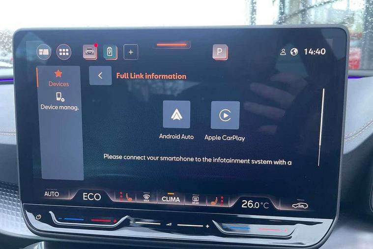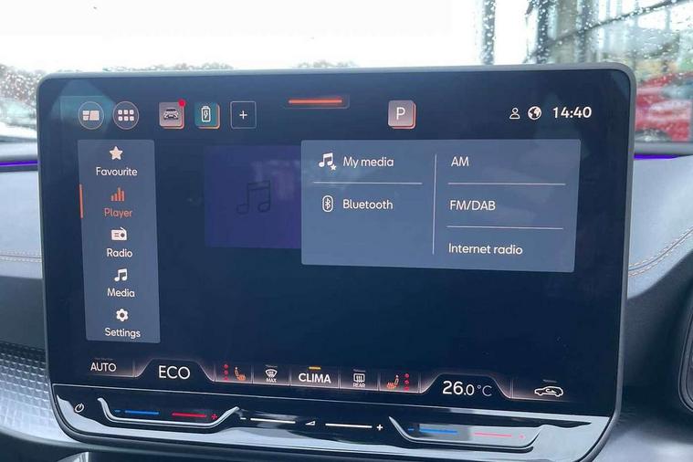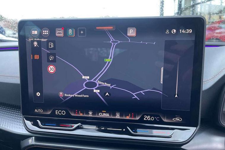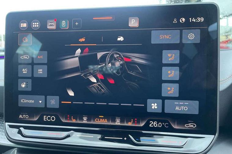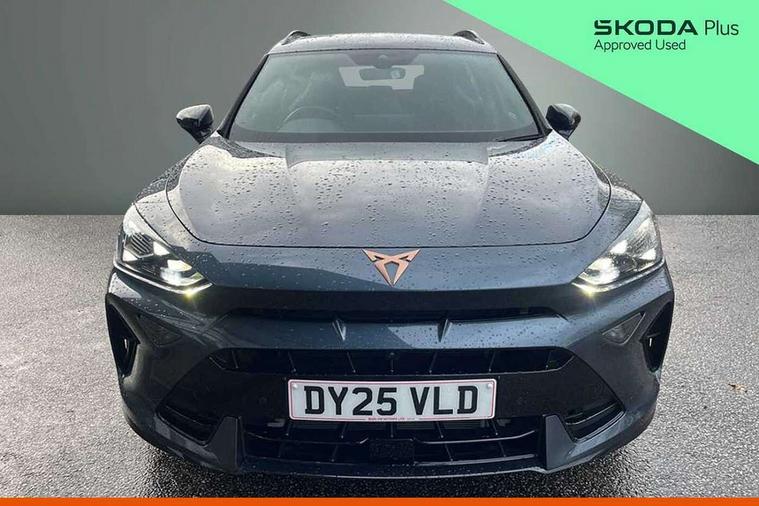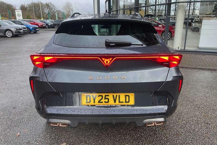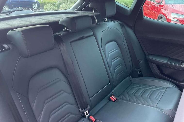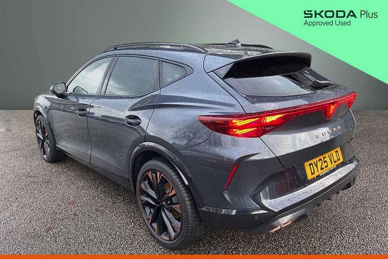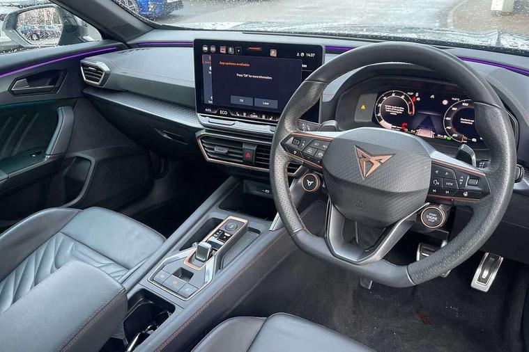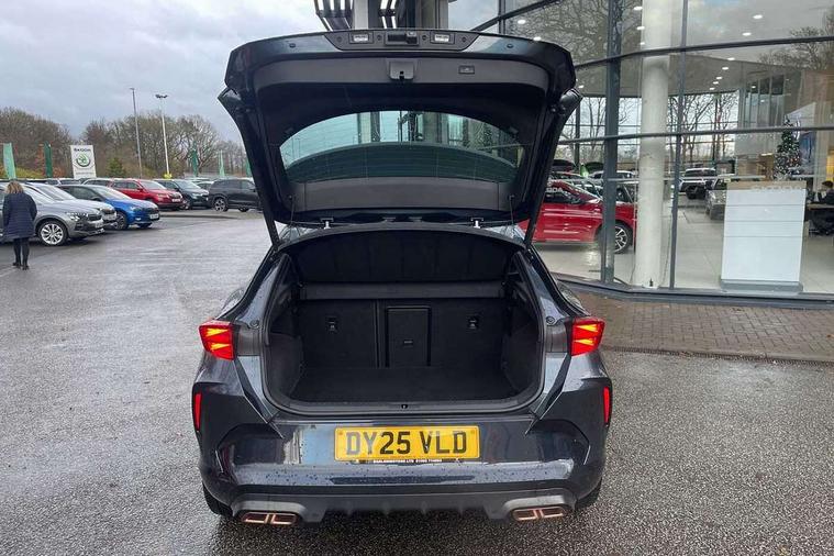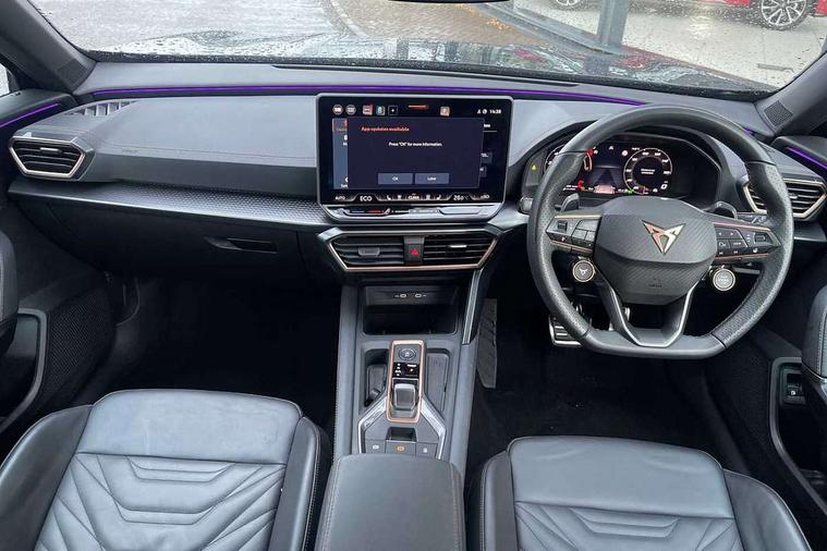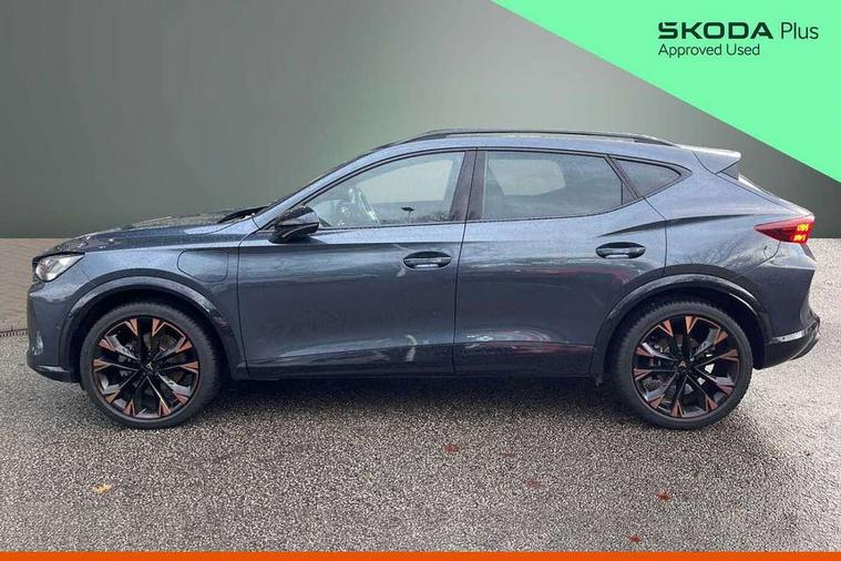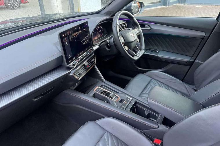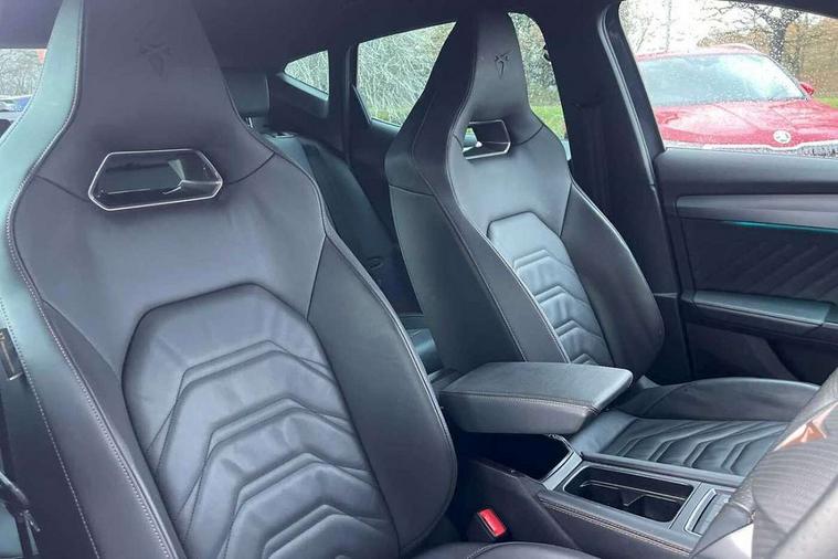 10.25" digital cockpit and configurable dashboard, Adaptive cruise control with follow-to-stop and speed limiter, Advanced driver alert system, Advanced lane assist with semi-automatic vehicle control in a medical emergency and traffic jam assist, Driving profile selection, Dynamic road sign display, Emergency steering support with turn assist, Forward collision warning with automatic braking, Full link phone integration, Intelligent park assist, Progressive steering, RPM, trip computer, outside temp gauge, instrument light brightness, low fuel warning light, lights on reminder, gearshift indicator, Service interval indicator, Side and exit assist, Start/stop system with regenerative braking, Top view camera, Virtual pedal and electric tailgate, Voice control system, Wired Android Auto, Wireless apple carplay, Wireless phone charger, 10 amp mode 2 charging cable, 32 amp mode 3 charging cable, CUPRA sport suspension, Electronic locking differential and dynamic traction support, 2 front and 2 rear USB type C sockets, Media system with navigation, 12.9" touchscreen display, voice control, DAB, steering wheel mounted controls, Auto dimming rear view mirror, Body colour door handles, Body coloured bumpers, Dark grey wing mirror, Daytime running light with automatic headlight control and coming home feature, Door panel ambient lighting, Dynamic headlight range control, Electric front/rear windows, Electrically adjustable heated and folding door mirrors with memory function, Gloss black roof rails and window surrounds, High beam assist, LED 3rd brake light, LED front fog lamps with cornering function, LED Headlights, LED Taillights with dynamic indicator, Rain sensing wipers, Rear diffuser with copper simulated exhaust pipes, Rear fog lights, Rear side wing doors, Rear wash/wipe, Tinted rear windows, Welcome lights (within exterior mirror housing), 12V socket, 2 front and 2 rear reading lights, 3 seat bench in 2nd row, 60/40 split rear bench seat with armrest and mechanical seat release, Black headlining, Black interior roof lining, Cupra sports pedals, Dust/pollen filter, Electrically adjustable front seats with lumbar support and memory function, Front and rear head restraints, Front centre armrest, Heated front seats, Heated supersports multifunction leather steering wheel with satellite buttons and gear shift paddles, Height/reach adjust steering wheel, Illuminated aluminium doorsteps, Illuminated interior front door sills, Illuminated sunvisor with mirror, Isofix, Leather dashboard, door insert and side trim panel, LED smart wraparound lighting, PVC/Leather upholstery, Satellite steering wheel, Single front passenger seat, Storage pockets on rear of front seats, Three zone climate control with control panel in rear, 3 point seatbelts on all rear seats, ABS, Brake control system - ESC and brake booster, Child proof door locks, Driver and front passenger airbags with front passenger airbag de-activation, Electronic parking brake, Front and rear disc brakes, Front side curtain airbags, Hill hold control, Pre-crash front and rear seat belt tensioner, window closure and hazard lights, Public e-call, Seat belt reminder for front and rear seats, Tyre pressure monitoring system, Anti theft alarm system, KESSY Advanced - Keyless start, keyless entry with SAFELOCK, Locking wheel bolts, Copper and aluminium interior detailing, Breakdown and tool kit,