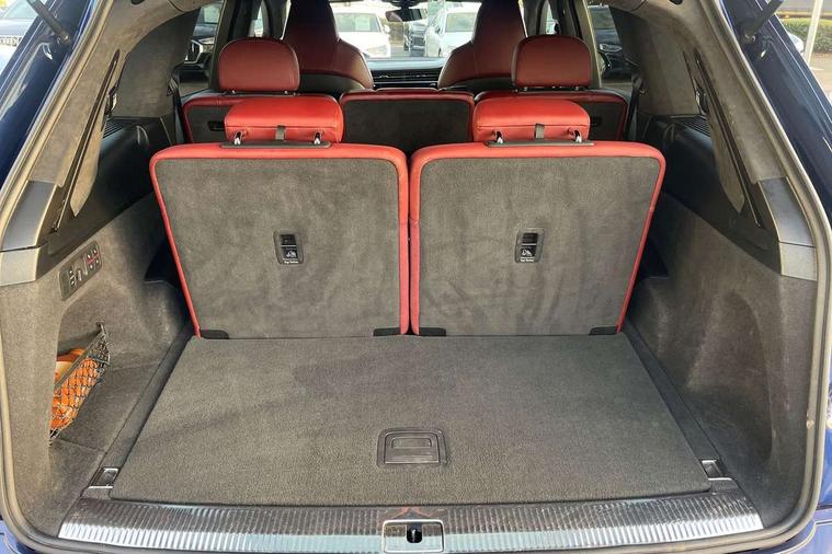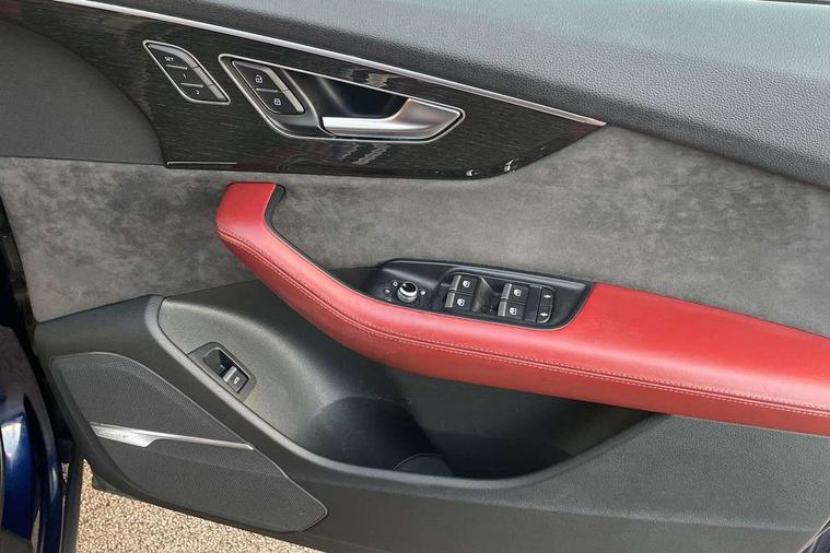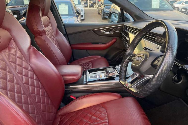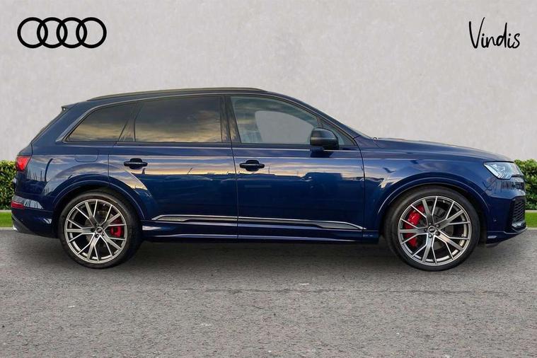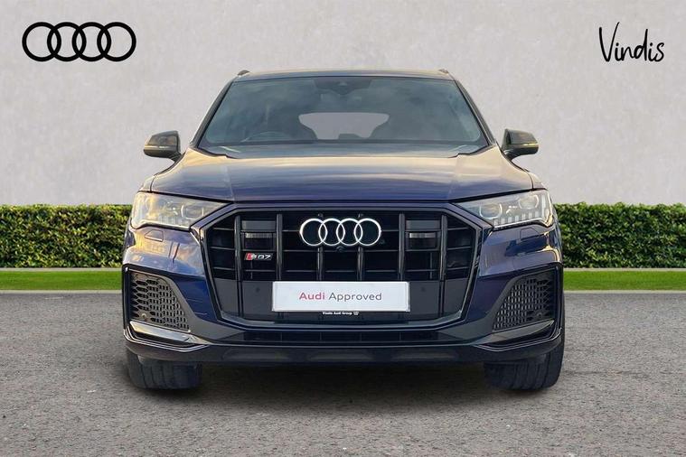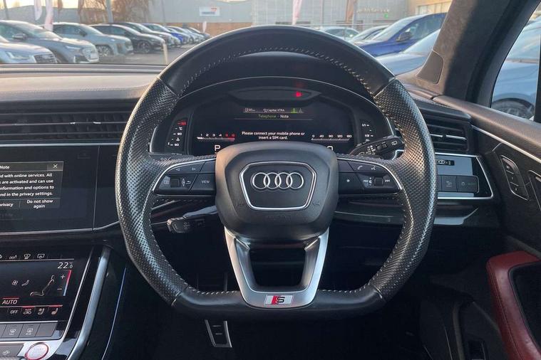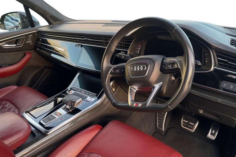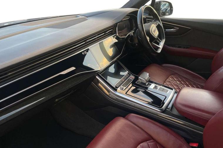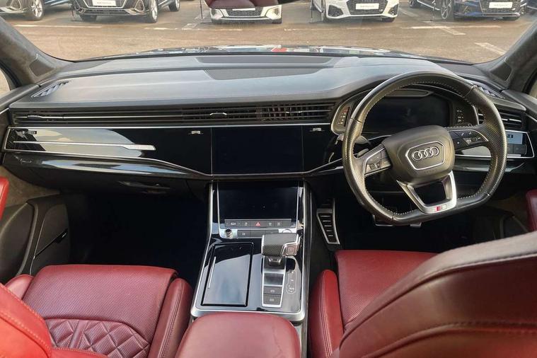 All wheel steering, Audi connect safety and service (e-call), Audi drive select (Auto, Comfort, Dynamic, Efficiency, Individual, Off-road and All road), Audi phone box with wireless charging, Audi smartphone interface includes wireless Apple carplay/Android Auto, Audi virtual cockpit - 12.3" high-resolution LCD display with fully customisable instrument cluster, Camera based traffic sign recognition, Head up Display, MMI navigation plus with MMI touch screens includes 10.1" and 8.6" screens with haptic feedback, Natural voice recognition, Parking system plus - front + rear sensors, Power assist steering, Power door closure, Power operated tailgate, Start/stop system, 48V Mild hybrid technology, 85 litre fuel tank, Quattro all wheel drive with self locking centre differential, S specific adaptive air sport suspension, Audi music interface in rear - 2 USB ports with charger and data functions in rear, DAB digital radio module, Audi HD matrix LED headlights with Audi laser light + dynamic front and rear indicators, Auto dimming frameless rear view mirror, Black roof rails, Electric panoramic glass sunroof, Electrically adj heated/folding + automatically dimming exterior mirrors with memory + automatic kerb side function for passenger side exterior mirror, Headlight washers, Heat insulating glass in windshield, LED daytime running lights, LED rear tail lights, Privacy glass - dark tinted rear and rear side windows from B-pillar backwards, S front and rear bumpers, S specific rear bumper with 4 exhaust pipes, 3 spoke flat bottomed high multi-function leather sport steering wheel with gearshift paddles, 4 zone deluxe automatic climate control, 7 seat layout with ISOFIX points for the front passenger seat and rear passenger seat, Black alcantara headlining includes double sun visors with extendable driver and front passenger side illuminated vanity mirrors, Comfort front centre armrest, Electric height/reach adjustable steering column with memory + auto easy-entry and exit function, Electrically adjustable front seats with memory function for driver and front passenger seat, Folding rear seats, Front head restraints, Front/rear floor mats, Heated front and outer rear seats for second row, LED interior ambient lighting, Rear head restraints, Seat ventilation and massage function in the front, Stainless steel pedals, Tool kit, Valcona leather upholstery with front super sport seat + S embossed, electric adj front seats/backrest bolsters, lumbar support, memory functionality, City assist pack - Q7, Comfort and sound pack with Bose premium sound system - Q7, Extended leather pack with upper and lower interior elements in leather - Q7, Extended LED interior multi coloured lighting pack - Q7, Titanium black styling pack - Q7, Tour pack with Adaptive cruise assist - Q7, 3 point seatbelts on all rear seats, Audi pre sense front, Driver and front passenger, front side and curtain airbags, Electromechanical parking brake, Electronic Stabilisation Control (ESC) including ABS, ASR and EDL, Extended pedestrian protection measures, Hill hold assist, Seatbelt monitoring, Tyre pressure loss indicator, Warning triangle and first aid kit, Anti theft alarm, Anti-theft wheel bolts and wheel loosening detection, Keyless go with remote central locking, Polished oak trim with grey finished, Tyre repair kit,