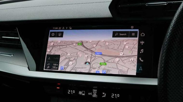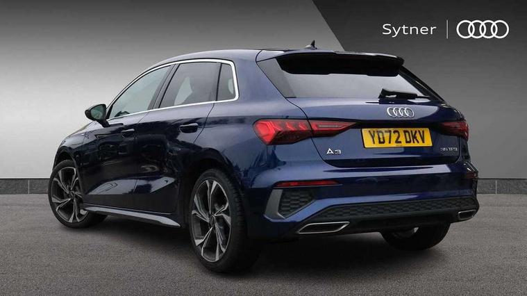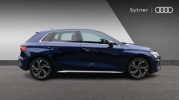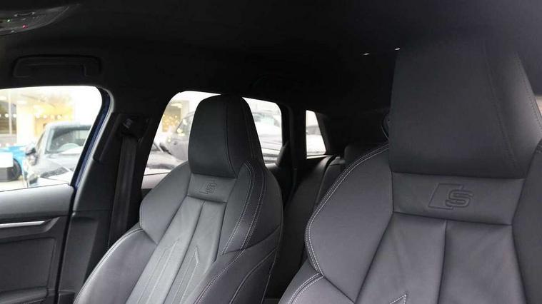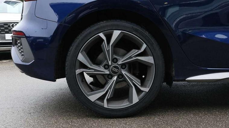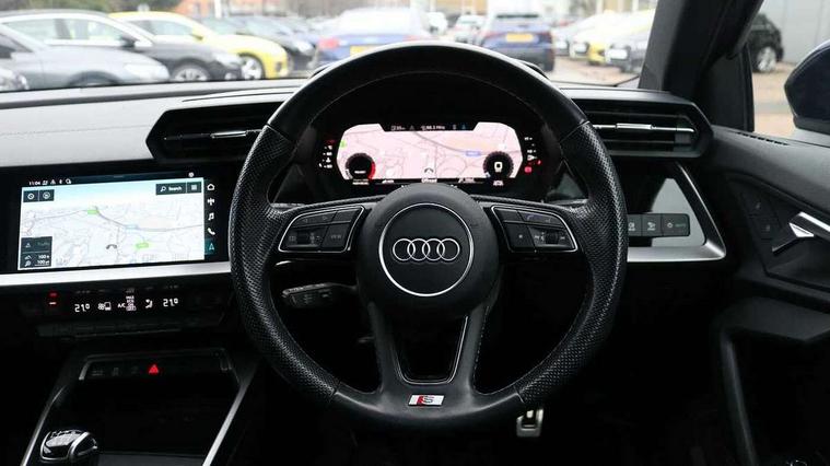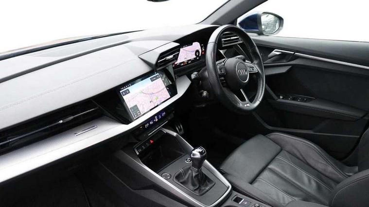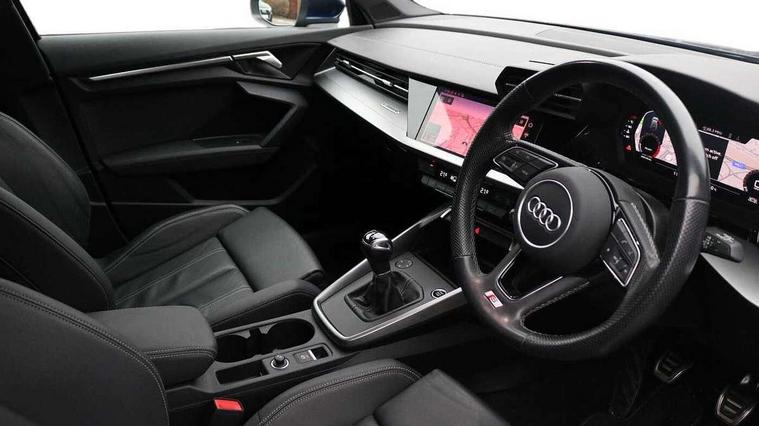 Audi drive select (Auto, Comfort, Dynamic, Efficiency and Individual), Audi smartphone interface, Audi Virtual Cockpit - 10.25" digital and colour instrument cluster, Automatic start/stop system with recuperation, Bluetooth interface, Collision avoidance assistant, Cruise control, e-Call (emergency call), Electromechanical power speed sensitive steering, Lane departure warning system, MMI Navigation Plus with high resolution 10.1" colour touch screen display, Rear parking sensors, Service indicator, Trip computer, Voice control system with natural language interaction, 2xUSB-C connection with data and charging functions, 6 passive loudspeakers, DAB Digital radio, 3rd brake light, Acoustic glass windscreen, Aluminium window trim, Auto dimming frameless rear view mirror, Electrically adjustable/heated/folding/auto dimming door mirrors with integrated LED indications + kerb view function for passenger side, Front electric windows, Illuminated aluminium inserts front door sills with S logo, LED daytime running lights, LED headlights with LED rear lights and dynamic rear indicators, Light and rain sensors, Privacy glass - dark tinted rear window, rear door and side windows, Rear electric windows, Rear side air outlets in grained matt black, Rear side wing doors, Rear wiper, S line bumpers, S roof spoiler, 12V socket and storage compartment in front centre console, 3 seat bench in 2nd row, 40/20/40 split folding rear seat bench with cupholder, Black cloth headlining, Dual zone electronic climate control, Front and rear centre armrest in leather, Front and rear headrests, Front/rear floor mats, Height and reach adjustable steering wheel, Illuminated vanity mirror, Interior lighting - glove compartment light and right hand side, Luggage compartment floor covering, Manual boot compartment lid, Manually adjustable front seats, Seat side bolsters, Single front passenger seat, Stainless steel pedals and front footrest in black, Twin leather upholstery with front sports seats S embossed logo, Aluminium interior elements pack - A3 Sportback, S line styling pack - A3 Sportback, 3x3 point rear seat belts, Audi pre sense front, Driver and front passenger airbag with passenger airbag deactivation, Electronic Stabilisation Control (ESC) including ABS, ASR and EDL, First aid kit with warning triangle and 2 safety vests, Front side airbags with head airbags and interaction airbag, Pre-sense front with pedestrian and cyclist detection, Seatbelt monitoring, Tyre pressure loss indicator, Anti theft alarm, Anti-theft wheel bolts, Immobiliser, Manual child locks, Remote control central locking, Accent surfaces in the dashboard and centre console in platinum grey silk effect paint finish, Dark spectrum aluminium inlays,