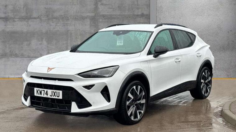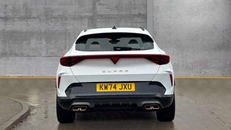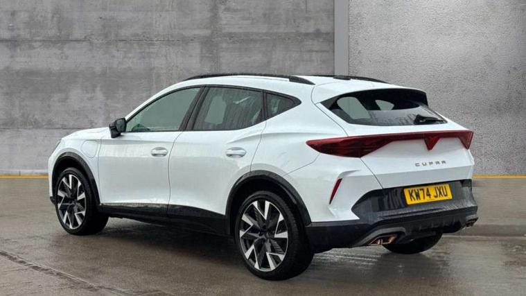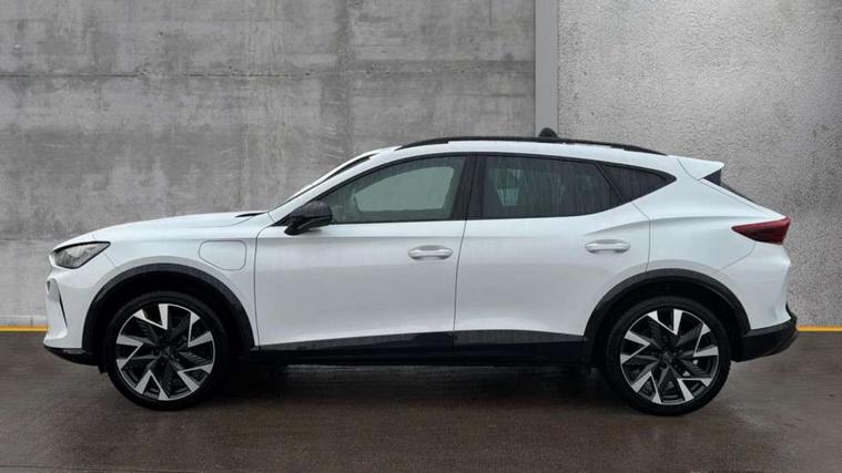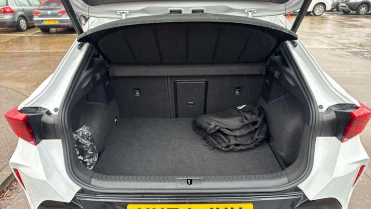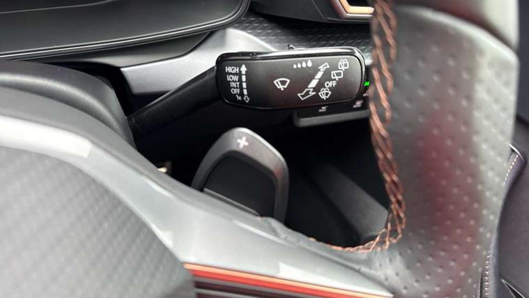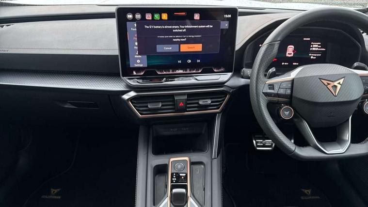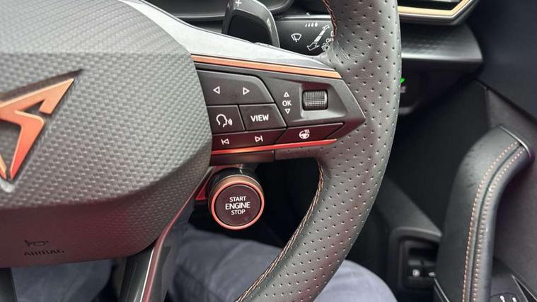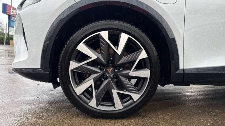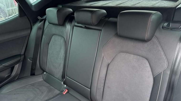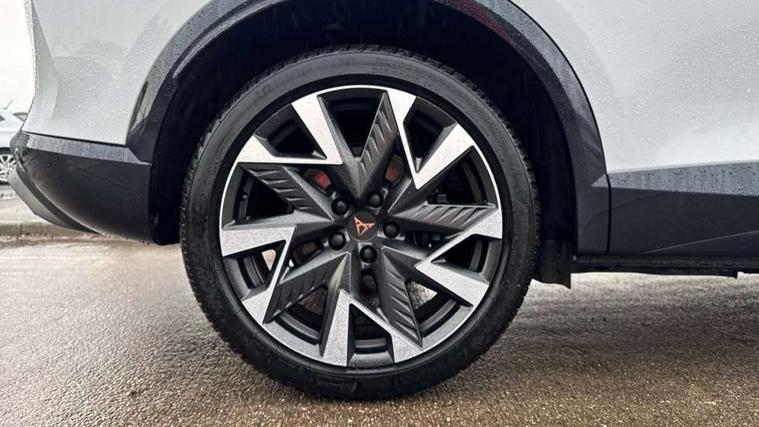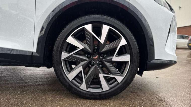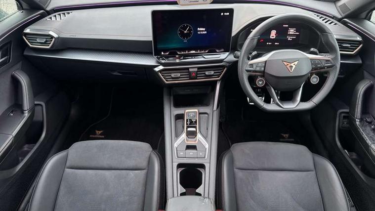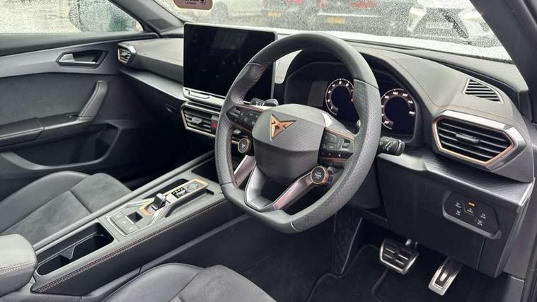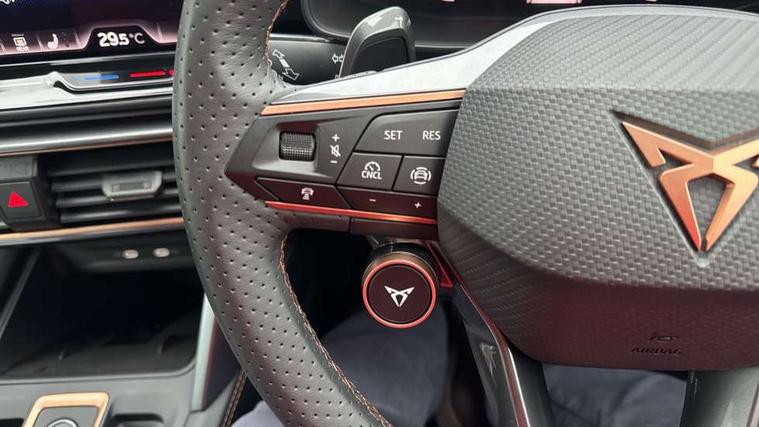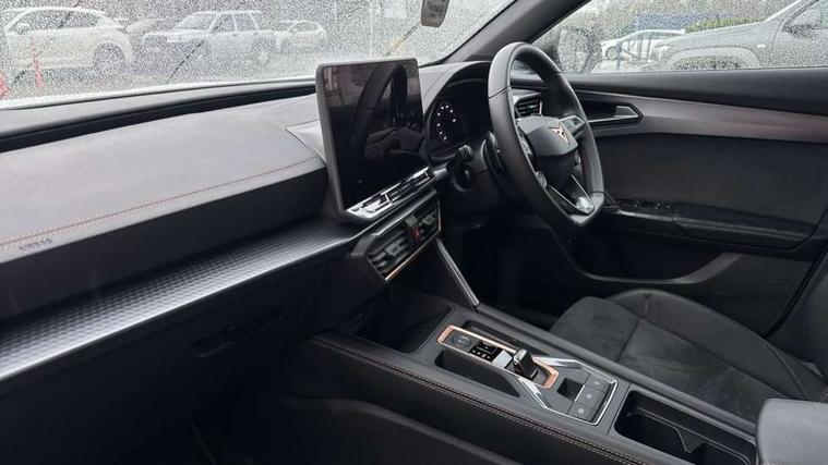 10.25" digital cockpit and configurable dashboard, Adaptive cruise control with follow-to-stop and speed limiter, Advanced driver alert system, Dynamic chassis control with driving profile selection (Comfort, Sport, CUPRA, Individual), Dynamic road sign display, Emergency steering support with turn assist, Forward collision warning with automatic braking, Front and rear parking sensors, Full link phone integration, Lane assist, Rear view camera, RPM, trip computer, outside temp gauge, instrument light brightness, low fuel warning light, lights on reminder, gearshift indicator, Service interval indicator, Speed sensitive power steering, Start/stop system with regenerative braking, Virtual pedal and electric tailgate, Voice control system, Wired Android Auto, Wireless apple carplay, Wireless phone charger, 10 amp mode 2 charging cable, 32 amp mode 3 charging cable, Adaptive chassis control with continuous operation, CUPRA sport suspension, Electronic locking differential and dynamic traction support, 2 front and 2 rear USB type C sockets, Media system with navigation, 12.9" touchscreen display, voice control, DAB, steering wheel mounted controls, Auto dimming rear view mirror, Body colour door handles, Body coloured bumpers, Dark grey wing mirror, Daytime running light with automatic headlight control and coming home feature, Door panel ambient lighting, Dynamic headlight range control, Electric front/rear windows, Electrically adjustable heated and folding door mirrors with memory function, Gloss black roof rails and window surrounds, High beam assist, LED 3rd brake light, LED front fog lamps with cornering function, LED Taillights with dynamic indicator, Matrix LED headlights with multifunction camera, Rain sensing wipers, Rear diffuser with copper simulated exhaust pipes, Rear fog lights, Rear side wing doors, Rear wash/wipe, Tinted rear windows, Welcome lights (within exterior mirror housing), 12V socket, 2 front and 2 rear reading lights, 3 seat bench in 2nd row, 60/40 split rear bench seat with armrest and mechanical seat release, Black headlining, Black interior roof lining, Cupra sports pedals, Dust/pollen filter, Electrically adjustable front seats with lumbar support and memory function, Front and rear head restraints, Front centre armrest, Heated front seats, Heated supersports multifunction leather steering wheel with satellite buttons and gear shift paddles, Height/reach adjust steering wheel, Illuminated aluminium doorsteps, Illuminated interior front door sills, Illuminated sunvisor with mirror, Isofix, Leather dashboard, door insert and side trim panel, LED smart wraparound lighting, PVC/Dinamica microfiber upholstery + bucket seats, Satellite steering wheel, Single front passenger seat, Storage pockets on rear of front seats, Three zone climate control with control panel in rear, 3 point seatbelts on all rear seats, ABS, Brake control system - ESC and brake booster, Child proof door locks, Driver and front passenger airbags with front passenger airbag de-activation, Electronic parking brake, Front and rear disc brakes, Front side curtain airbags, Hill hold control, Public e-call, Seat belt reminder for front and rear seats, Tyre pressure monitoring system, Anti theft alarm system, KESSY Advanced - Keyless start, keyless entry with SAFELOCK, Locking wheel bolts, Copper and aluminium interior detailing, 19" Sandstorm machined sport black and silver alloy wheels, Breakdown and tool kit,
