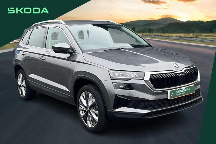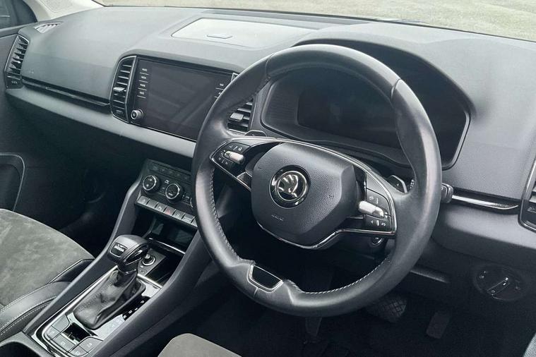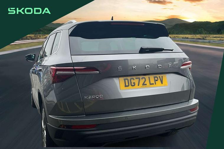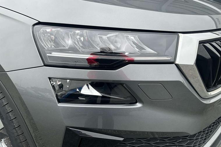8" Digital display, Care connect, Driver fatigue sensor, Emergency services call system, Outside temperature gauge, Service interval indicator, SmartLink wireless for Apple and wired for Android, Start/stop system with regenerative braking, USB C Port x 2 in front centre console, 8 Speakers, DAB radio with Bluetooth, USB connection, Acoustic glass, Aero front windscreen wipers with intermittent function, Auto dimming rear view mirror with light and rain sensors, Black electric window control buttons, Body colour door mirrors and handles, Dynamic headlight range control with cornering light function, Electric front and rear windows with child proof lock, Heated rear windscreen, LED daytime running lights, LED rear lights with high functionality welcome effect and dynamic indicators, Light assistant (coming/leaving home/tunnel light), Plastic scuff plates, Privacy glass, Rear side wing doors, Rear spoiler, Rear window wiper with washer system and intermittent control, Safety reflectors on front doors, 1.5 litre bottle holders in driver and front passenger door panels, 12V socket in boot, 12v socket in front centre armrest with storage compartment and rear air vents, 2 Folding hooks and nets in boot, 2 spoke leather heated multifunction steering wheel with DSG paddles, 2 x Tablet holder, 3 rear height adjustable headrests, 3 seat bench in 2nd row, 4 foldable roof handles with rear coat hooks, Black floor carpet, Chrome inner door handles, Decorative door sills with KAROQ badging, Double sided boot floor, Foldable hooks in the boot, Front head restraints, Height adjustable front three point seats belts with tensioners, Height/reach adjust steering wheel, Ice scraper, Illuminated glovebox, Illuminated luggage compartment, Isofix child seat preparation for front passenger seat, Isofix child seat preparation outer rear, Manual lumbar support for front seats, Pen holder, Pollen filter, Rear boot cover, Rear reading lights, Rubbish bin door, Safety vest holder, Single front passenger seat, Storage box in upper central dashboard closed, Sunvisors with illuminated vanity mirrors, Textile floor mats, Ticket holder, VarioFlex seats with standard rear seat release, Chrome roof rails + chrome pack - Karoq, Parking pack - Karoq, Automatic door unlocking in case of crash, Automatic fuel cut off in case of crash, Child locks on rear doors, Driver airbag, Electronic parking brake with auto hold function, Emergency rear braking signal, ESC including ABS, MSR, ASR, EDS, HBA, DSR, RBS, MKB and traction control, Front side airbags, Hill hold control, Knee airbags, Passenger airbag with switch-off function, Pedestrian monitor, Seatbelt reminder signalisation and pretensioner for all seats, Three point seatbelts rear, Two tone horn, Tyre pressure display, Tyre pressure monitor, Alarm with interior monitoring, back up horn and tilt sensor with safe function, Electronic engine immobiliser, Keyless entry and start/stop, Remote central locking with 2 remote folding keys, Chrome framed air vents, Anti-theft wheel bolts protection, Storage on wheel cover, Tool kit,