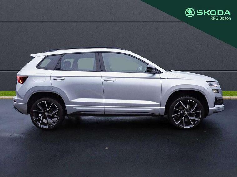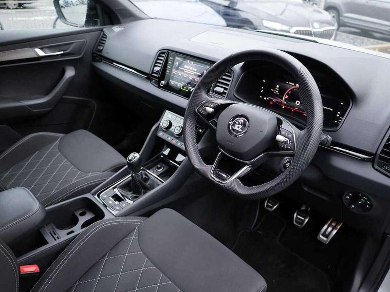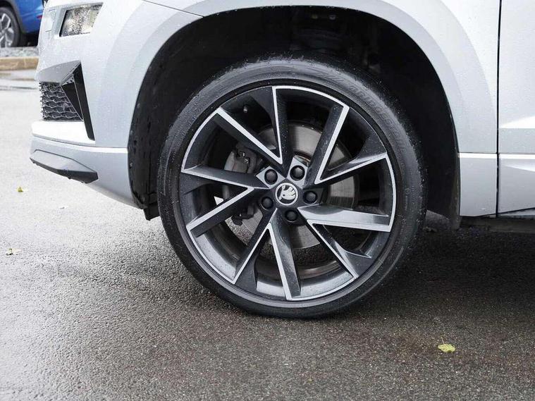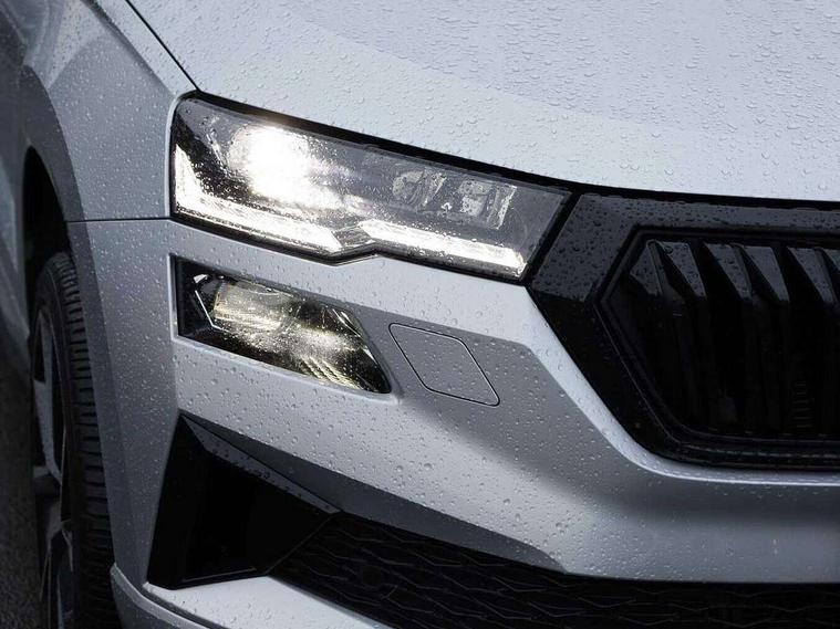 8" Digital display, Care connect, Driver fatigue sensor, Emergency services call system, Outside temperature gauge, Service interval indicator, SmartLink wireless for Apple and wired for Android, Start/stop system with regenerative braking, USB C Port x 2 in front centre console, Virtual cockpit, Virtual pedal with electrically operated boot door, 8 Speakers, DAB radio with Bluetooth, USB connection, Wireless charging without wireless aerial connection, Acoustic glass, Aero front windscreen wipers with intermittent function, Auto dimming rear view mirror with light and rain sensors, Black door mirrors, Black electric window control buttons, Black radiator grille, Black roof rails, Body colour door handles, Electric front and rear windows with child proof lock, Front door steps with SportLine logo, Heated rear windscreen, LED daytime running lights, LED rear lights with high functionality welcome effect and dynamic indicators, Light assistant (coming/leaving home/tunnel light), Panoramic sliding sunroof, Plastic scuff plates, Privacy glass, Protective door side sills in body colour, Rear diffuser, Rear side wing doors, Rear spoiler, Rear window wiper with washer system and intermittent control, Safety reflectors on front doors, Skoda lettering on tailgate in black, Sportline badge on front fender, Sportline decorative inserts with badging, Sports front and rear bumpers, 1.5 litre bottle holders in driver and front passenger door panels, 12V socket in boot, 12v socket in front centre armrest with storage compartment and rear air vents, 3 rear height adjustable headrests, 3 seat bench in 2nd row, 3 spoke leather sports multifunction steering wheel and silver stitching, 4 foldable roof handles with rear coat hooks, Black floor carpet, Black roof headlining, Chrome inner door handles, Double sided boot floor, Foldable hooks in the boot, Front head restraints, Height adjustable front three point seats belts with tensioners, Height/reach adjust steering wheel, Ice scraper, Illuminated glovebox, Illuminated luggage compartment, Isofix child seat preparation outer rear, Manual lumbar support for front seats, Pen holder, Pollen filter, Rear boot cover, Rear reading lights, Rear seats fixed folding and divided 60:40, Rubbish bin door, Safety vest holder, Single front passenger seat, Storage box in upper central dashboard closed, Sunvisors with illuminated vanity mirrors, Textile floor mats, Ticket holder, Titan black interior ceiling, Welcome animation with sportline logo, Boot pack - Karoq, Light Pack - Karoq, Parking pack - Karoq, Automatic door unlocking in case of crash, Automatic fuel cut off in case of crash, Child locks on rear doors, Driver airbag, Electronic parking brake with auto hold function, Emergency rear braking signal, ESC including ABS, MSR, ASR, EDS, HBA, DSR, RBS, MKB and traction control, Front side airbags, Hill hold control, Knee airbags, Passenger airbag with switch-off function, Pedestrian monitor, Seatbelt reminder signalisation and pretensioner for all seats, Three point seatbelts rear, Two tone horn, Tyre pressure display, Tyre pressure monitor, Alarm with interior monitoring, back up horn and tilt sensor with safe function, Electronic engine immobiliser, Keyless entry and start/stop, Remote central locking with 2 remote folding keys, Black air vent surround, Black centre console, Satin black dashboard, Satin black door trim, 19" Sagitarius anthracite alloy wheels with matt black aero inserts, Anti-theft wheel bolts protection, Matt black aero hub caps, Storage on wheel cover, Tool kit,
