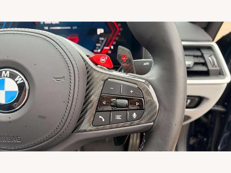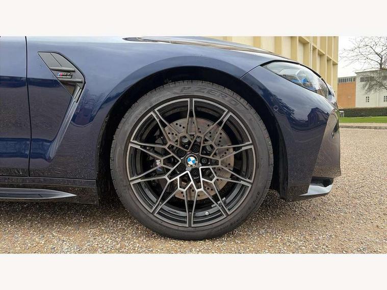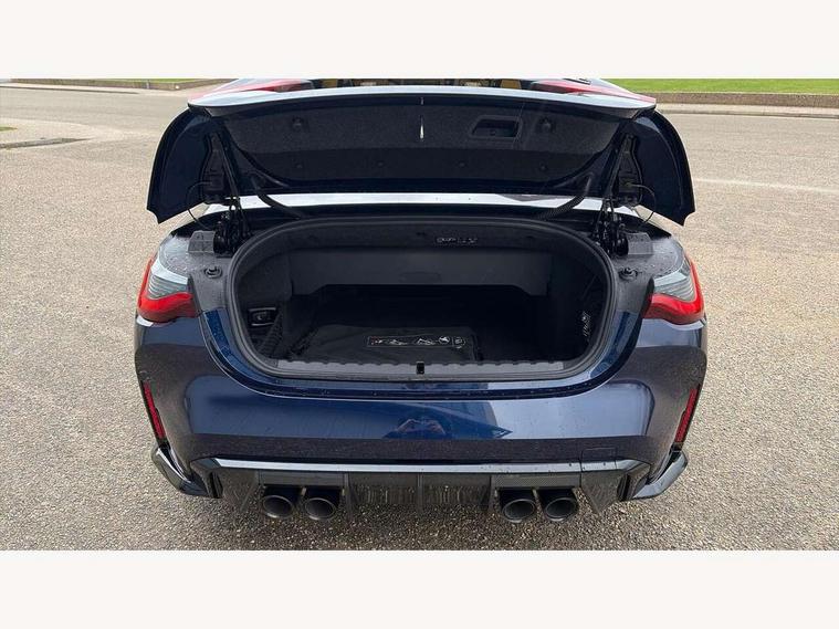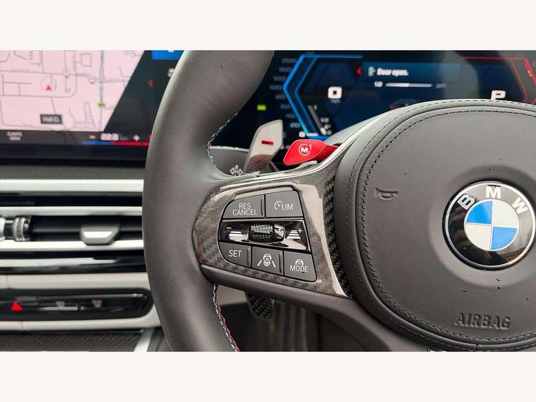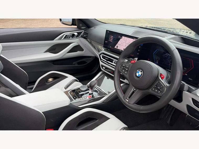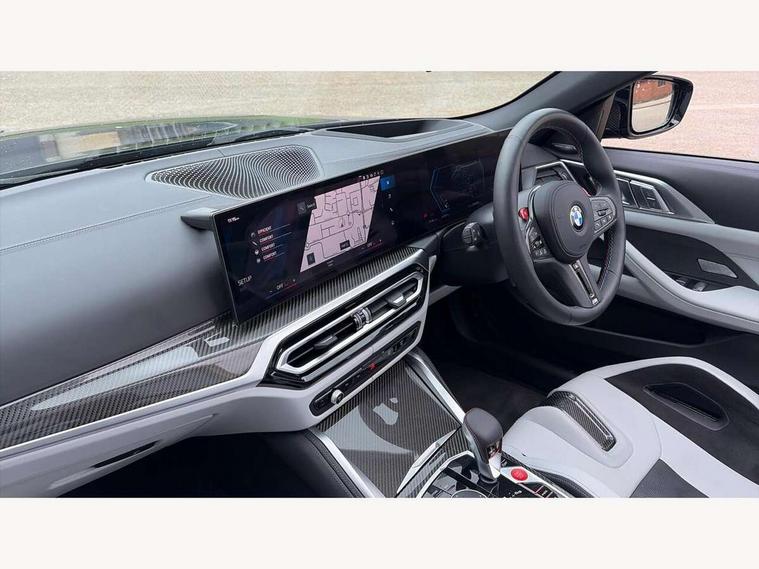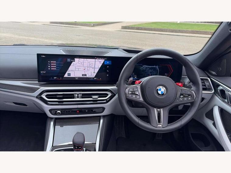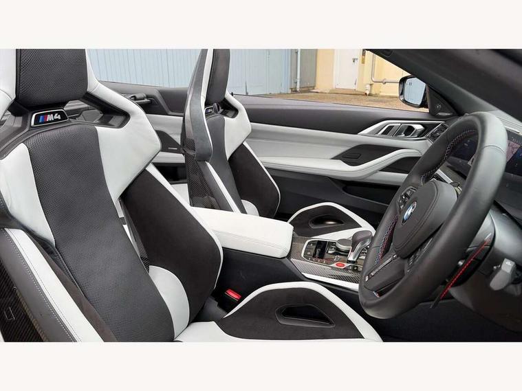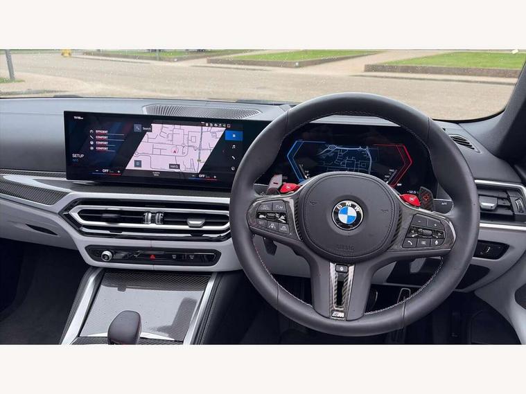Active guard plus, Automatic start/stop system, BMW ConnectedDrive online services, BMW iDrive controller on centre console, BMW legal emergency call, BMW Live Cockpit Pro with Head up display including 12.3" instrument display and 14.9" high resolution control display with navigation function, BMW Teleservices, Brake pad wear indicator warning light, Condition based service, Door/boot open warning light, Driving experience switch, Electric Power Steering (EPS) with Servotronic, Instrument cluster with extended contents, Language version English, Lights on warning, M drive buttons, Oil sensor for level and grade, warning by check control system, Oil temperature gauge, On board computer, On board diagnostics, Optimum shift indicator, Outside temperature display, Park distance control, Pull away assistant, Run flat indicator, Service interval indicator, Shifting point display, Speed limiter, Start/stop button in blue, Variable sport steering, Adaptive M Sport suspension, Double joint spring strut front axle, M Drive Professional including track mode, laptimer, traction control & Drift analyser, M Sport differential, M steptronic sport transmission with drivelogic, Safety battery terminal clamp, 8 programmable favourite buttons, Auxiliary point for auxiliary devices, BMW professional radio/CD/MP3, DAB Digital radio, Harman/Kardon loudspeaker system, Acoustic laminated side glass, Auto dimming driver's door mirror, Auto dimming rear view mirror, Automatic headlights + automatic windscreen wipers, Black chrome exhaust tailpipes, Black model designation badges, BMW high gloss shadow line with extended contents, BMW Individual shadowline lights, Body colour bumpers, Body colour door handles, Carbon fibre reinforced plastic (CFRP) roof, Day time running light, Door mirror integrated indicators, Door sill finishers with aluminium inserts, Dynamic brake lights, Electric adjustable heated door mirrors, Electric folding door mirrors, Follow me home headlights, Front and rear bumper system, Front electric windows with open and close fingertip control, anti trap facility and comfort closing, Headlight beam throw control, Heated washer jets, High beam assistant, High gloss black frameless kidney grille with M badge, LED number plate light, LED tail lights with 3D L-shaped LED light design, M designation, Mirror glass aspheric on driver's side, convex on passenger side, Rain sensor, Rear boot, Rear fog lights, Rear reflectors, Reversing light, Shark fin roof aerial, Third brake light, Visible VIN plate, Welcome lighting, 2 cupholders in front centre console, 2 cupholders in rear armrest, 2 rear head restraints, 2 x 12 V Power sockets (luggage compartment and front centre console), 2 x USB Type C ports for charging and data transmission in front centre console, 40:20:40 split folding rear 2 seat bench with loading system, Ambient lighting, Anthracite headlining, Battery in luggage compartment, Carbon fibre centre console incl. cover for cupholders and storage compartment, Carbon fibre decorative steering wheel finishers, Carbon fibre shift paddles, Carbon fibre strip in instrument panel on front passenger side, Centre console armrest with storage compartment, Compartment in front of cupholder, Driver/passenger sunvisors with ticket holders + illuminated vanity mirrors, Electric front seats + driver memory, English handbook, Floor mats in velour, Footwell lighting, Front and rear door exit lights, Front door storage bins with bottle holder, Front interior light, Front isofix attachment + airbag deactivation, Front reading light, Front seat backrest width adjustment, Front seats lumbar support, Front/rear door armrests, Gearshift lever with embossed M badge, Heated front seats, Height adjustable front headrests, Illumination in armrest storage compartment, Interior mirror lighting, Isofix on 2nd row seats, Lockable/illuminated glovebox, Luggage compartment lighting, Multifunction steering wheel, Rake/reach adjustable steering wheel, Single front passenger seat, Storage compartment in rear doors, Storage tray and compartment with cover in centre console, Three zone automatic air conditioning, Toolkit located in luggage compartment, Warm air collar, Wireless charging tray, Additional storage compartment pack - M4, Connected package professional - M4, High gloss shadowline exterior trim pack - M4, 4 x 3 point seatbelts, ABS/EBD, Automatic Stability Control (ASC), Brake energy regeneration, Brake fade compensation, Compound structure brake discs, Cornering brake control (CBC), Crash sensor, Curtain airbags, Driver/Front Passenger airbags, Dry braking, Dynamic brake control, Dynamic stability control + (DSC+), Dynamic Traction Control - DTC, Electromechanical parking brake, Electronic differential lock control (EDLC), Front and rear head airbags, Front seat side impact airbags, Front seatbelt pretensioners + load limiters, Hill start assist, M Sport seat belts, Seat occupancy detection for driver and passenger side, Seatbelt warning, Side impact protection, Two tone horn, Tyre pressure sensor, Warning triangle and first aid kit, Centre lock switch, Closing system with central locking, Digital key, Electronic immobiliser, Remote central locking, Thatcham cat 1 remote alarm, Vehicle Key with 4 buttons including the integrated key, Galvanic finish to control surrounds, High gloss black interior trim, Tyre repair kit,