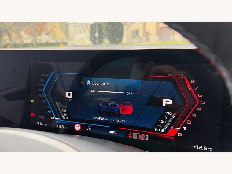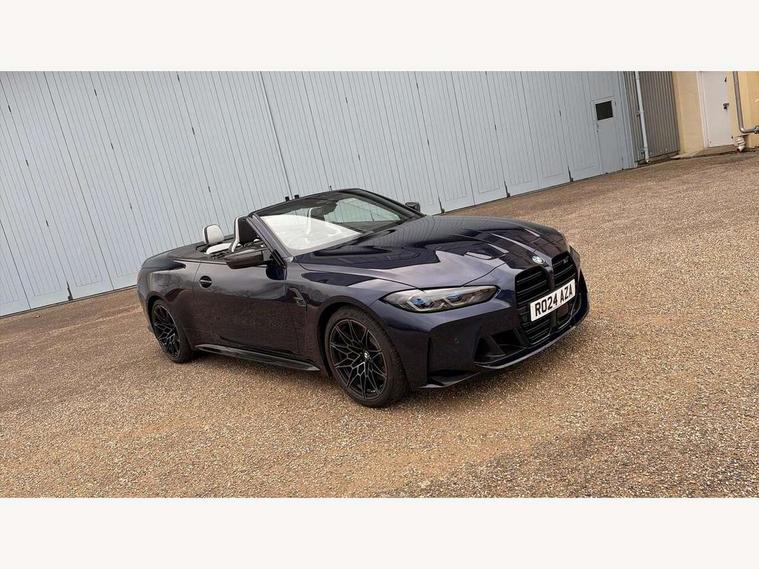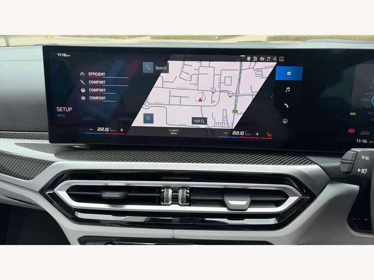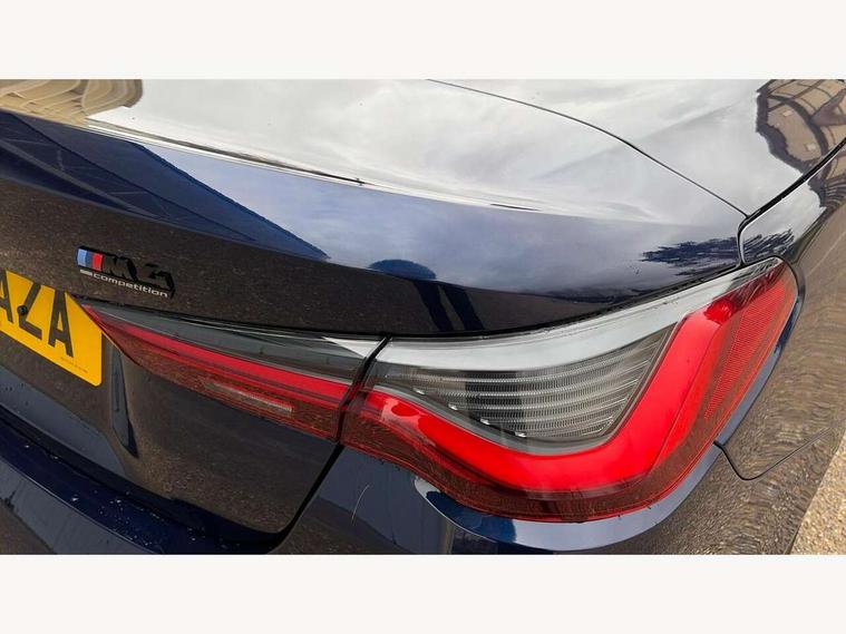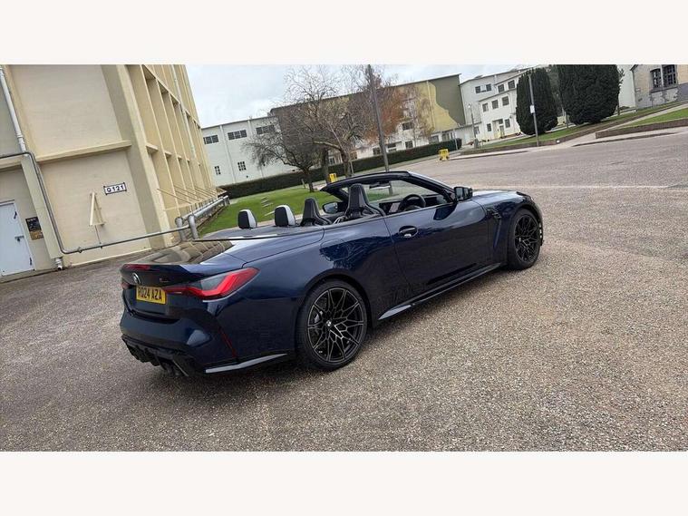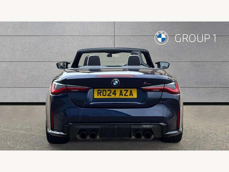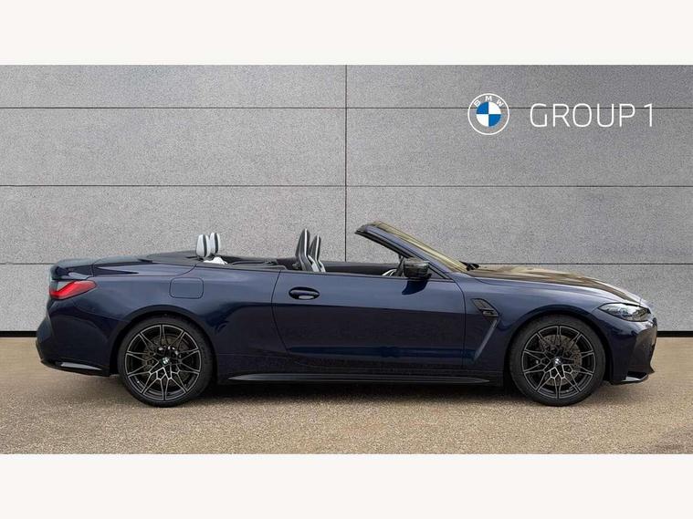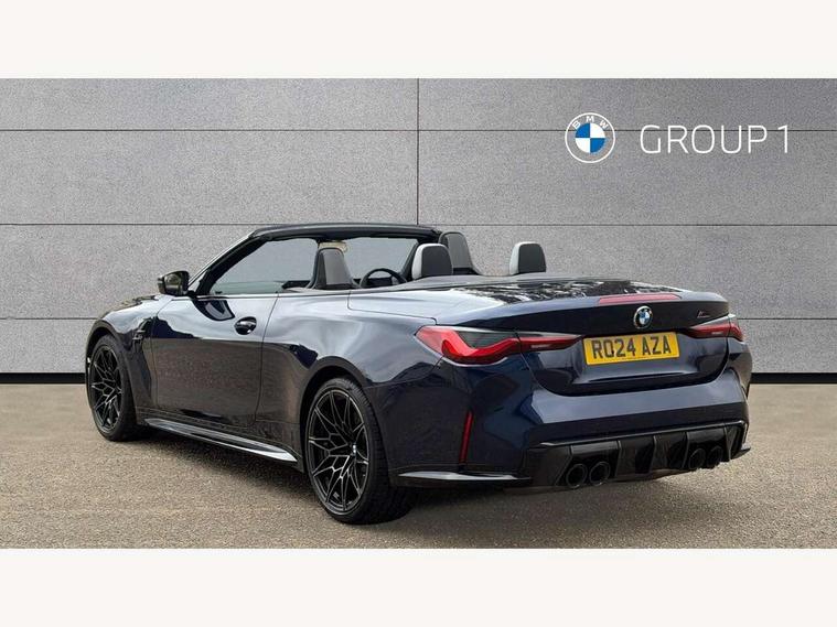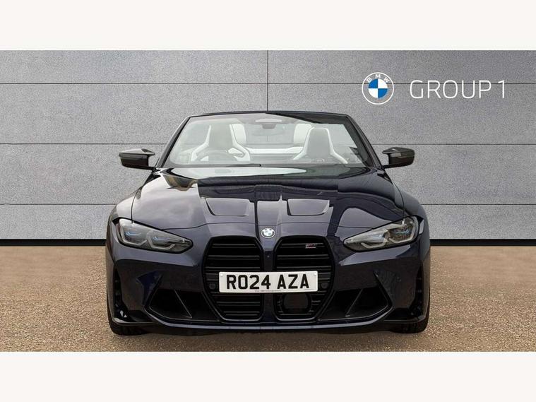 Active guard plus, Automatic start/stop system, BMW ConnectedDrive online services, BMW iDrive controller on centre console, BMW legal emergency call, BMW Live Cockpit Pro with Head up display including 12.3" instrument display and 14.9" high resolution control display with navigation function, BMW Teleservices, Brake pad wear indicator warning light, Condition based service, Door/boot open warning light, Driving experience switch, Electric Power Steering (EPS) with Servotronic, Instrument cluster with extended contents, Language version English, Lights on warning, M drive buttons, Oil sensor for level and grade, warning by check control system, Oil temperature gauge, On board computer, On board diagnostics, Optimum shift indicator, Outside temperature display, Park distance control, Pull away assistant, Run flat indicator, Service interval indicator, Shifting point display, Speed limiter, Start/stop button in blue, Variable sport steering, Adaptive M Sport suspension, Double joint spring strut front axle, M Drive Professional including track mode, laptimer, traction control & Drift analyser, M Sport differential, M steptronic sport transmission with drivelogic, Safety battery terminal clamp, 8 programmable favourite buttons, Auxiliary point for auxiliary devices, BMW professional radio/CD/MP3, DAB Digital radio, Harman/Kardon loudspeaker system, Acoustic laminated side glass, Auto dimming driver's door mirror, Auto dimming rear view mirror, Automatic headlights + automatic windscreen wipers, Black chrome exhaust tailpipes, Black model designation badges, BMW high gloss shadow line with extended contents, BMW Individual shadowline lights, Body colour bumpers, Body colour door handles, Carbon fibre reinforced plastic (CFRP) roof, Day time running light, Door mirror integrated indicators, Door sill finishers with aluminium inserts, Dynamic brake lights, Electric adjustable heated door mirrors, Electric folding door mirrors, Follow me home headlights, Front and rear bumper system, Front electric windows with open and close fingertip control, anti trap facility and comfort closing, Headlight beam throw control, Heated washer jets, High beam assistant, High gloss black frameless kidney grille with M badge, LED number plate light, LED tail lights with 3D L-shaped LED light design, M designation, Mirror glass aspheric on driver's side, convex on passenger side, Rain sensor, Rear boot, Rear fog lights, Rear reflectors, Reversing light, Shark fin roof aerial, Third brake light, Visible VIN plate, Welcome lighting, 2 cupholders in front centre console, 2 cupholders in rear armrest, 2 rear head restraints, 2 x 12 V Power sockets (luggage compartment and front centre console), 2 x USB Type C ports for charging and data transmission in front centre console, 40:20:40 split folding rear 2 seat bench with loading system, Ambient lighting, Anthracite headlining, Battery in luggage compartment, Carbon fibre centre console incl. cover for cupholders and storage compartment, Carbon fibre decorative steering wheel finishers, Carbon fibre shift paddles, Carbon fibre strip in instrument panel on front passenger side, Centre console armrest with storage compartment, Compartment in front of cupholder, Driver/passenger sunvisors with ticket holders + illuminated vanity mirrors, Electric front seats + driver memory, English handbook, Floor mats in velour, Footwell lighting, Front and rear door exit lights, Front door storage bins with bottle holder, Front interior light, Front isofix attachment + airbag deactivation, Front reading light, Front seat backrest width adjustment, Front seats lumbar support, Front/rear door armrests, Gearshift lever with embossed M badge, Heated front seats, Height adjustable front headrests, Illumination in armrest storage compartment, Interior mirror lighting, Isofix on 2nd row seats, Lockable/illuminated glovebox, Luggage compartment lighting, Multifunction steering wheel, Rake/reach adjustable steering wheel, Single front passenger seat, Storage compartment in rear doors, Storage tray and compartment with cover in centre console, Three zone automatic air conditioning, Toolkit located in luggage compartment, Warm air collar, Wireless charging tray, Additional storage compartment pack - M4, Connected package professional - M4, High gloss shadowline exterior trim pack - M4, 4 x 3 point seatbelts, ABS/EBD, Automatic Stability Control (ASC), Brake energy regeneration, Brake fade compensation, Compound structure brake discs, Cornering brake control (CBC), Crash sensor, Curtain airbags, Driver/Front Passenger airbags, Dry braking, Dynamic brake control, Dynamic stability control + (DSC+), Dynamic Traction Control - DTC, Electromechanical parking brake, Electronic differential lock control (EDLC), Front and rear head airbags, Front seat side impact airbags, Front seatbelt pretensioners + load limiters, Hill start assist, M Sport seat belts, Seat occupancy detection for driver and passenger side, Seatbelt warning, Side impact protection, Two tone horn, Tyre pressure sensor, Warning triangle and first aid kit, Centre lock switch, Closing system with central locking, Digital key, Electronic immobiliser, Remote central locking, Thatcham cat 1 remote alarm, Vehicle Key with 4 buttons including the integrated key, Galvanic finish to control surrounds, High gloss black interior trim, Tyre repair kit,