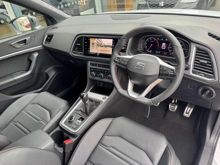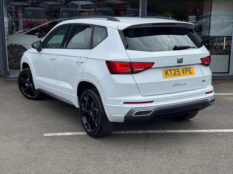10" Digital cockpit, E-call, Electric tailgate with virtual pedal, Outside temperature gauge, Progressive power assisted steering, SEAT drive profile with driving experience button - Normal, Sport, Eco and Individual mode, steering and throttle response, Self parking functionality (includes front and rear parking sensors), Start/stop system, Top view camera with rear view camera, Trip computer, wired and wireless full link smartphone integration, Wireless phone charger, Steering wheel mounted audio/phone controls, Black roof rails, Black side window trim, Body colour bumpers, Body coloured wheel arch surrounds, Chrome front grille frame, Dark tinted rear windows, Daytime running lights, Door mirrors with welcome light silhouette, Dynamic headlight range control with self adjusting whilst driving, Electric adjustable/heated/folding door mirrors, Front and rear electric windows, Full LED headlamps with lens and LED front fog lamps with cornering function, Illuminated aluminium front door sill, LED 3rd brake light, LED rear tail lights with dynamic indicators, Rear exhaust tailpipe, Rear fog lights, Rear side wing doors, Rear spoiler, Rear wash/wipe, Variable front intermittent wipers, 12v socket in front, 3 seat bench in 2nd row, 60/40 split folding rear seat, Aluminium pedals, Black greenhouse interior roof, Dual zone climate control, Electric adjustable driver seat with memory function, Front and rear head restraints, Front centre armrest, Front seat back storage pockets, Heated front seats, Height adjustable passenger seats with lumbar adjustment, ISOFIX points in outer rear seats with top tether anchorage points, Leather sports steering wheel and gear knob, Leather upholstery with Comfort seats, Rear armrest and easy back seat release mechanism from boot, Single front passenger seat, Convenience pack - Ateca, Interior lighting pack - Ateca, Navigation system pack with DAB - Ateca, Safety and driving pack (L)- Ateca, Safety and driving pack with attention and drowsiness assist - Ateca, 3x3 point rear seatbelts, ABS, Traction control system (TCS), Electronic stability control (ESC) and Electronic differential lock system (XDS), Airbags - Driver and front passenger airbag with deactivation, front side, two curtain and driver's knee airbags, Electric parking brake with auto hold function, Front and rear seatbelt reminder, Hill hold control, Manual rear child locks, Single tone horn, Tiredness recognition system, Tyre pressure monitoring system, Alarm, Keyless entry, Locking wheel bolts, Remote central locking, Chrome interior detailing, 19" Exclusive alloy whelels 36/10 in glossy black,