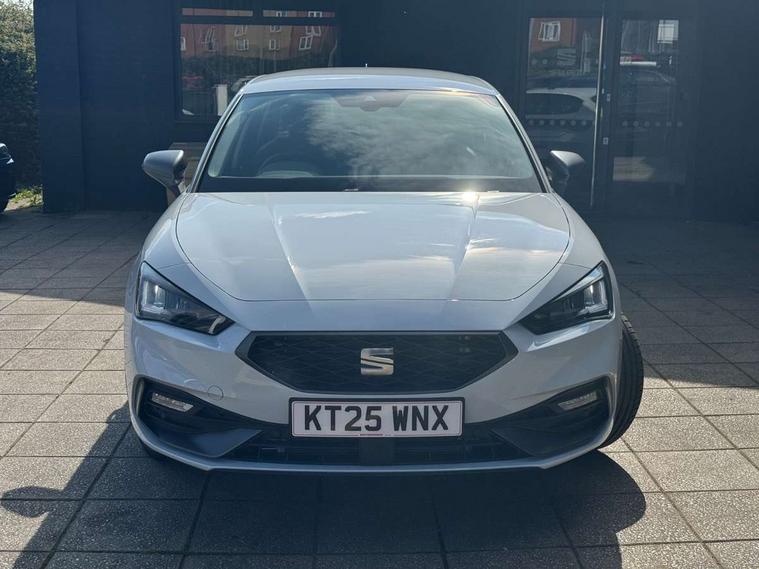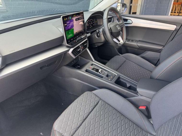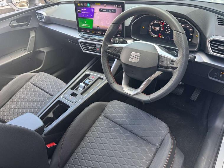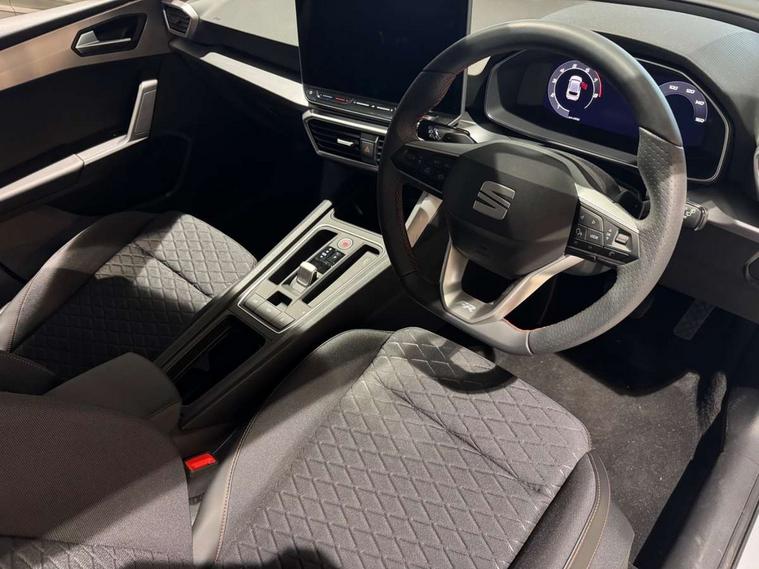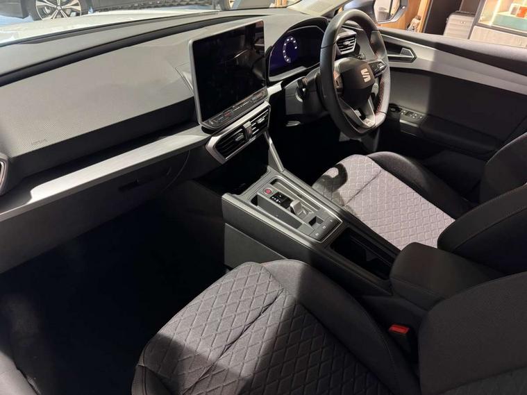 Digital cockpit with multifunction display, Driver attention alert with drowsiness warning, Dynamic road sign display, E-call, Front assist with forward collision warning braking reaction to vehicles, pedestrians and cyclists, Full link smartphone integration with Mirror Link, wireless Apple CarPlay and wired Google Android Auto, Intelligent speed assist, Lane assist, Lockable tailgate, Park assist (inc front/rear parking sensors), Power assisted speed sensitive electro-mechanical steering, Rear view camera, RPM, trip computer, outside temp gauge, instrument light brightness, low fuel warning light, lights on reminder, gearshift indicator, SEAT drive profile with 4 modes (Eco/Normal/Sport/Individual), throttle response and gearshift mode, Service interval indicator, Start/stop system with regenerative braking, 10 amp mode 2 charging cable, 16 amp mode 3 charging cable, XDS electronic differential lock and dynamic traction support, 2 front and 2 rear USB-C ports, 7 speakers, Auxiliary input socket, Auto dimming rear view mirror, Body colour door handles, Body coloured bumpers, Cosmo grey exterior mirrors with integrated LED indicators, Dark tinted rear windows, Electric front/rear windows, Electrically adjustable, heated and folding door mirrors, FR sports bumper, Illuminated front door sill, LED front fog lamps, LED headlights and infinite rear tail lights, LED rear fog lamp, Rear side wing doors, Rear wash/wipe, Separate daytime running light with automatic headlight control and coming home feature, Third brake light, Welcome light silhouette from exterior mirrors, Windshield wiper intermittent control with light/rain sensor, 12v power point in centre console, 3 seat bench in 2nd row, 60/40 split rear bench seat with armrest, Ambient lighting with glovebox, footwell and single monocolour, Driver/passenger manual seat height adjustment, Dust/pollen filter, Folding boot cover, Front and rear height adjustable headrests, Front and rear reading lights X 4, Front centre armrest, Front seatback storage pockets, Grey headlining, Height/reach adjust steering wheel, ISOFIX points in outer rear seats with top tether anchorage points, Luggage tie-down hooks, Lumbar adjustment for front seats, Single front passenger seat, Sunvisors with covered illuminated mirror, Three zone climate control, Tool kit, Two tone cloth upholstery, Media system plus with navigation - Leon, 3 point seatbelts on all rear seats, ABS, Brake control system - ESC and brake booster, Child proof door locks, Driver and front passenger airbags with front passenger airbag de-activation, front side and curtain airbags, Electronic parking brake, Extended safety system - seat belt tensioner, window closure and hazard lights, Hill hold control, Rear disc brakes, Seat belt reminder for front and rear seats, Tyre pressure monitoring system, Anti theft alarm system with interior monitoring in cab, backup horn and towing protection, KESSY Go (Keyless start), Locking wheel bolts, Wireless phone charging, Chrome interior detailing, 17" Dynamic Bi-spoke alloy wheels with 91W tyres, Emergency tyre repair kit,