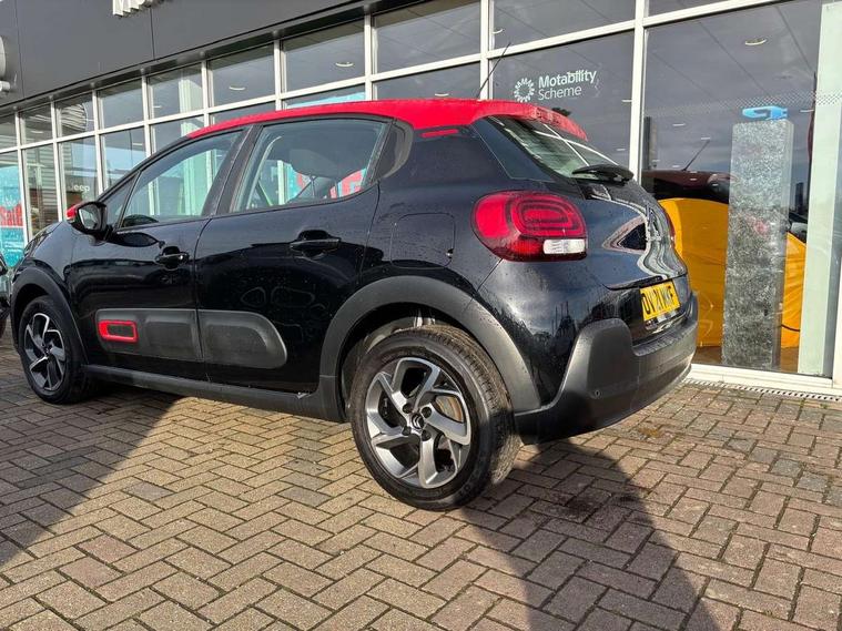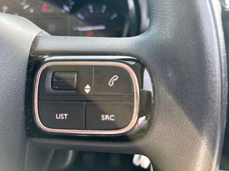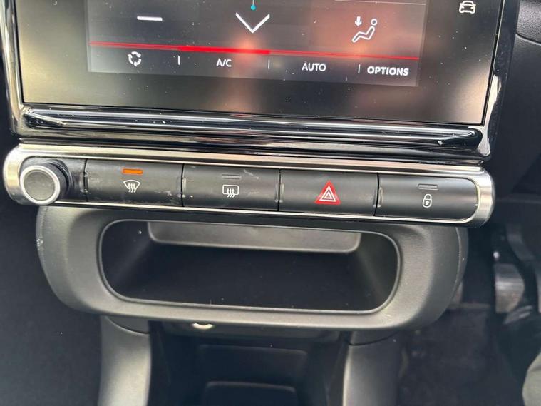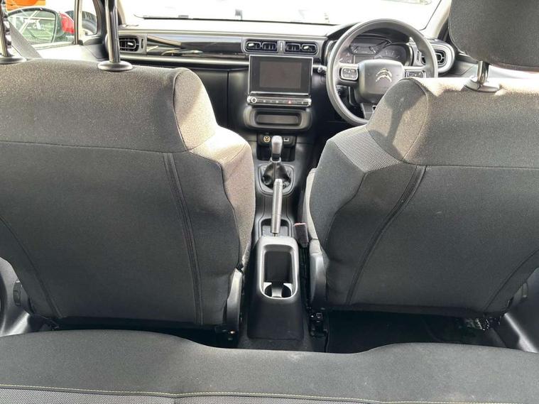 Coffee Break Alert, Cruise control + speed limiter, Exterior temperature display, Instrument cluster with white LCD and analogue gauges, Multi function trip computer, Rear parking sensors, Variable assistance power steering, USB connection, 3D rear light signature, Automatic activation of hazard warning lights, Body colour bumpers, Body colour door handles, Chrome decoration on front face, under chevrons and around daytime running lights, Citroen illuminated signature in LED headlights and LED daytime running lights, Electric folding and heated door mirrors, Electric front windows with one touch/anti-pinch, Fog lights integrated into front bumper, LED Headlights, Manual rear windows, Matt black finish B pillar, Rear windscreen wiper with intermittent mode linked to vehicle speed and automatic activation when reverse gear selected, Roof colour rear view mirror caps, Standard day night switchable interior rear view mirror, Tinted side windows, 1/3 to 2/3 split folding rear seat, 12V socket, Automatic air conditioning, Driver and passenger's sun visor with courtesy mirror, Driver's seat height adjustment, Fixing boot light, Front lighting panel with map reading lights, Front seats adjustable with forward back slide and adjustable backrest, Height adjustable front head restraints, Height/reach adjust steering wheel, ISOFIX mounting on outer rear seats with top tether and labels indicating fixing points, Mica cloth upholstery, Parcel shelf, Seatbelt unfastened on the move audible and visual alert for front and rear seats, Soft touch gear lever with leather effect gaiter and overstitching, Storage space under touchscreen with rubber mat, Three rear seats with head restraints, Upholstered armrest in front and rear doors, Safety pack 1 - C3, Visibility pack with automatic lights - C3, ABS with Electronic brakeforce distribution and Emergency braking assistance, Driver and front passenger seatbelts with pyrotechnic pretensioners and force limiters, Driver's airbag, Electric child locks, ESP with anti skid system, Front passenger airbag, Front passenger airbag deactivation, Front side airbags + front/rear curtain airbags, Hill start assist, Manual parking brake with chrome finish button, Mono-tone horn, Three rear three point seatbelts with outer seats have pretensioners and force limiters, Tyre pressure monitoring system, Anti theft alarm, Automatic door and boot locking when moving off with automatic unlocking in case of impact, Central locking with locked indicator and interior one touch lock button, Immobiliser, Remote control central locking with two plip keys, Gloss black dashboard finish with grey surround, 16" Hellix diamond black alloy wheels, Tyre puncture repair kit,